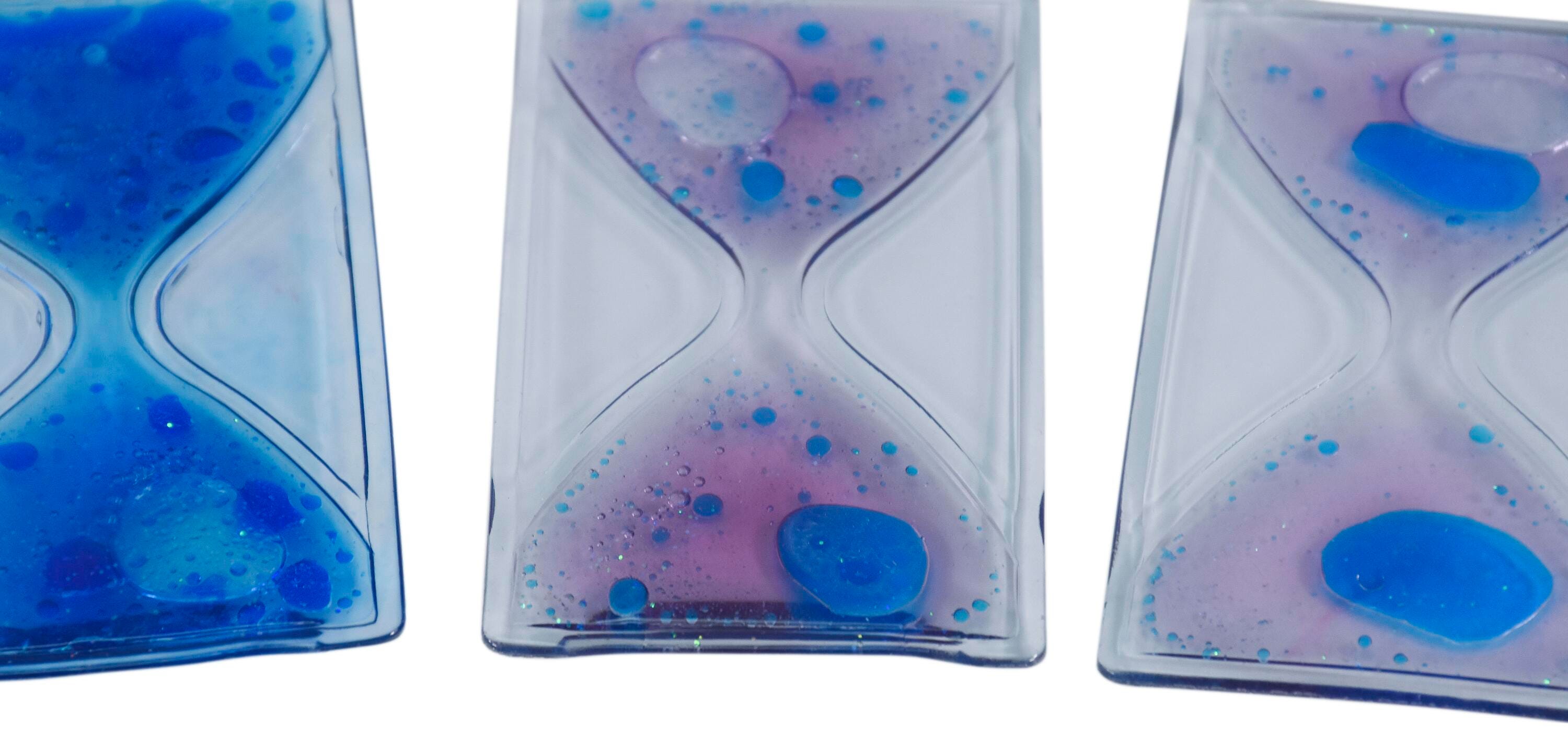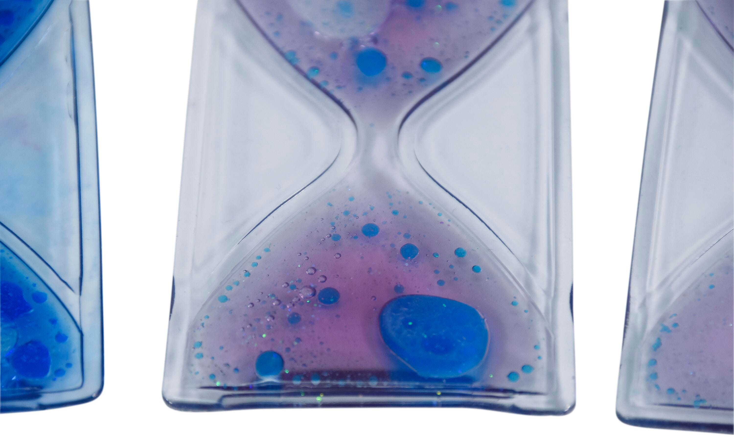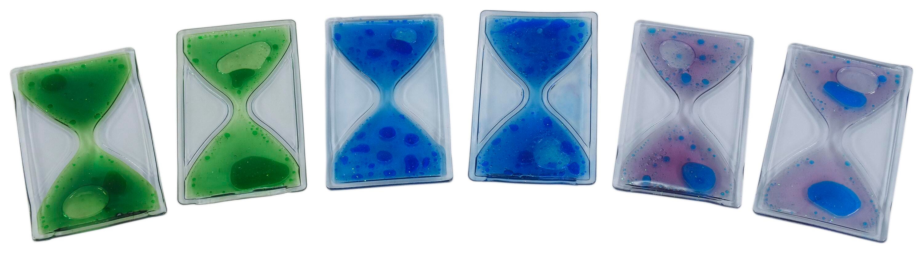 The Abilitations Mini-Timer Gel Fidgets are hourglass-shaped fidgets filled with a colorful non-toxic gelatinous fluid and glitter. Squeezing or pressing on one side sends the glitter through the narrow channel to the other side. Latex free and filled with a non-toxic mineral oil fluid. Measures 2-1/4 x 3-7/8 inches.