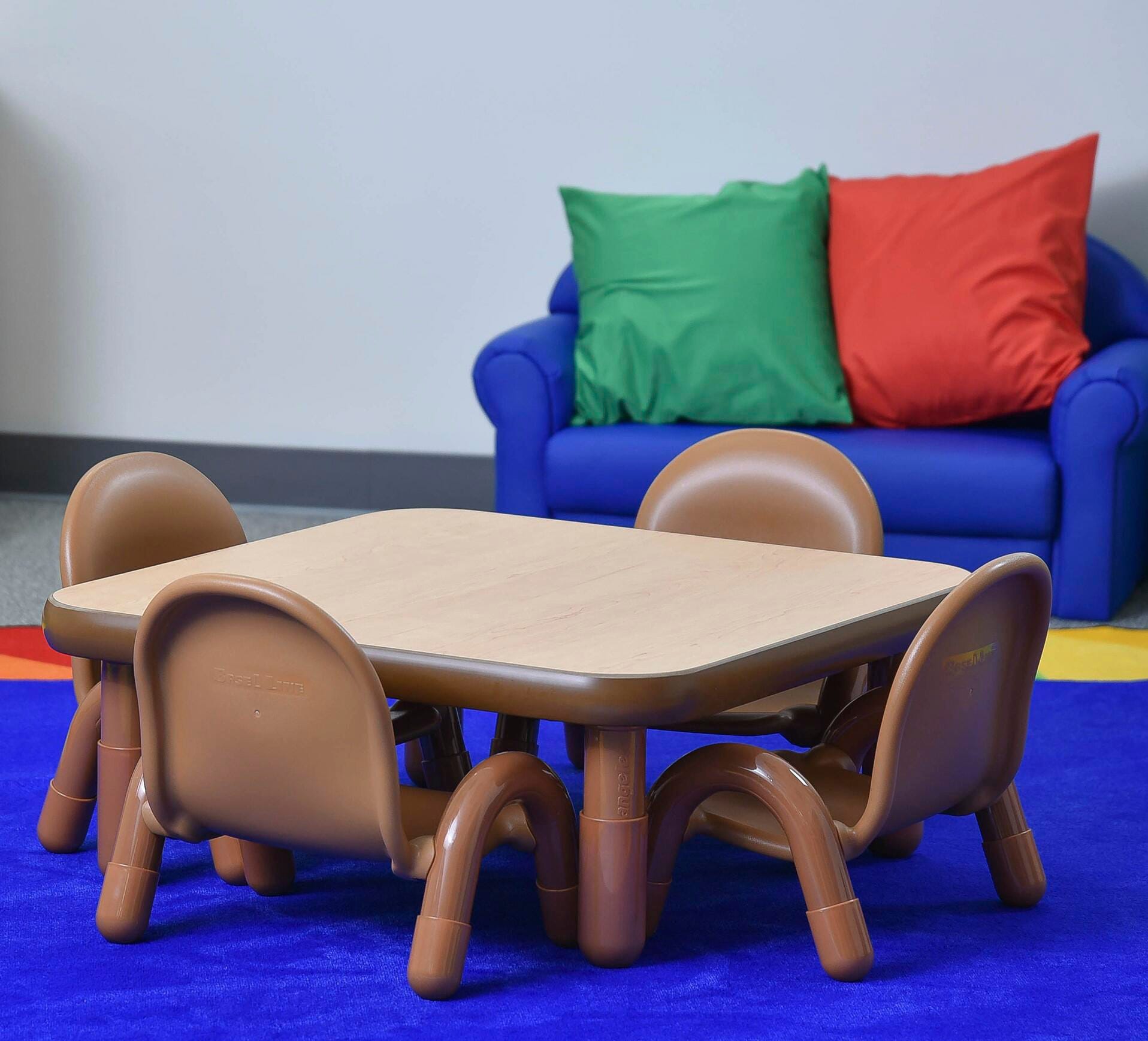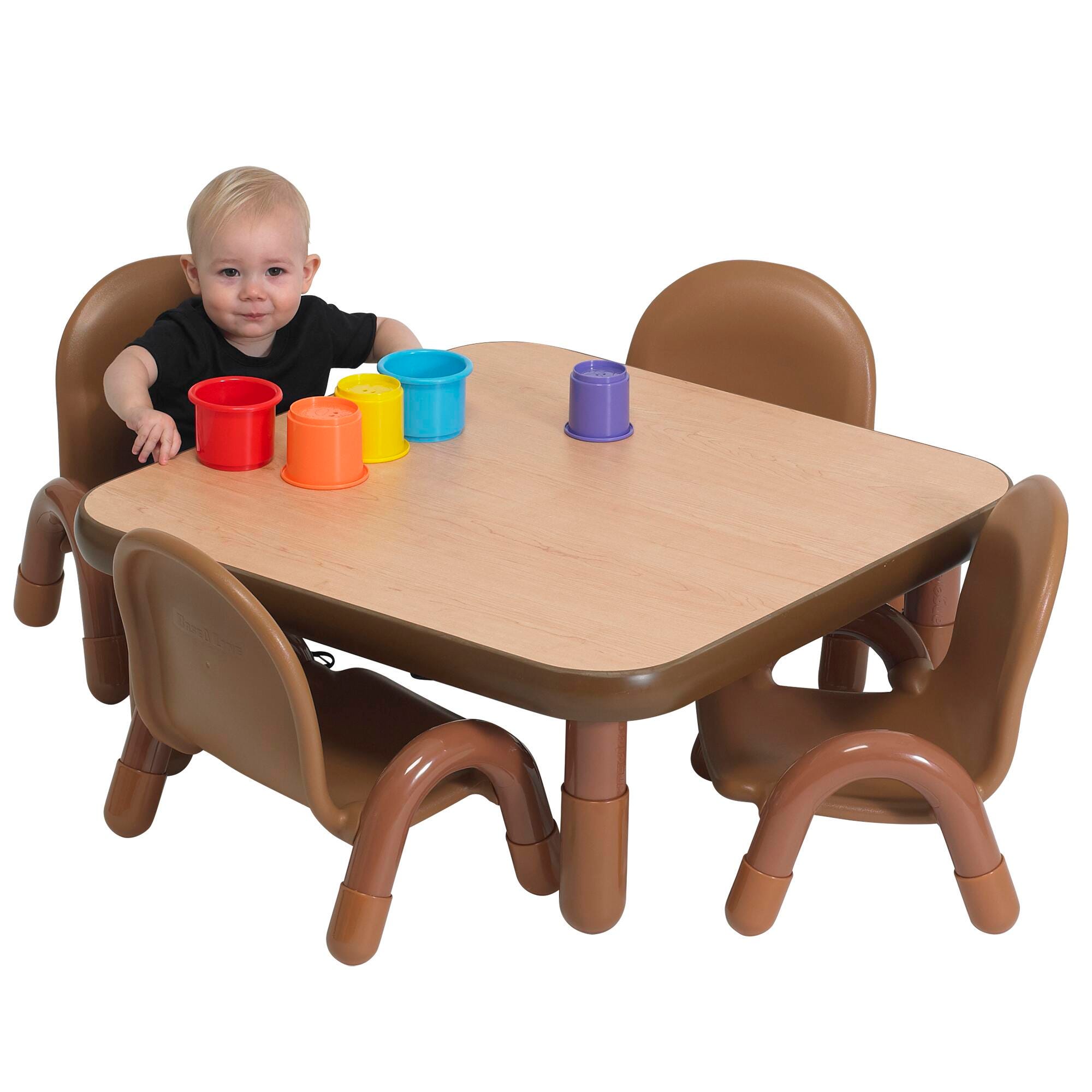 Angeles BaseLine Toddler Table and Chair Set includes 30 W x 30 D x 12 H inches natural, square table and four 5 inch high chairs, each in carmel brown.