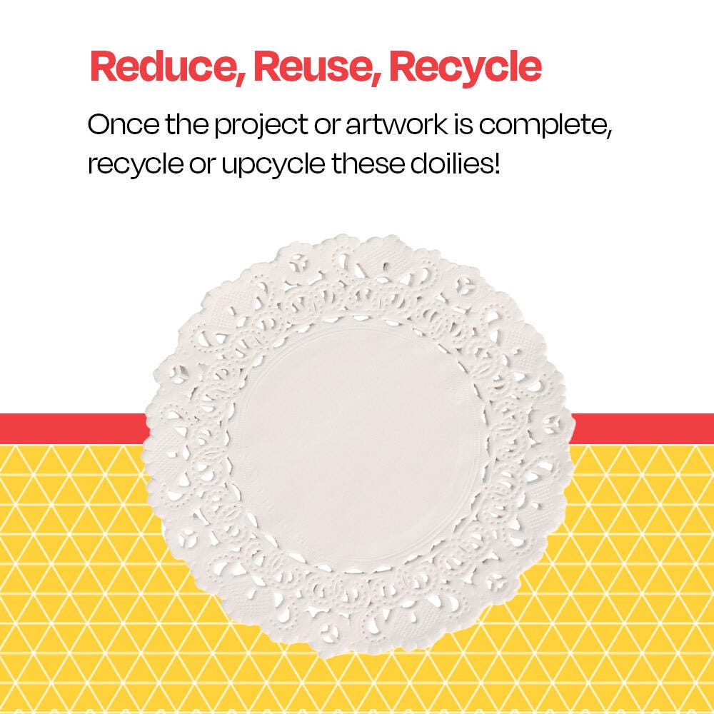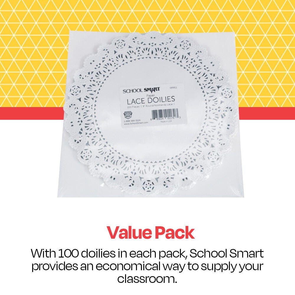 The Round Paper Lace Doily from School Smart measures 8 inches. The doilies feature an intricate die-cut lace construction that offers a classic and reusable piece of design at an incredible value. Great for adding charm to arts and crafts, greeting cards, home decorating, and more. Sold as a pack of 100.