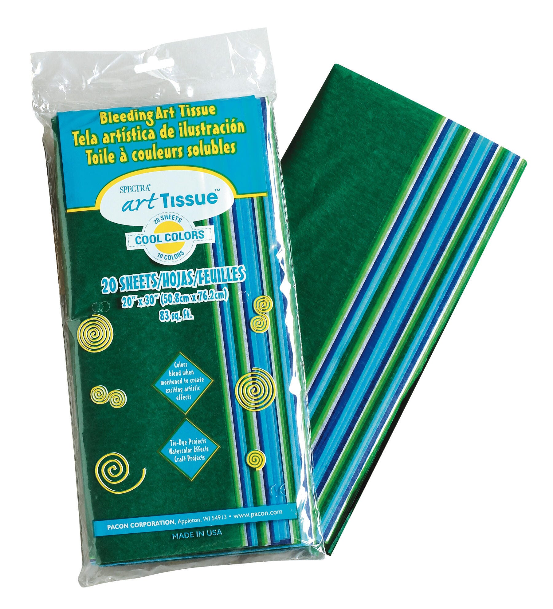 Spectra Deluxe Bleeding Art Tissue Paper Assortment contains tissues in 10 cool colors measuring 20 x 30 inches and are rated outstanding by creative teachers and artists. Colors blend to create exciting artistic effects when moistened. This assortment offers a wide range of rich, vibrant colors that are useful for many art projects. Tissue is sold as 20 per pack.