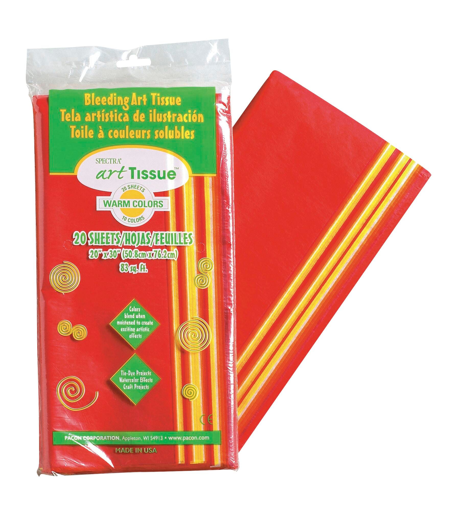 Spectra Deluxe Bleeding Art Tissue Paper Assortment contains tissues in 10 warm colors measuring 20 x 30 inches and are rated outstanding by creative teachers and artists. Colors blend to create exciting artistic effects when moistened. This assortment offers a wide range of rich, vibrant colors that are useful for many art projects. Tissue is sold as 20 per pack.