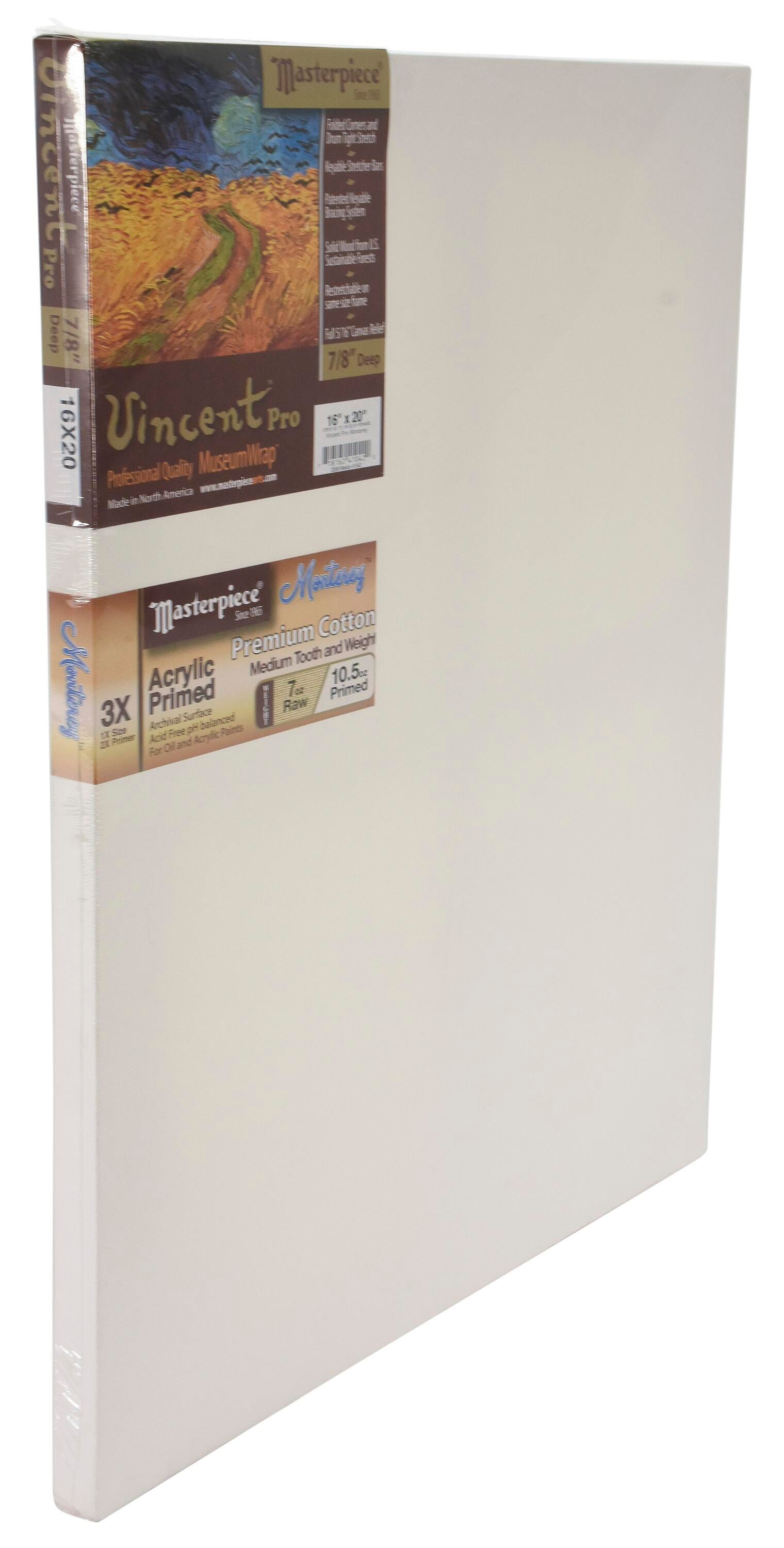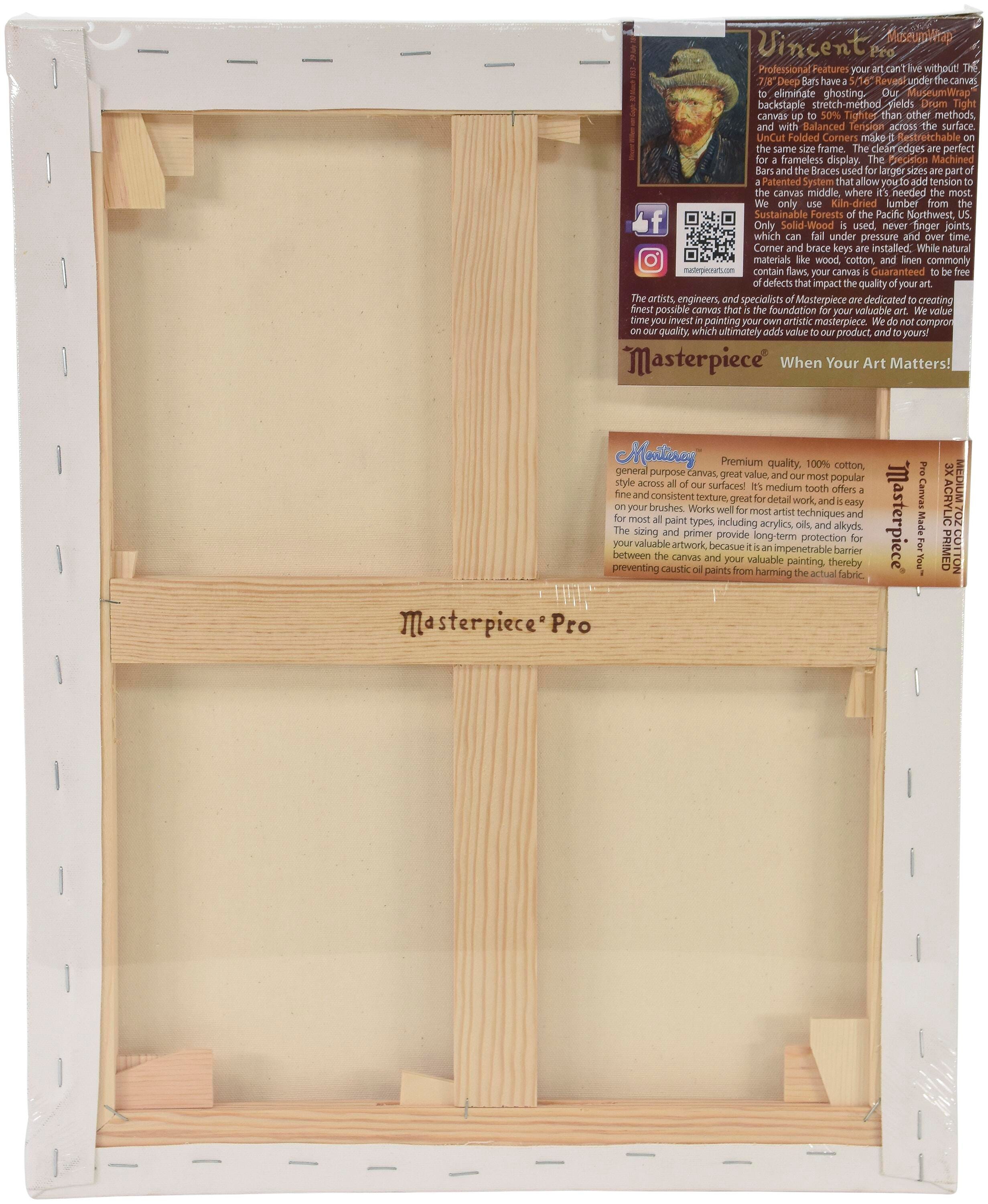 Masterpiece Vincent MasterWrap Stretched Canvas measuring 16 in x 20 in features a tongue and groove brace system. Three times acrylic-primed canvas has clean staple-free edges perfect for a frameless display and can be re-stretched using the same size frame with the help of folded, uncut corners. Precision machined, kiln-dried keyable bars are milled and the back-staple stretching method offers balanced tension across the canvas surface. Stretcher bar with 7/8 in depth yields a full 5/16 in relief to the canvas, avoiding brush strokes from creating impressions.