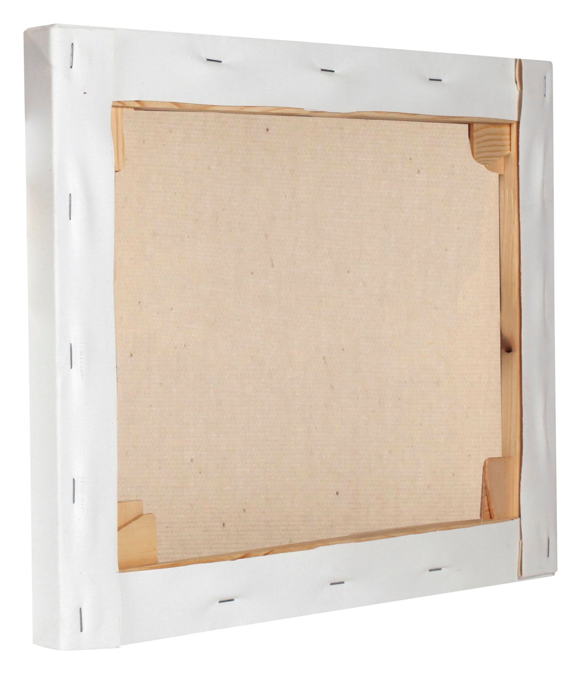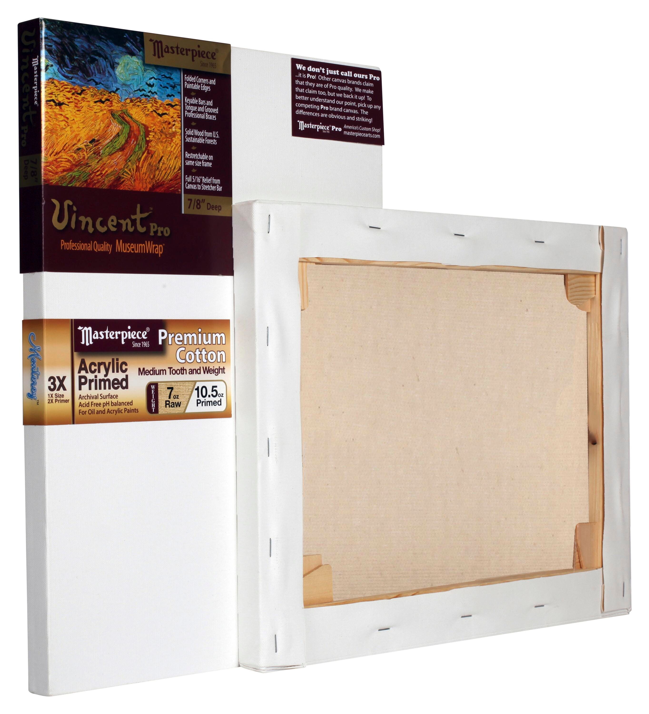 Masterpiece Vincent MasterWrap Stretched Canvas measuring 8 in x 10 in features a tongue and groove brace system. Three times acrylic-primed canvas has clean staple-free edges perfect for a frameless display and can be re-stretched using the same size frame with the help of folded, uncut corners. Precision machined, kiln-dried keyable bars are milled and the back-staple stretching method offers balanced tension across the canvas surface. Stretcher bar with 7/8 in depth yields a full 5/16 in relief to the canvas, avoiding brush strokes from creating impressions.