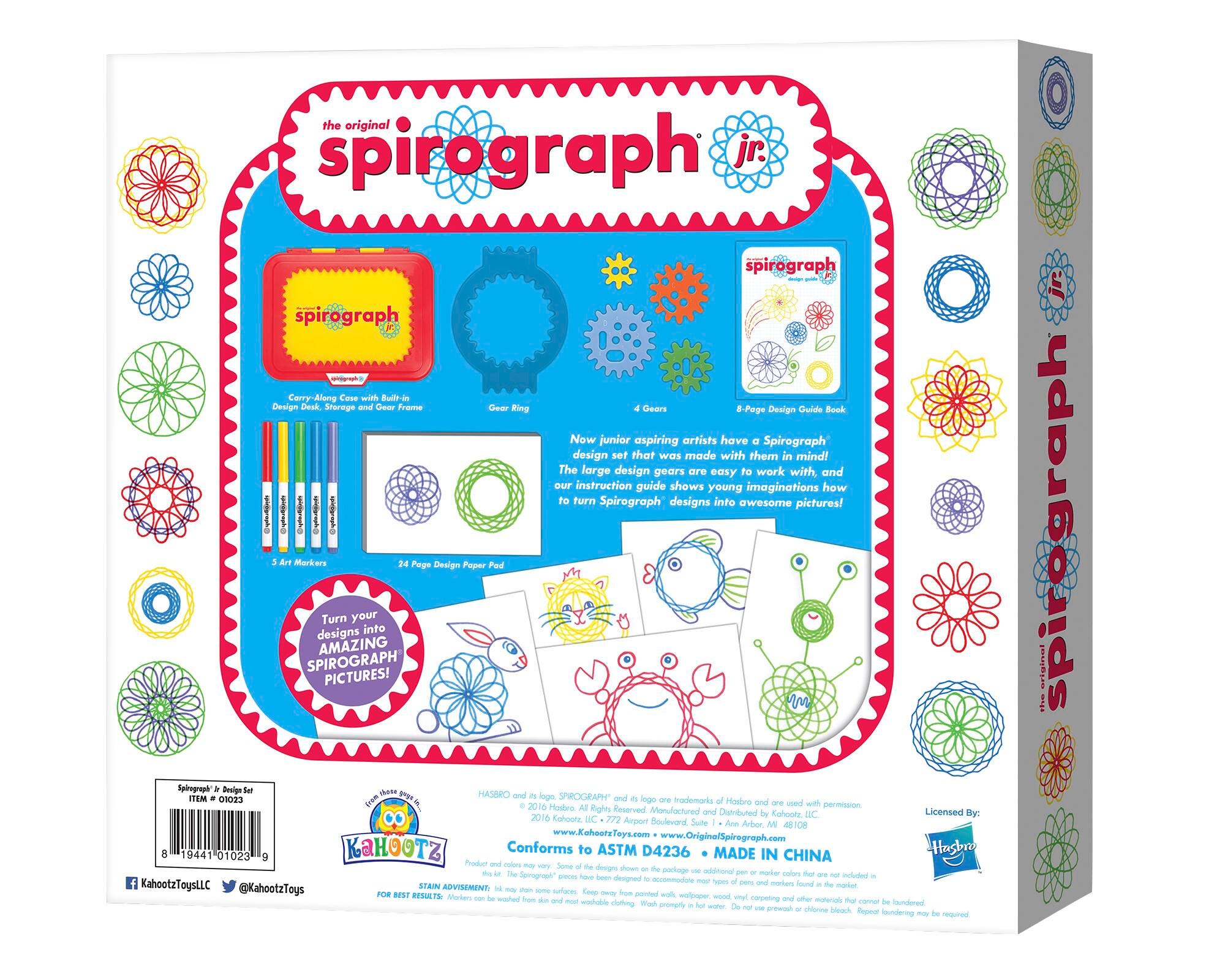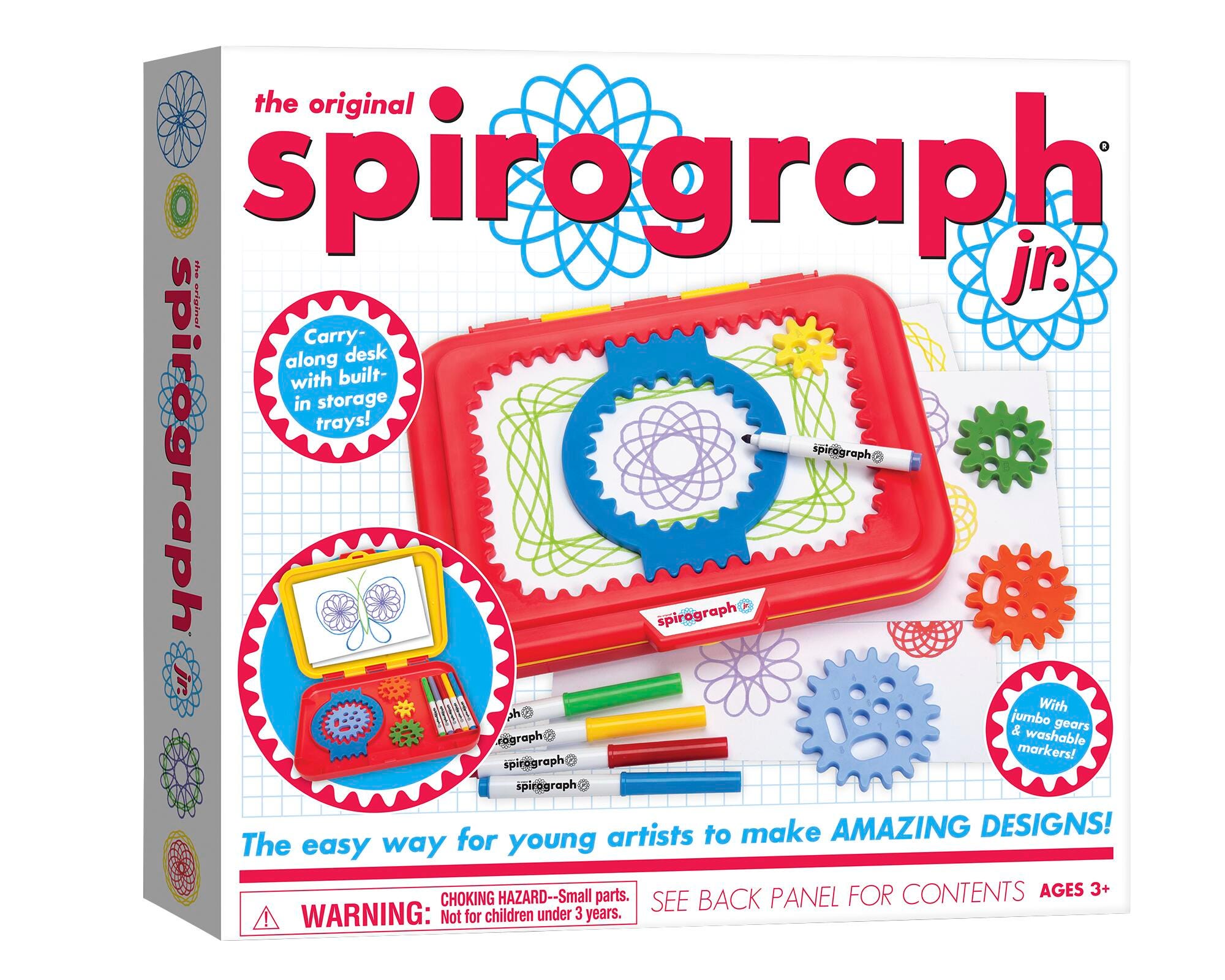 Now even the youngest creative minds can make amazing designs with the Spirograph Jr. design set. Jumbo-sized pieces make creating Spirograph art fun and easy for little hands, and an easy-to-carry drawing tablet doubles as a work station and handy storage case to keep everything neat.Features