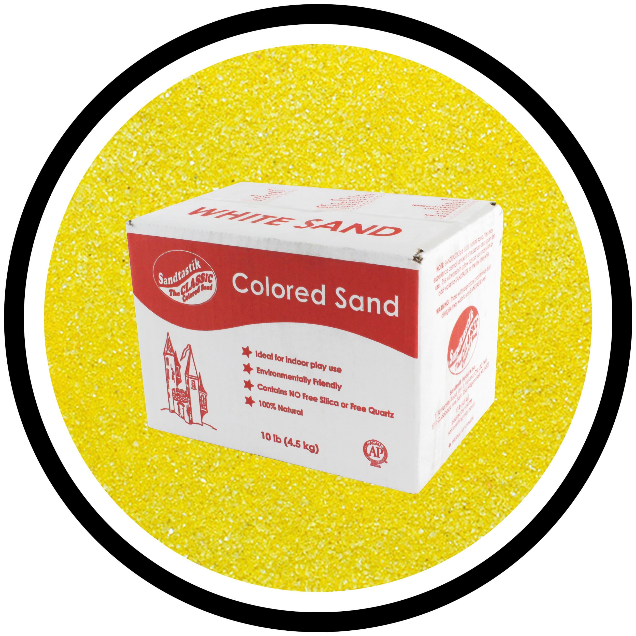 Sandtastik offers an inspiring spectrum of classic bright and light sand colors to accessorize all craft, decor and professional endeavors. This colorful sand is deal for card making, texturing art, model scenery, jewelry, sand and sensory tables, sand art and more. It is sold as a 10 pound box of yellow sand.