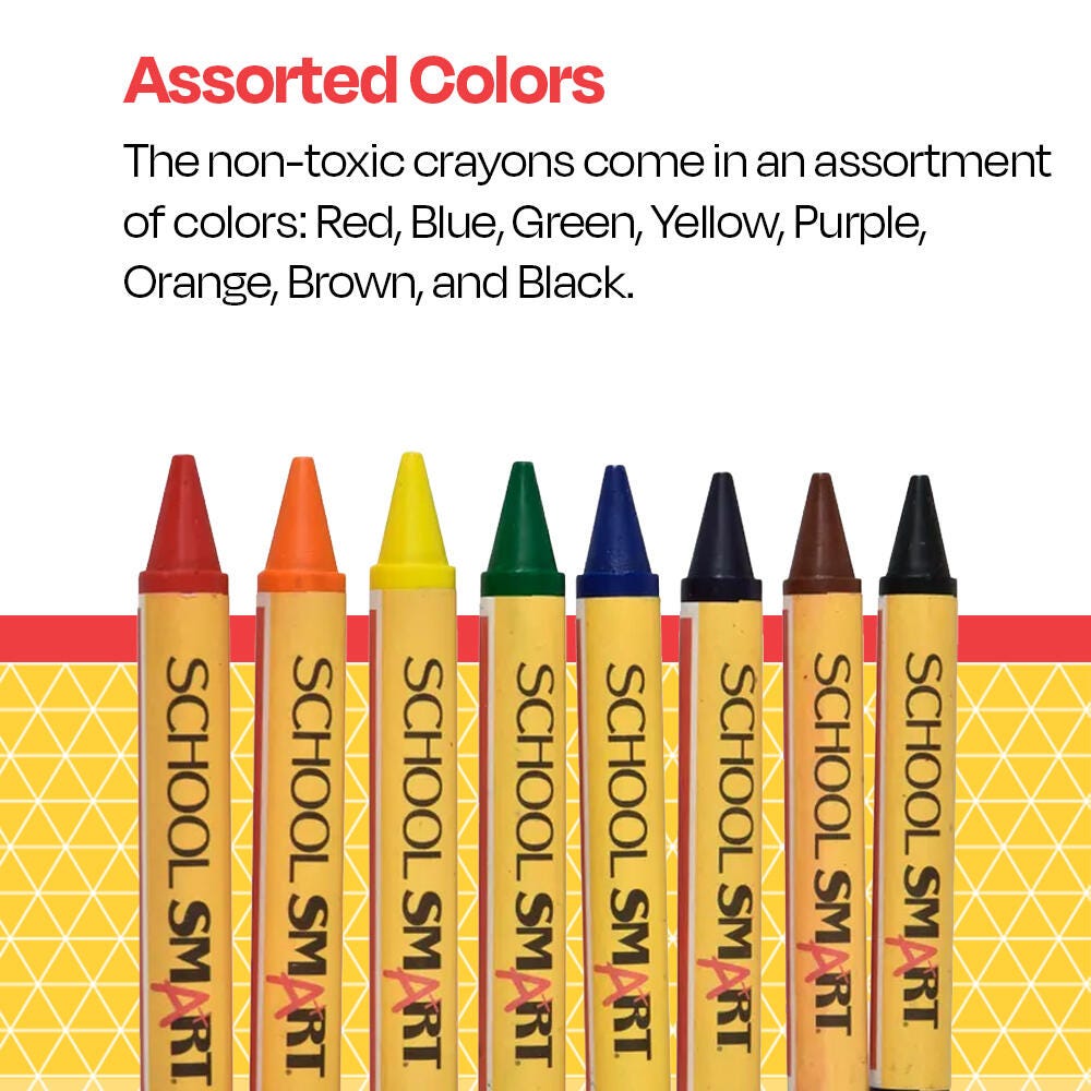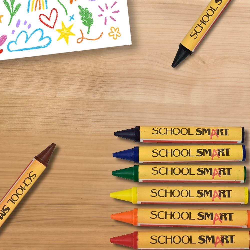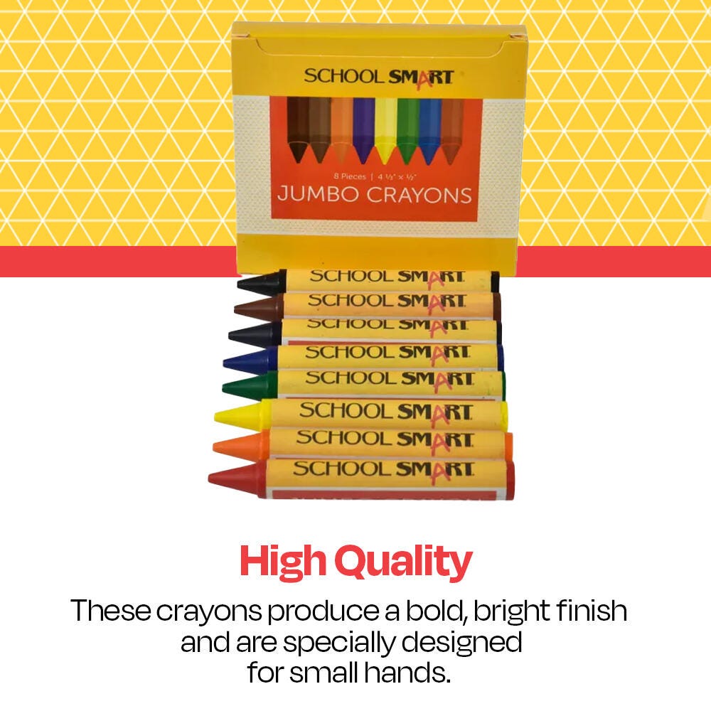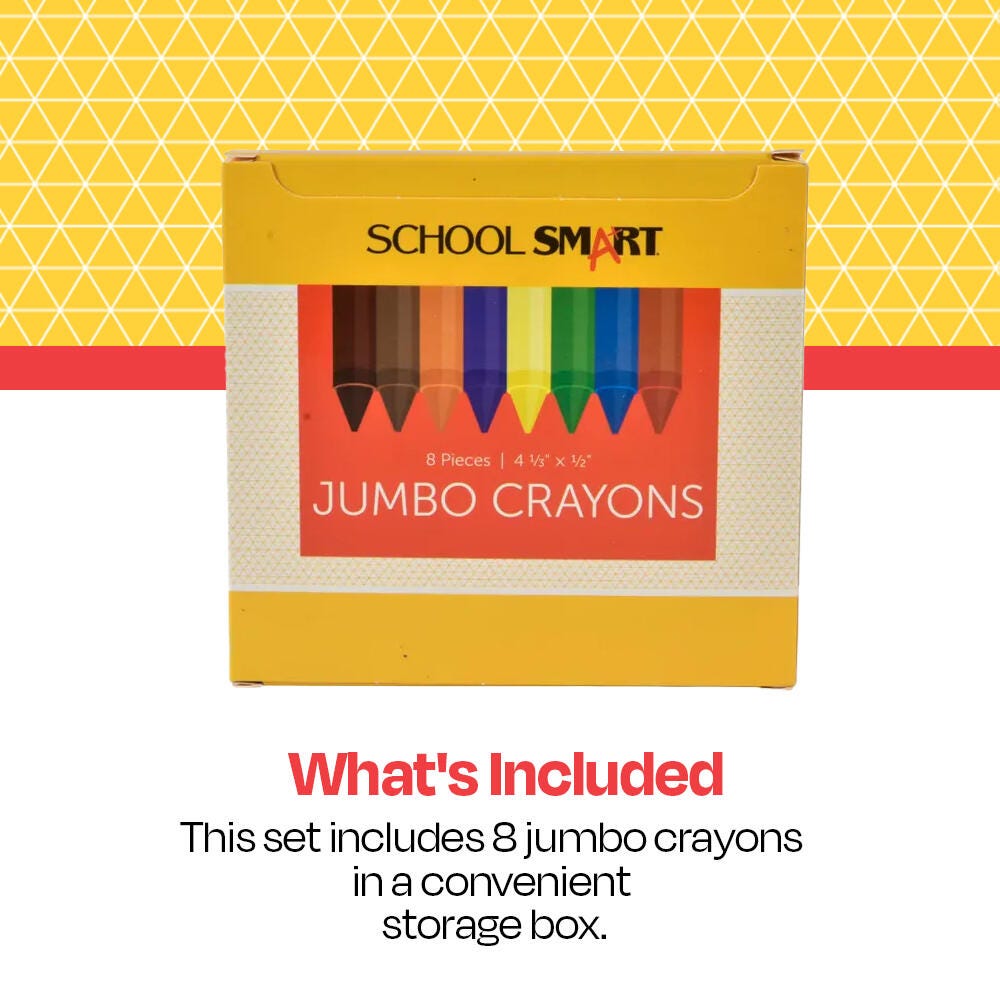 Description School Smart jumbo crayons are easy to hold and fun to use for kids. Featuring 8 vibrant colors, the chunky crayon size is perfect for small hands and less likely to break. Our high-quality wax crayons have vivid color pigments that spread smoothly and consistently without crumbling. These crayons are ideal for childcare centers, schools, and after schools centers.Features The colors of these big crayons include red, blue, green, yellow, violet, orange, brown, and black This set of 8 fat crayons comes in classic assorted colors with a reusable paper box with tuck flap, providing the basics for preschools, childcare centers, and homes Jumbo specialty crayons are easier to grip and resistant to cracks or breaks Ideal for young kids; toddlers can use the chunky crayons for coloring books, free-form drawing and doodling, and other arts and crafts AP non-toxic Includes: 8 Chunky Crayons, Assorted Colors