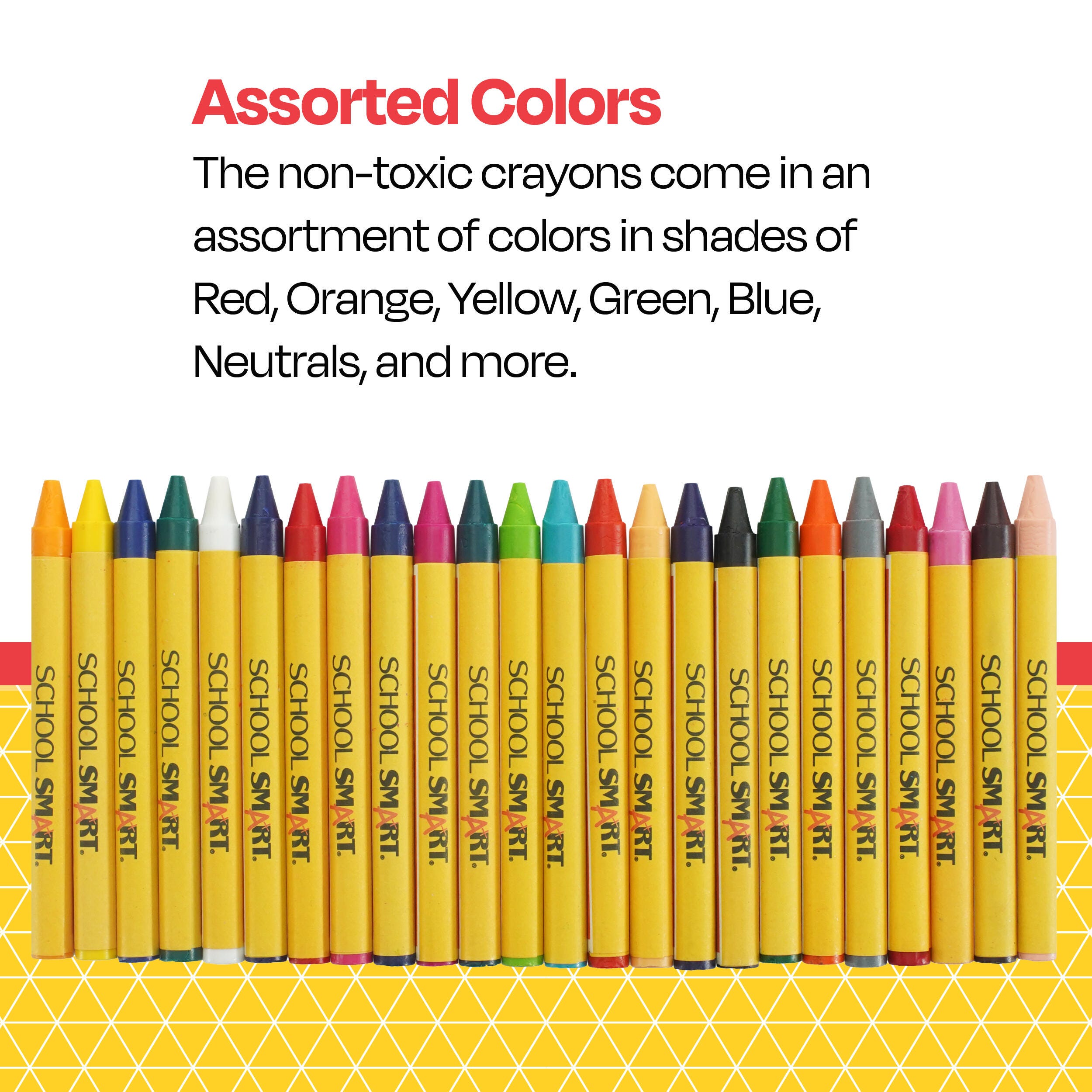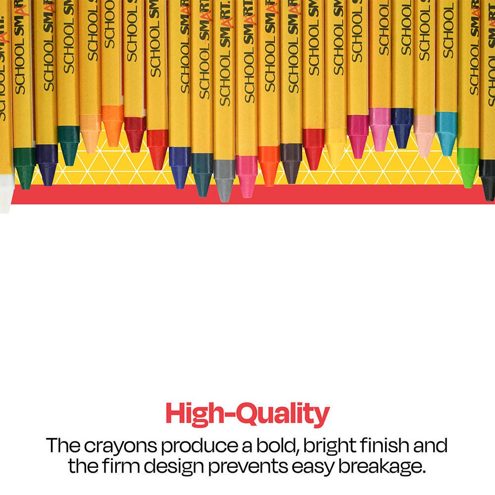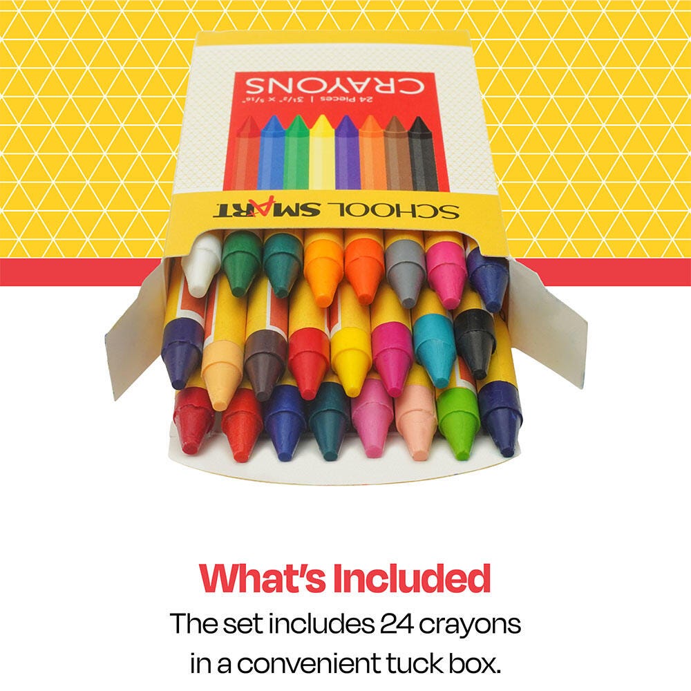Description School Smart regular crayons come in a standard box size, and each crayon measures 3 1/2 L x 5/16 D inches. These crayons can create narrow lines or broad coverage for drawing and coloring. These high-quality classroom crayons feature intense pigments to provide a bright finish. The crayon box contains 24 crayons, 1 each in the colors of red, blue, green, yellow, violet, orange, brown, black, red orange, pink, red violet, white, blue green, blue violet, yellow orange, yellow green, dark red, magenta, dark blue, turquoise blue, light blue, dark yellow orange, peach, and gray.Features Great for coloring, drawing, art projects, school assignments, and more in school or at home Regular size crayons are comfortable for all ages, including elementary, middle, and high school students Convenient tuck box provides easy storage and organization AP certified and nontoxic for safe use in any setting Delivers quality and value at an affordable price