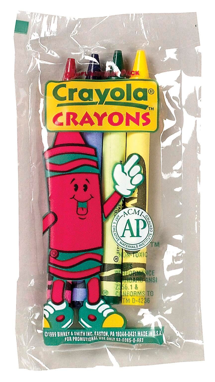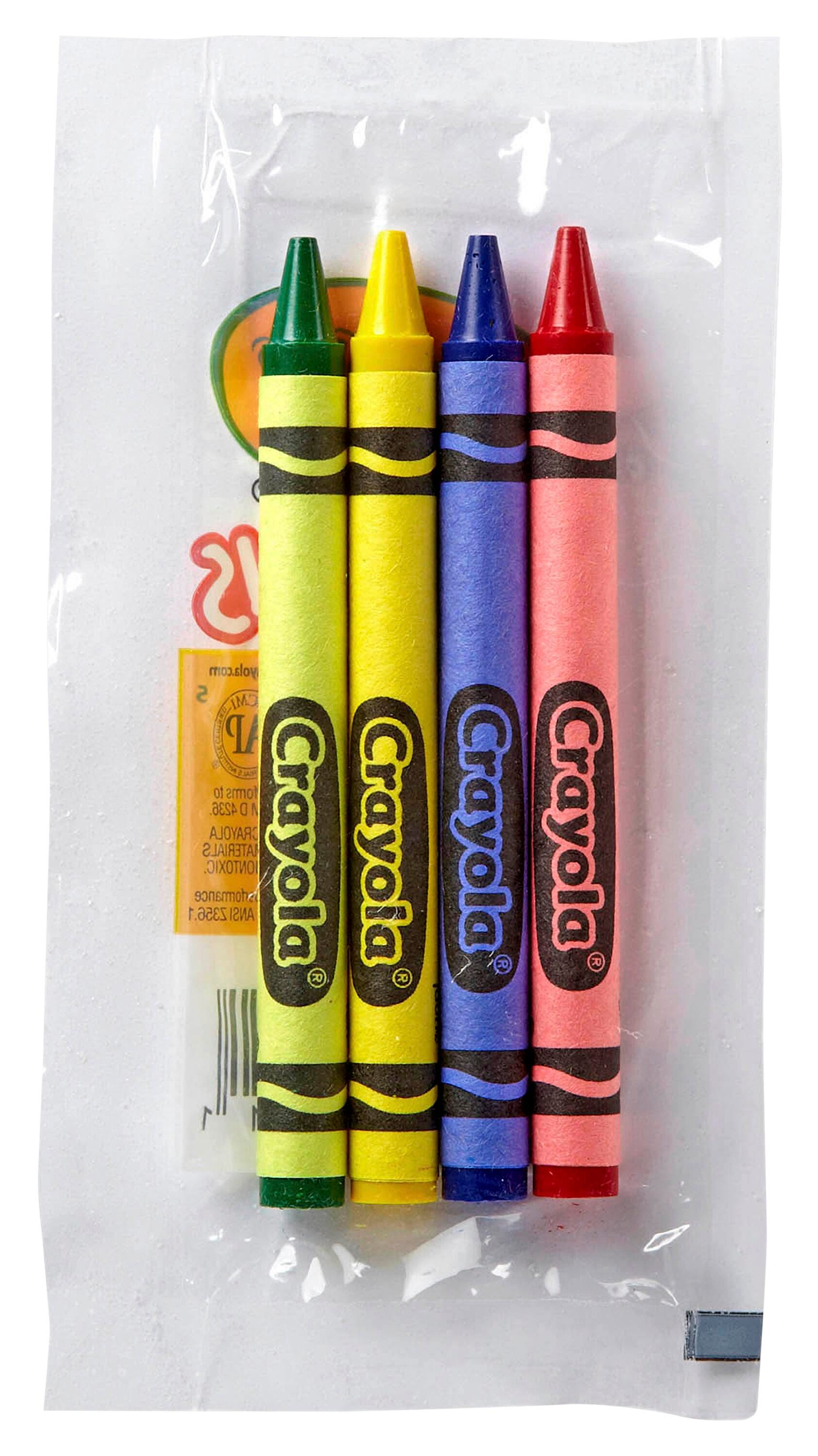 Cellophane-wrapped crayons come in convenient packs of 4 for easy handout and tear-open