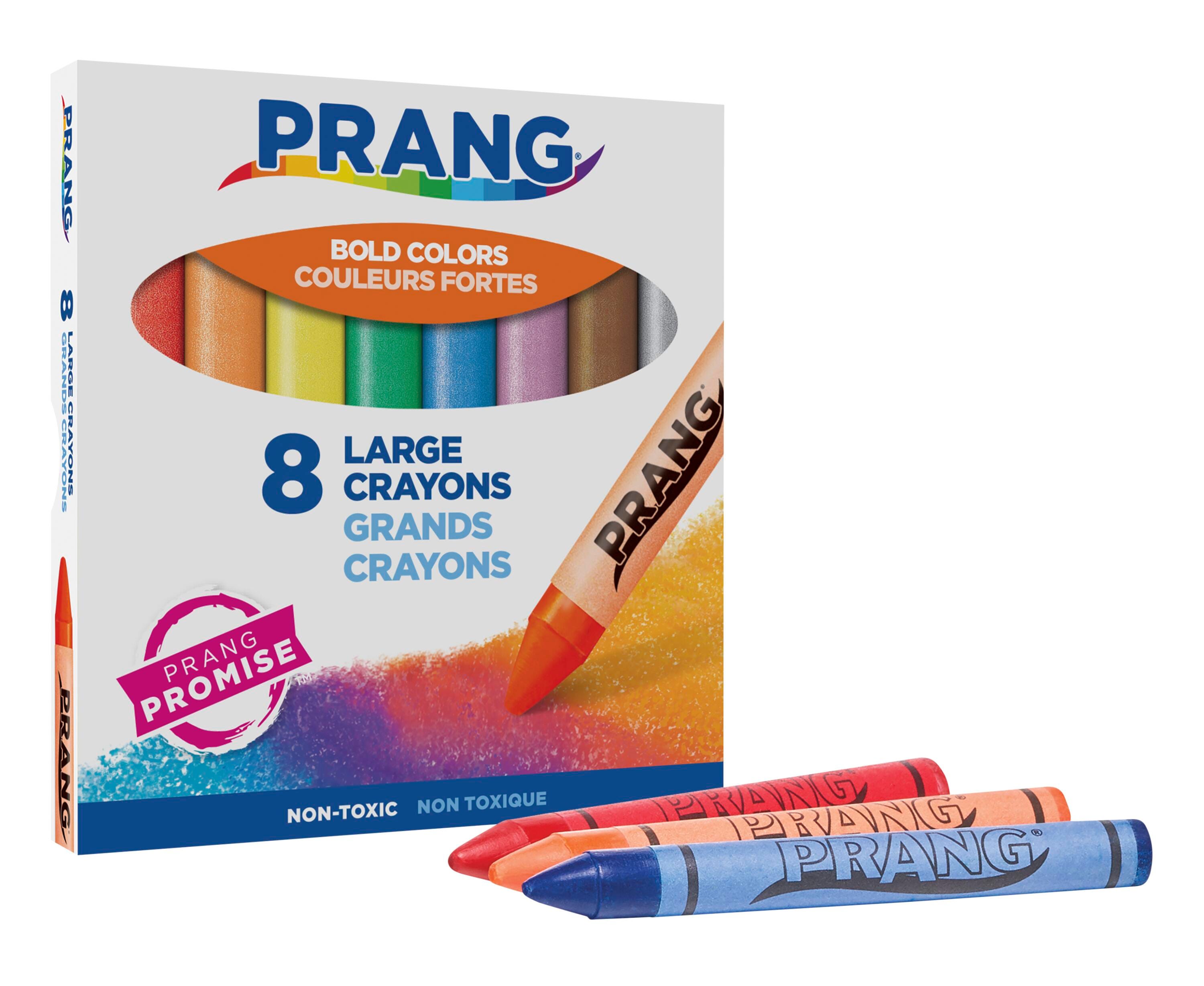 Description Prang Size Large Molded Crayon Set of 8 colors are Non-Toxic measuring 3-1/2 in x 5/16 in comes in lift lid box, is user friendly and mainly used by younger students.
