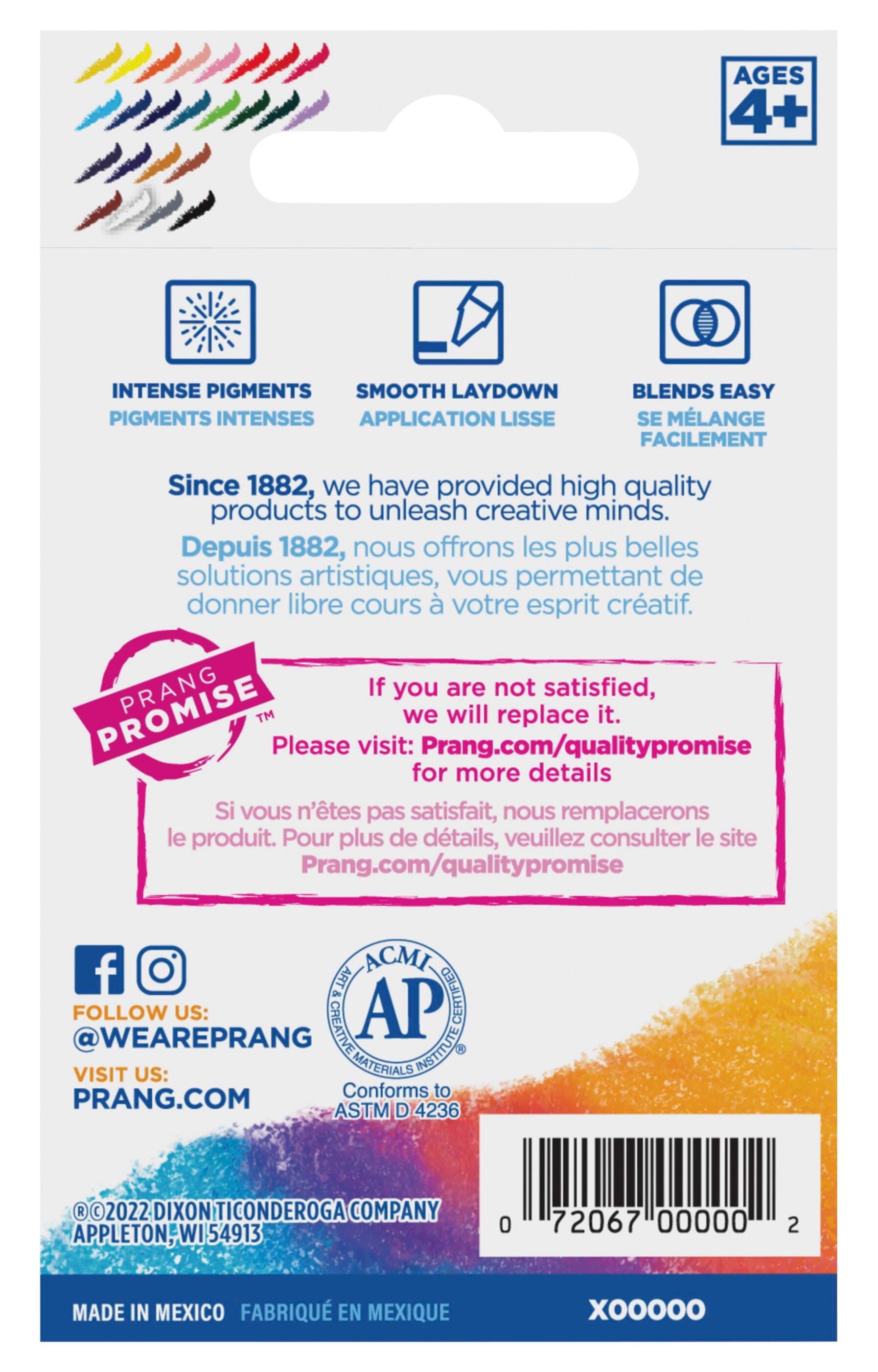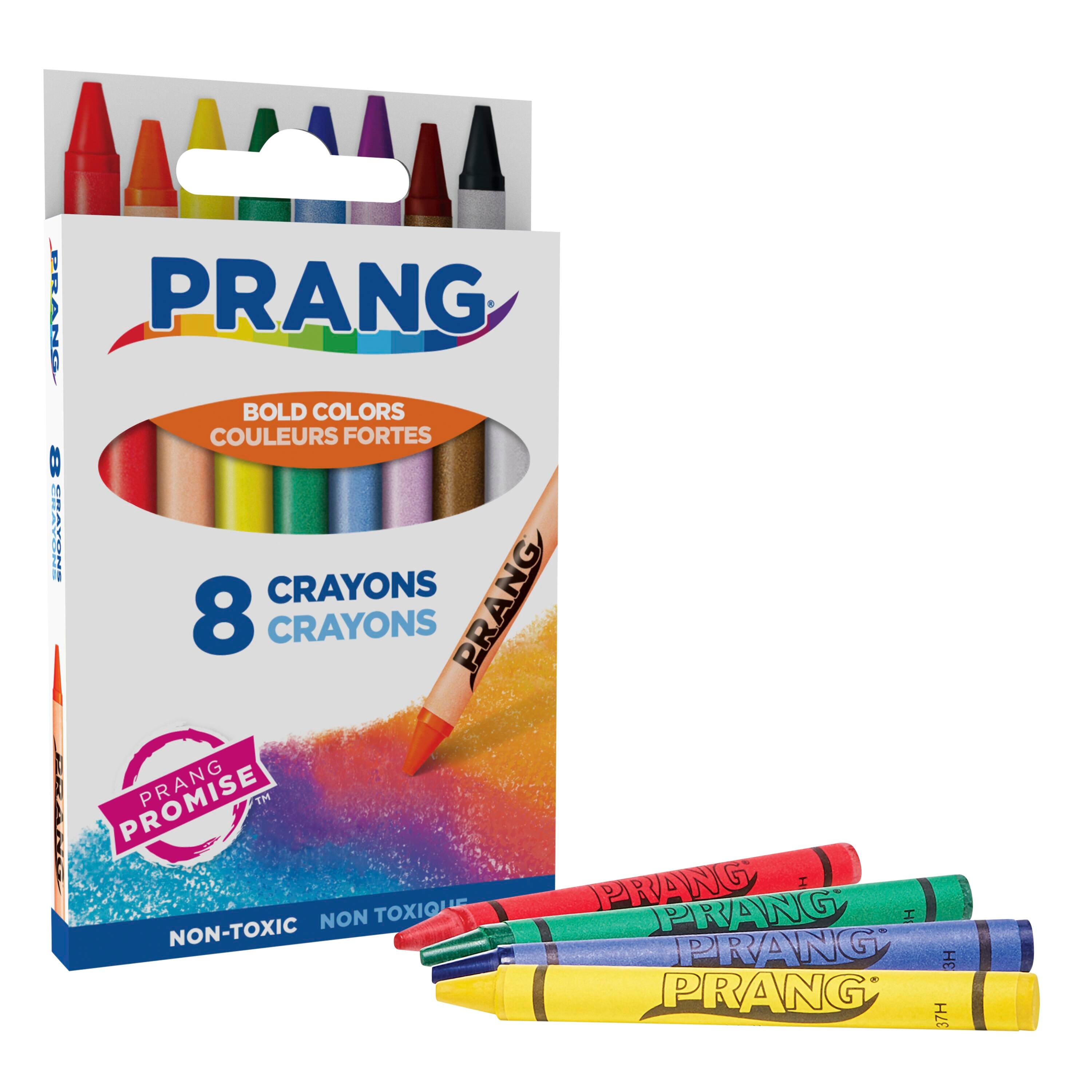 Description Prang Molded Crayon Set of 8 colors are free from paraffin and wax and are made from 100% renewable resources with a unique soybean oil formulation. Non-Toxic colors are assorted and has brilliant hues, delicate shades and subtle blends. Colors are intense and opaque and are brighter and smoother than ordinary wax crayons.Prang Crayon Box Set of 8 Includes: Red Orange Yellow Green Blue Purple Brown Black
