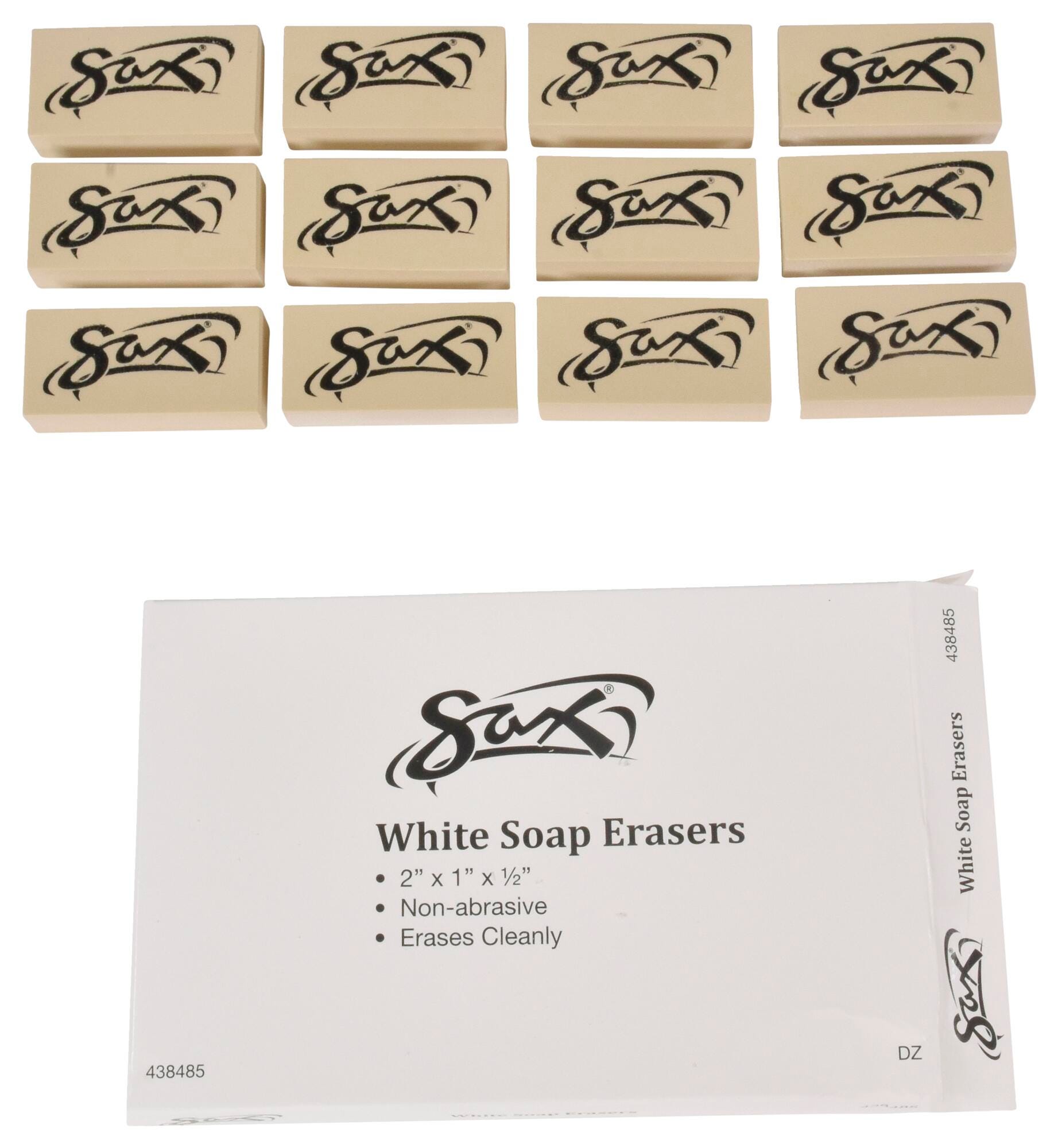 Sax non-abrasive soap erasers gently and completely remove pencil marks from all paper types. The block-like shapes are easy and comfortable to grip and hold for better control while erasing. Soap erasers act like gum erasers but have the addition of a very mild abrasive for extra clean-erase effectiveness of charcoal and pencil marks. Turn to these erasers to help protect your best projects. In addition, these artist erasers can be made into stamps by carving.
