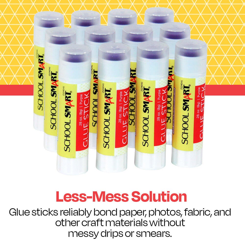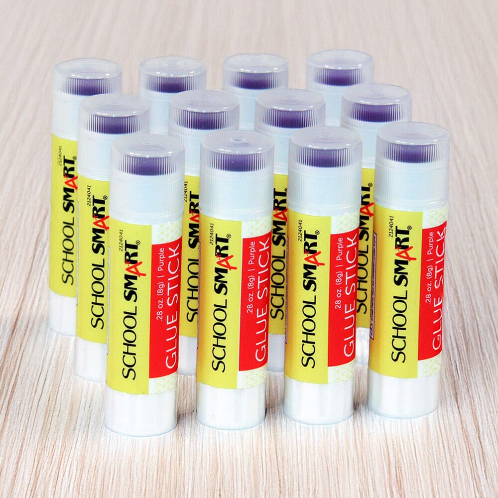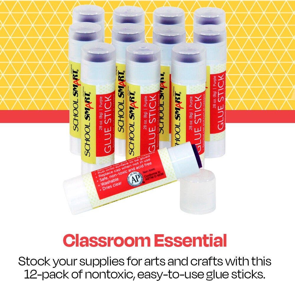 This pack of quality glue sticks from School Smart offers simple bonding for beginners or experienced crafters! They have a screw and twist-up applicator to bond desired pieces such as paper, photos, fabric, cardboard, and more. The purple glue conveniently applies purple and dries to a clear, non-visible translucent color. It is nontoxic, acid-free, gluten-free, photo-safe, and has a long shelf life that lasts up to 2 years. Not recommended for children under 3 years old. Sold as a pack of 12. AP certified by ACMI.