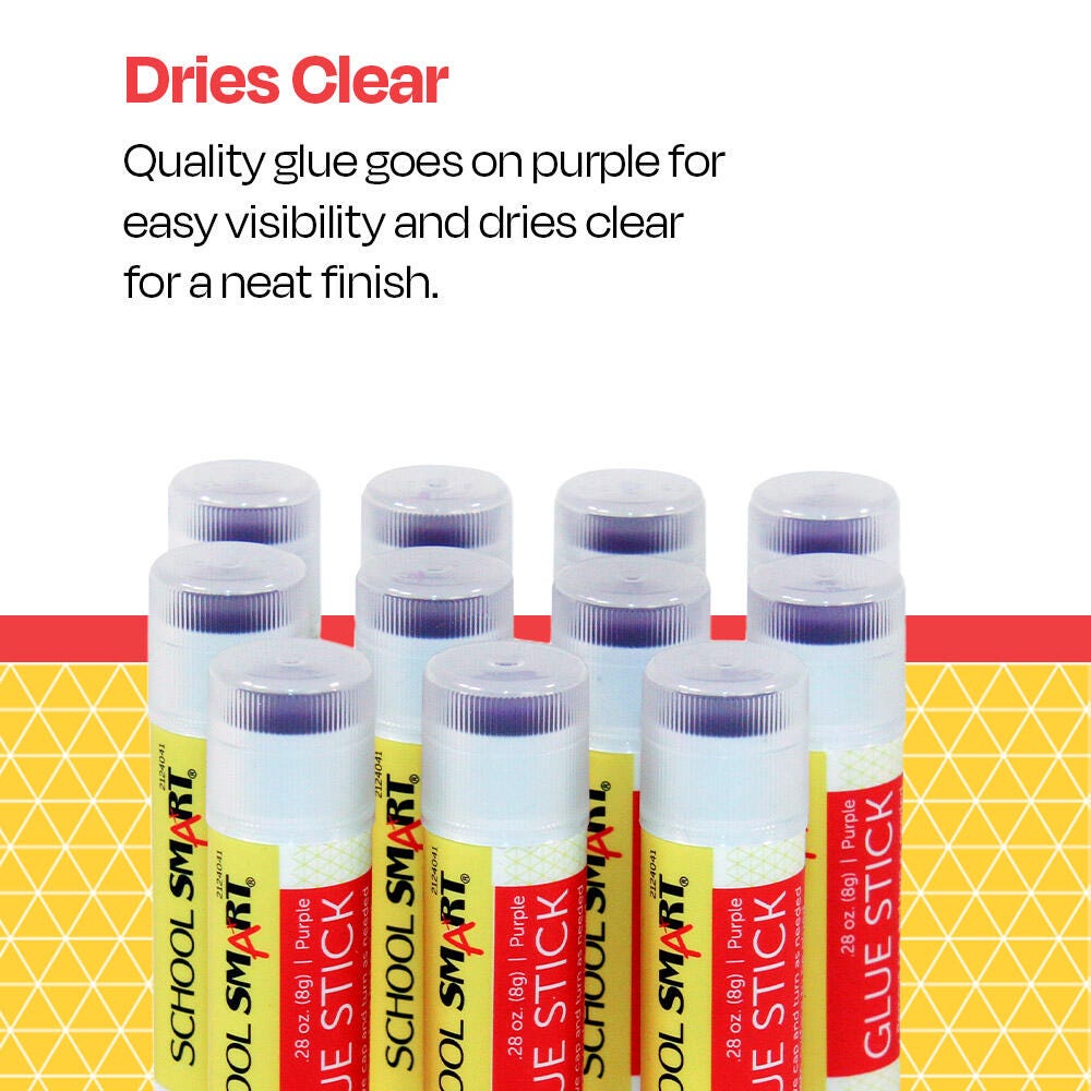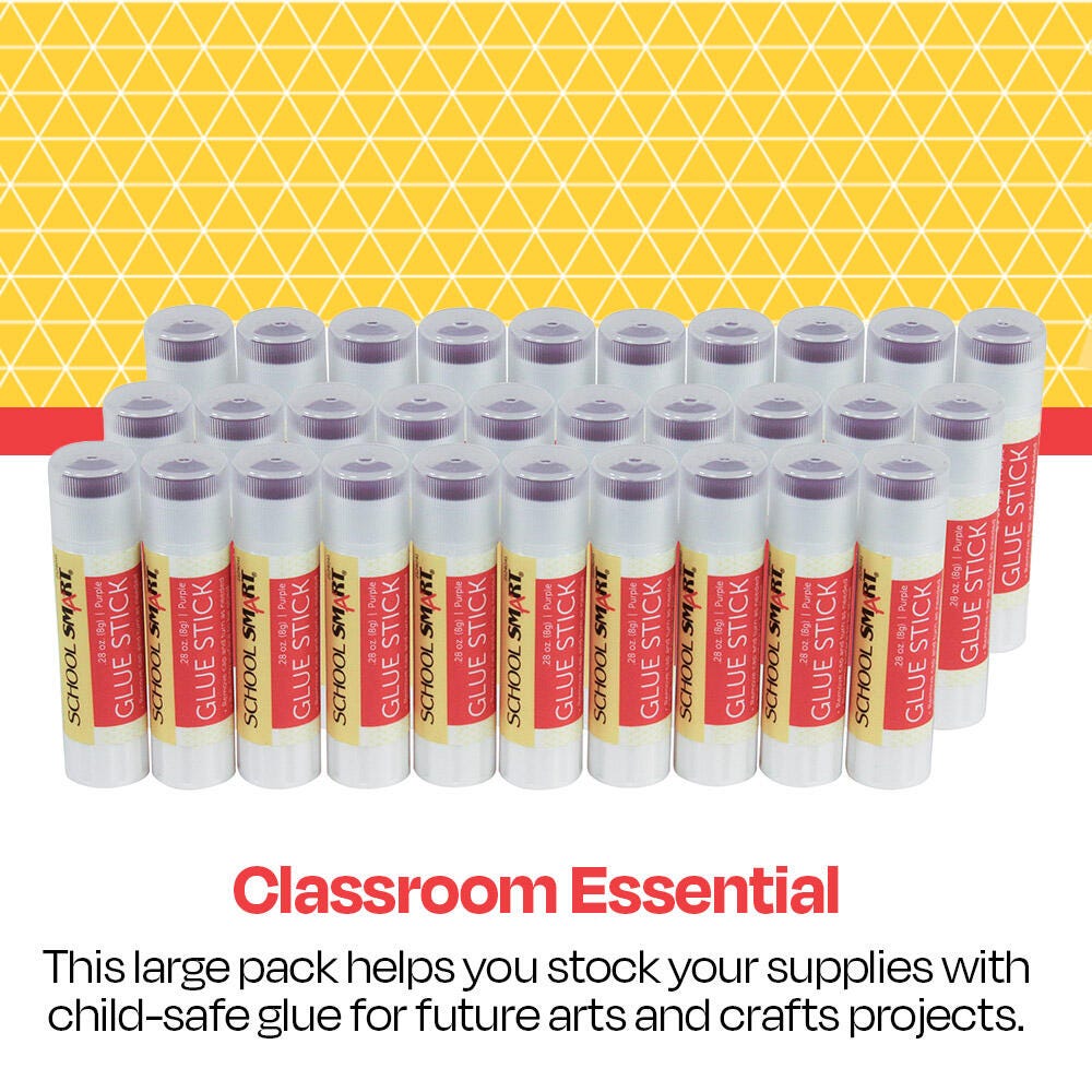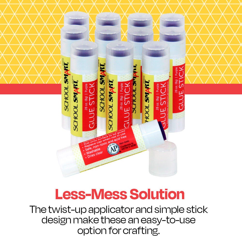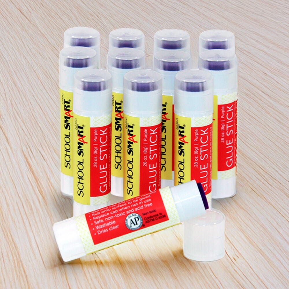 Description Experience simple, strong bonding with this pack of glue sticks from School Smart. These quality glue sticks have an easy twist-up applicator to bond desired pieces such as paper, photos, fabric, cardboard, and more. The purple glue is easy to track during application but conveniently dries to a clear, non-visible translucent color for clean results. The glue is non-toxic, acid-free, gluten-free, and photo-safe. It has a long shelf life and lasts up to 2 years. Not recommended for children under 3 years old. Sold as a pack of 30. AP certified by ACMI.Features Acid-free glue sticks are a mess-free bonding solution for scrapbook and craft projects Easy-to-use glue sticks are a great choice for young crafters and artists Drip-free glue rubs on to surfaces easily, smoothly, and completely Purple glue is visibly easy to track yet dries clear for a clean, crisp look Pack of 30 of glue sticks is provides quality and value for classroom, office, or home projects
