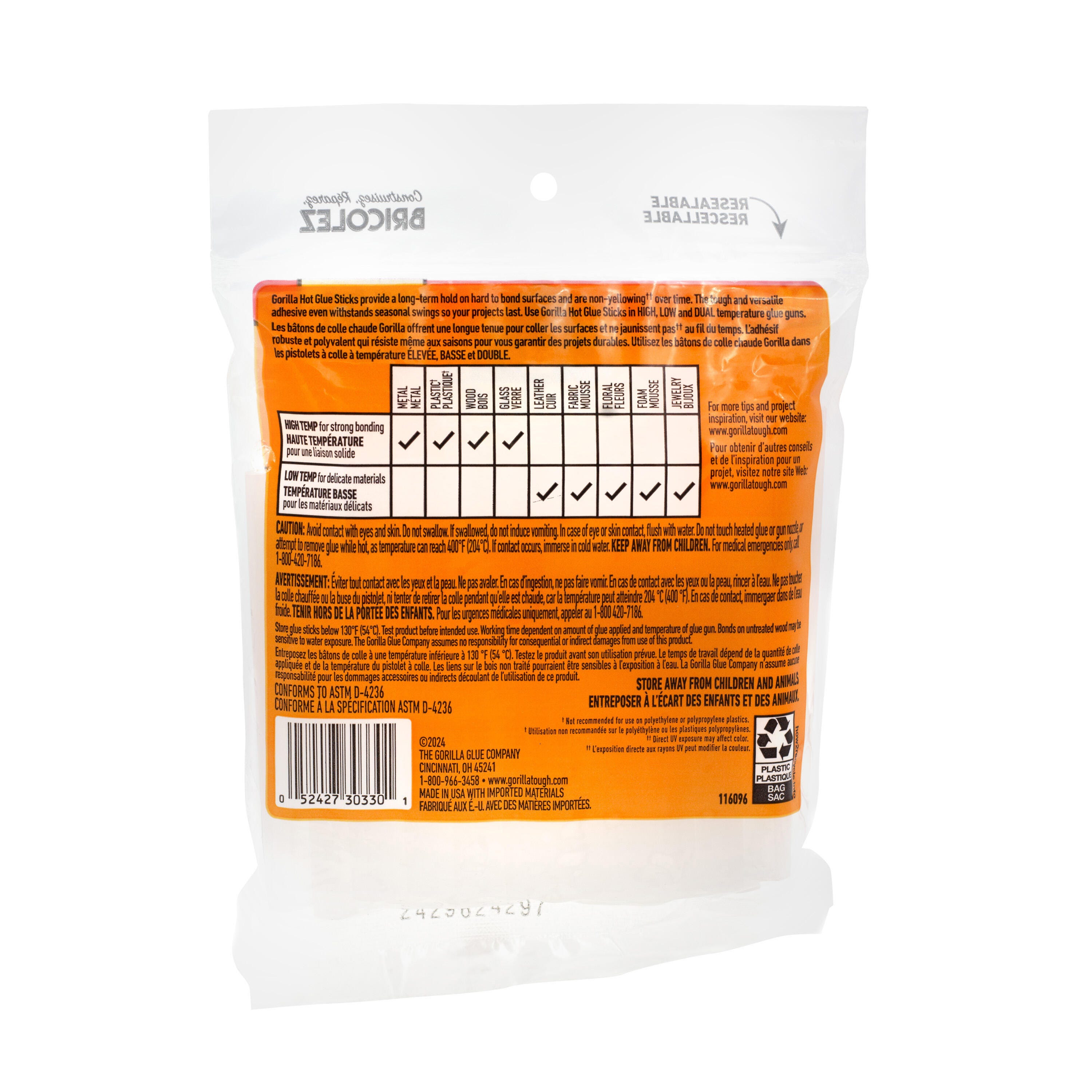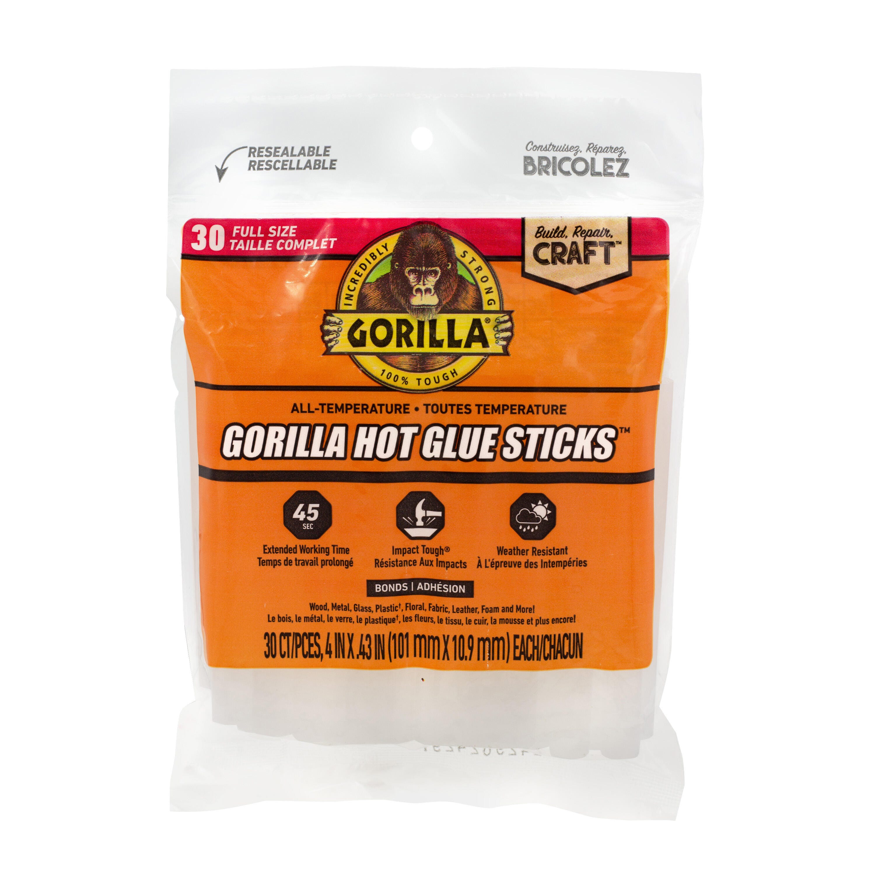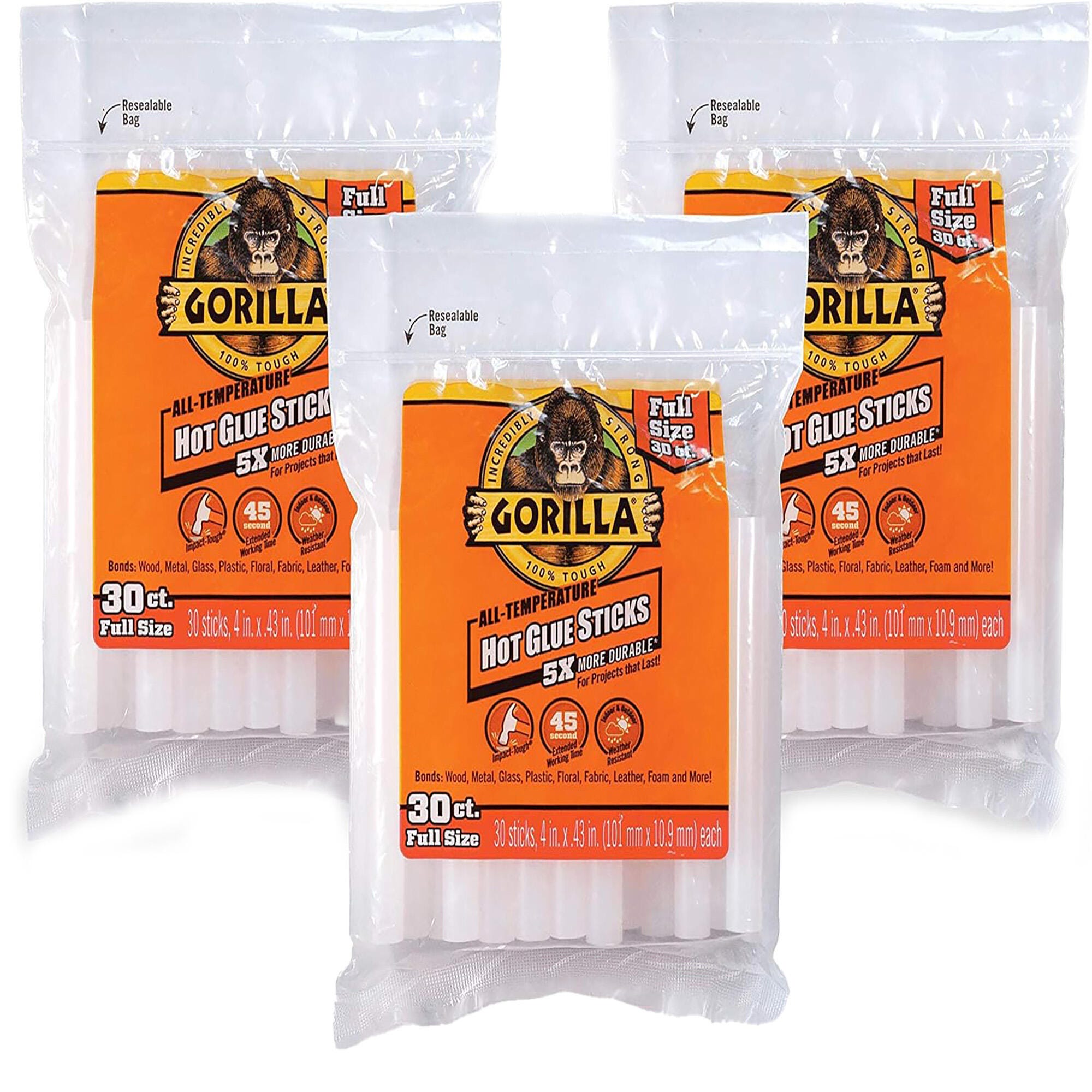 Gorilla Hot Glue Sticks are an all-purpose crafting solution! These versatile acid-free sticks provide a strong, permanent bond that dries clear and is photo-safe. The glue sticks are nontoxic and easy to clean, making them ideal for household projects. These full-size hot glue sticks are compatible with high and low-temperature glue guns. This pack contains 20 sticks, each measuring 8 inches long and .43 inches in diameter. *Not recommended for use on polyethylene or polypropylene plastics.
