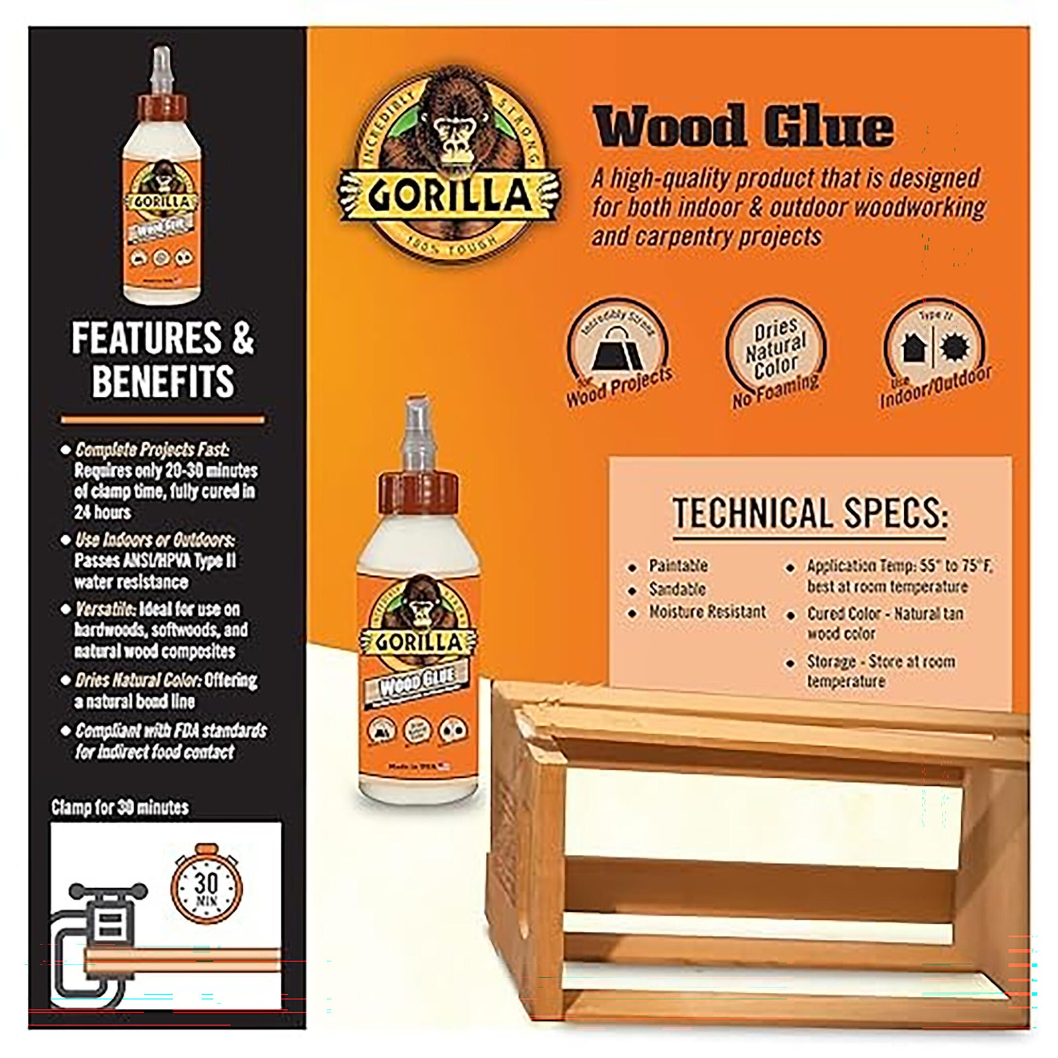 Description Gorilla Wood Glue is the reliable adhesive that professionals and hobbyists trust for their woodworking projects. This PVA glue offers the benefits of an easy-to-use water-based adhesive. The adhesive's premium formula forms a cross-linking bond to provide superior strength indoors or out. This bottle contains 8 ounces of wood glue and features a handy applicator tip.Features Requires only 20 to 30 minutes of clamp time, and is fully cured in 24 hours to get your projects done faster Passes ANSI/HPVA Type II water resistance for reliability during indoor and outdoor projects Versatile glue is suitable for use on hardwoods, softwoods, and natural wood composites Dries to a natural wood color to provide a subtle natural bond line Compliant with FDA standards for indirect food contact