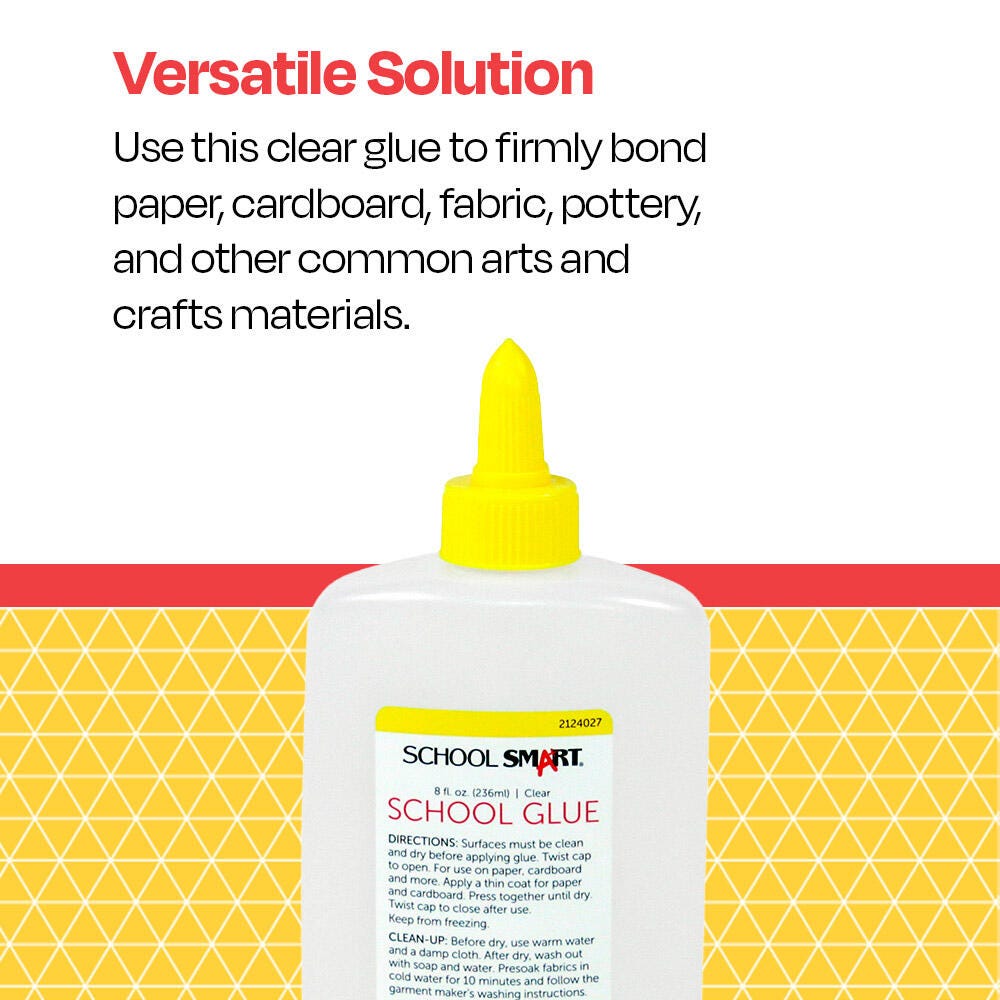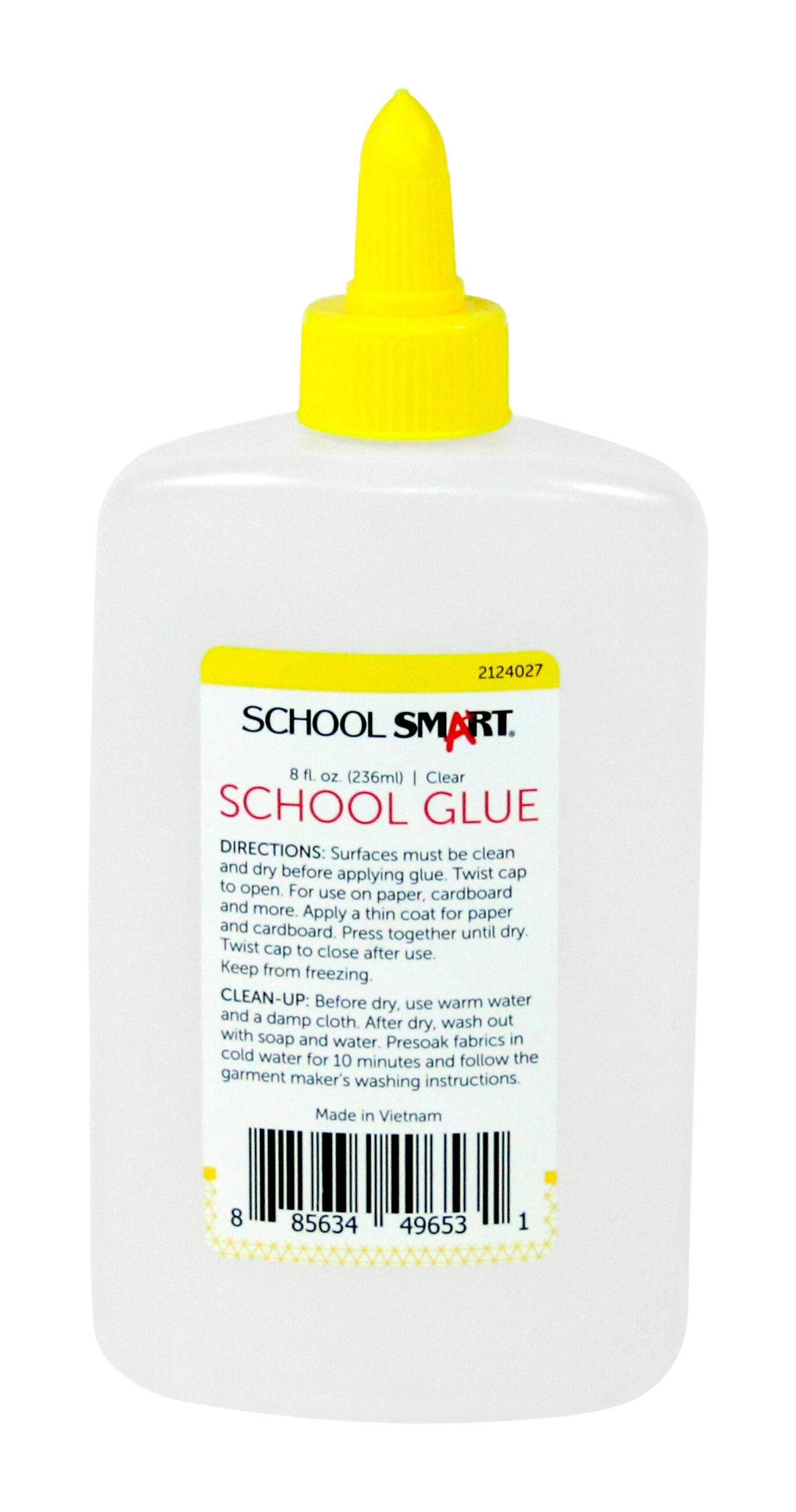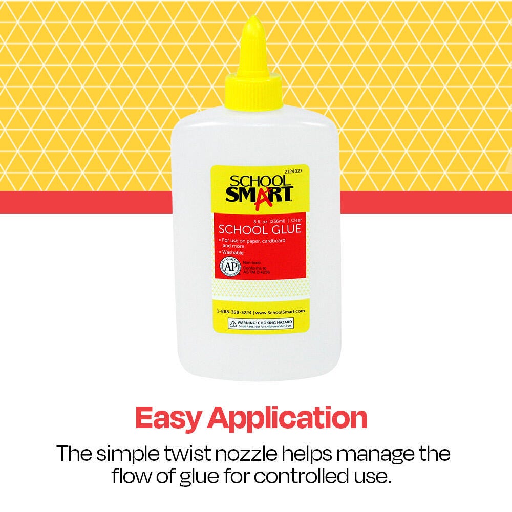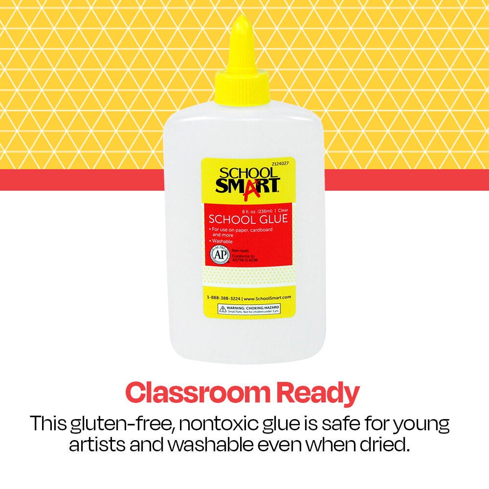 The School Smart Washable School Glue provides a classroom-safe and reliable solution for all your arts and crafts projects! The 8-ounce bottle is easy for young children to handle, features a simple twist-open applicator nozzle, and is perfect for all classroom uses. The glue is nontoxic, gluten-free, and launders completely, even after it has dried hard. It applies clear and dries clear for a neat and clean finish.