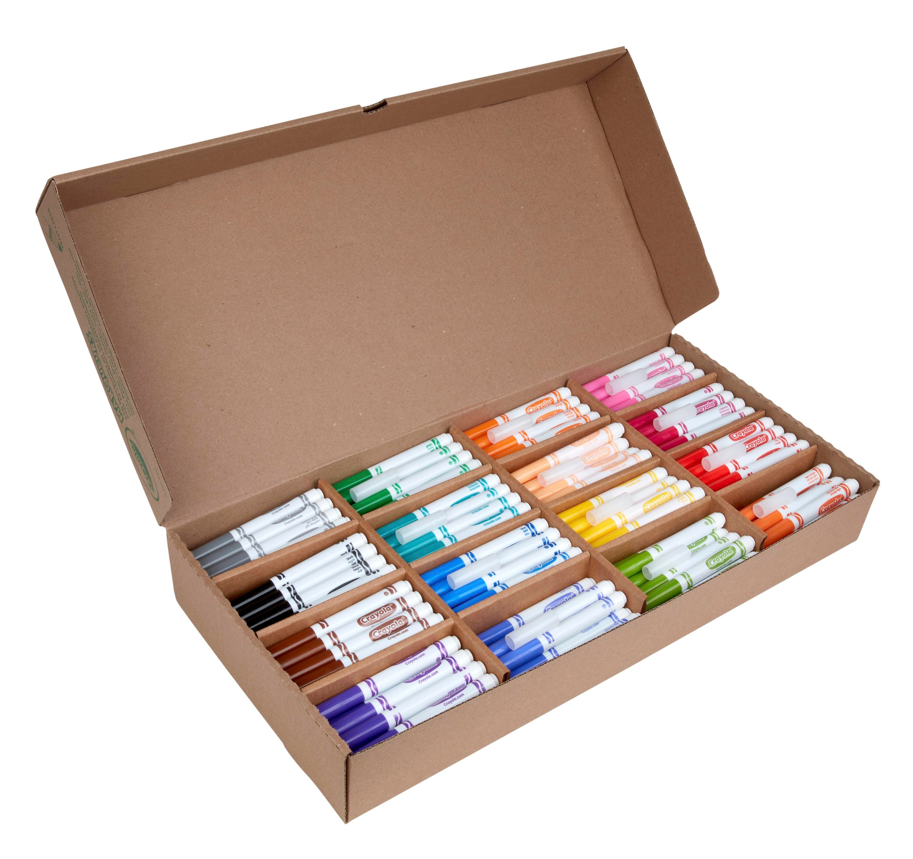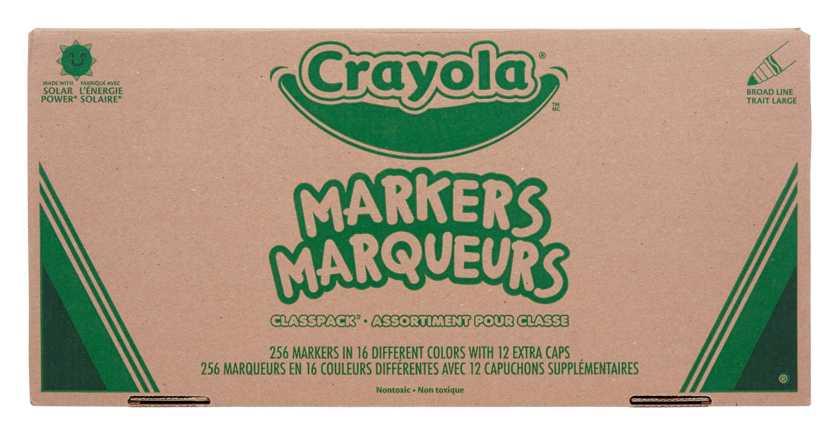 Description This Crayola Marker Classpack offers long-lasting use for all sorts of fun projects at home and in the classroom. These colorful markers have a broad-line tip that lays down bold strokes that are great for coloring, drawing, writing, and more. When imagination and bold colors come together, little artists will bring all kinds of art projects to life. This classpack contains 256 markers, 16 each of the following 16 colors: yellow, brown, orange, red, violet, blue, green, black, flamingo pink, dolphin gray, sandy tan, tiger orange, iguana green, turquoise, royal purple and raspberry.Features Broad line markers feature conical tips and can create bold and thin lines for ultimate creative versatility Bold ink formula leaves vibrant marks on most surfaces Convenient storage box keeps markers organized Provides high-quality markers at a great value for the classroom budget AP-certified and non-toxic for safe use in any setting Recommended for ages 4 and up