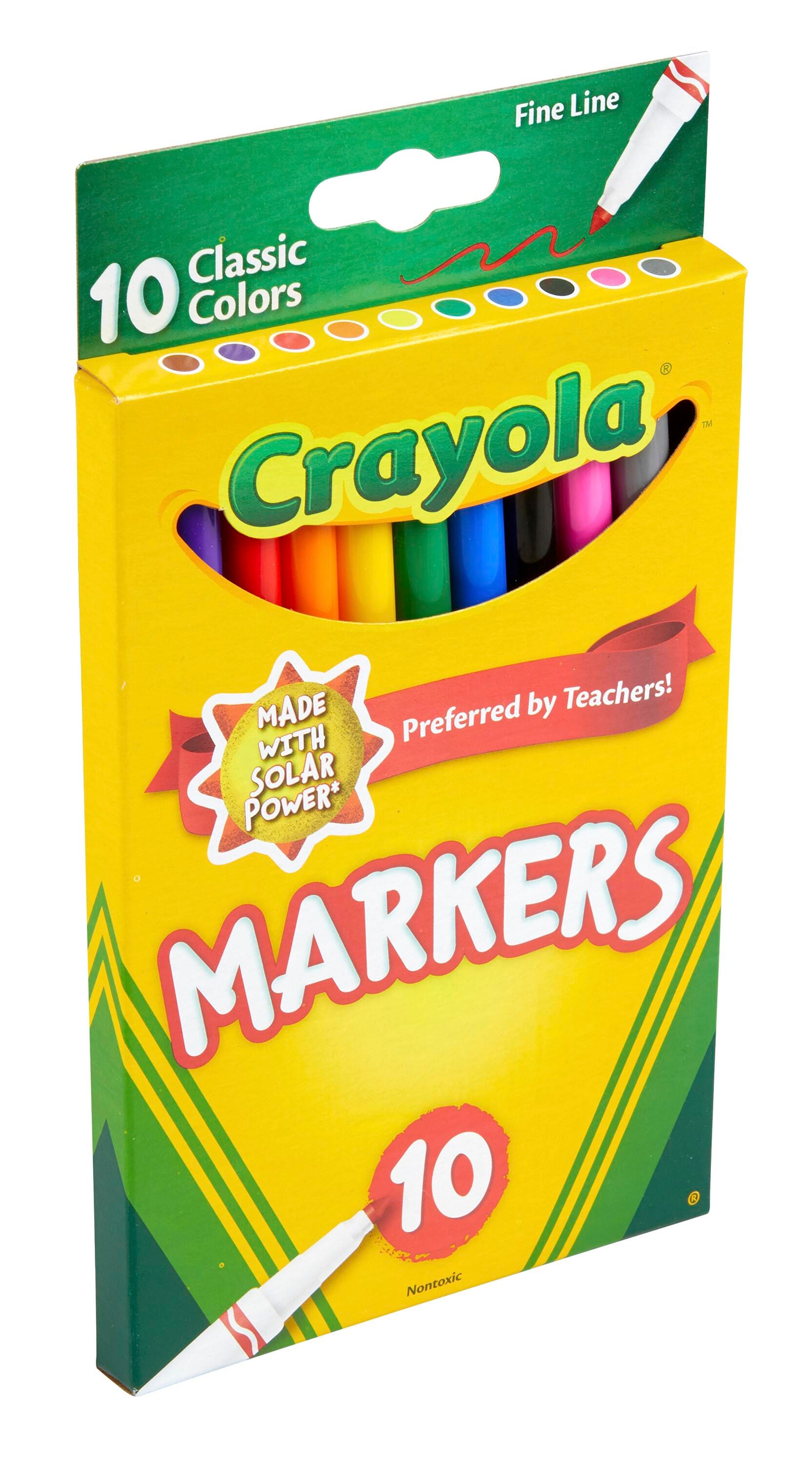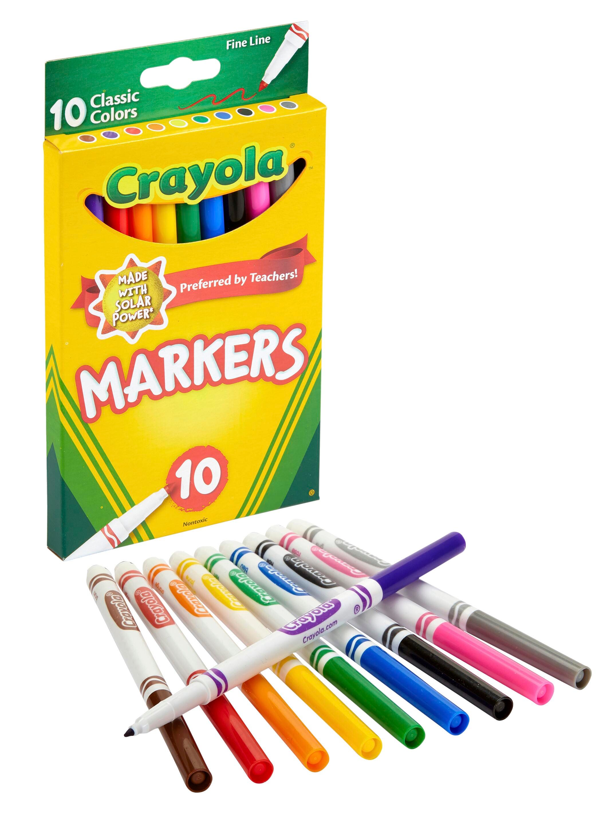 Description Crayola Markers offer long-lasting use for a variety of fun projects at home or in the classroom. When imagination and bold colors come together, young artists can bring all kinds of art projects to life. These fine line markers have slender tips that draw precise, thin lines perfect for intricate coloring books or drawing and writing in small areas. This pack includes 10 markers, 1 each in the following colors: black, blue, brown, green, orange, red, violet, yellow, pink, and gray.Features Fine tips are great for creating detailed works or coloring in small areas Markers provide lasting use for writing, sketching, handwriting, coloring, and countless other arts and crafts projects Bold ink formula leaves vivid color that won't smudge or bleed through paper AP-certified non-toxic for safe use in any setting Recommended for ages 3 and up