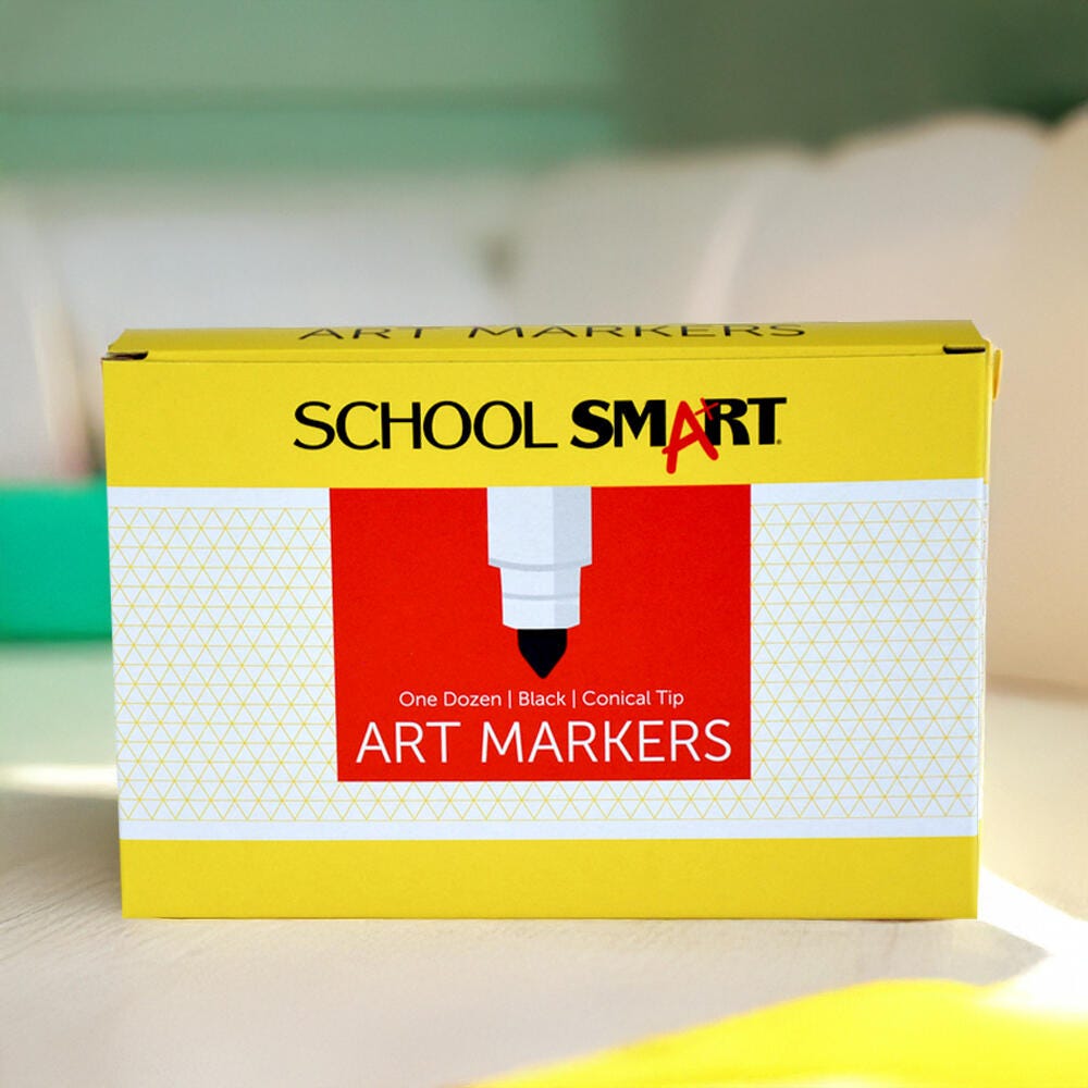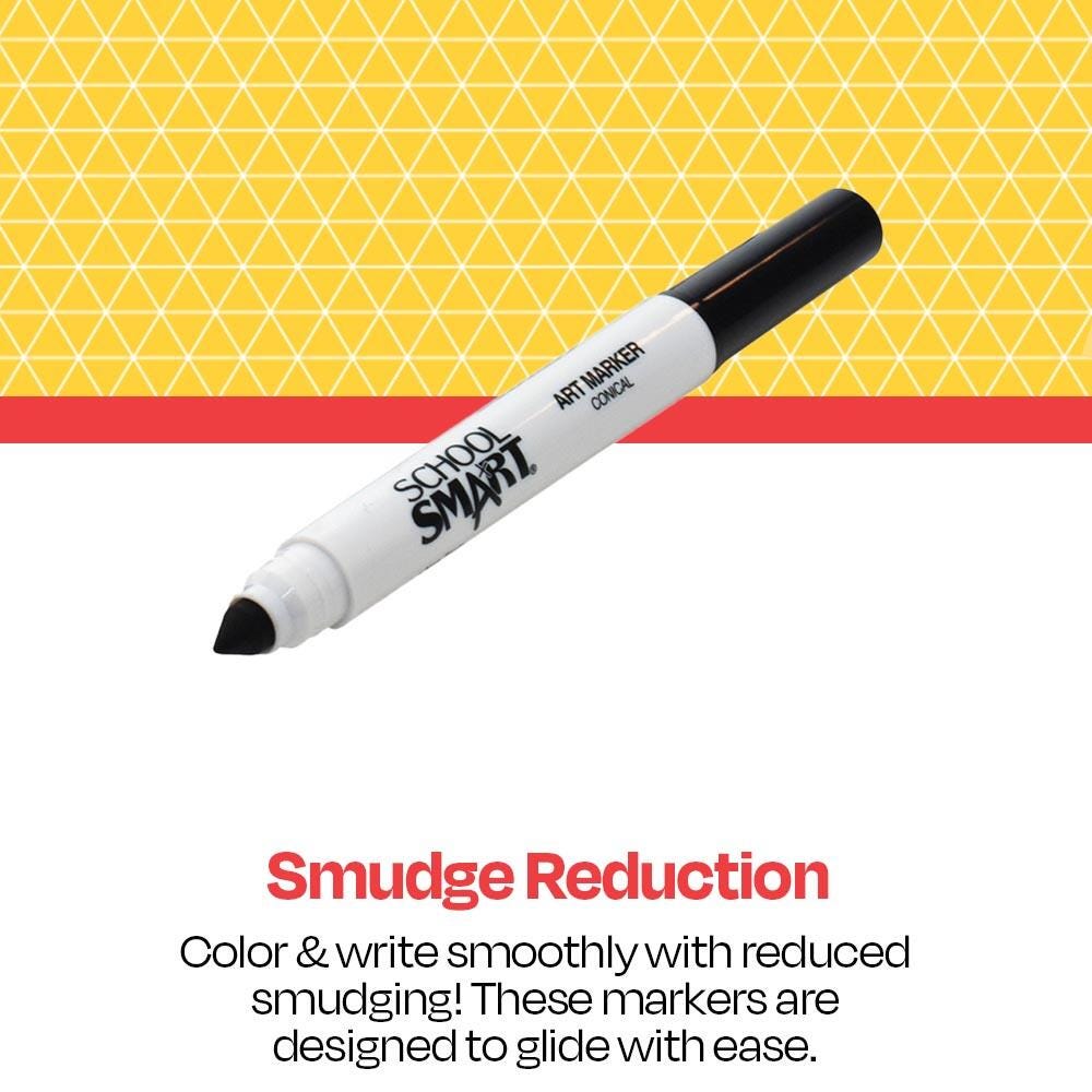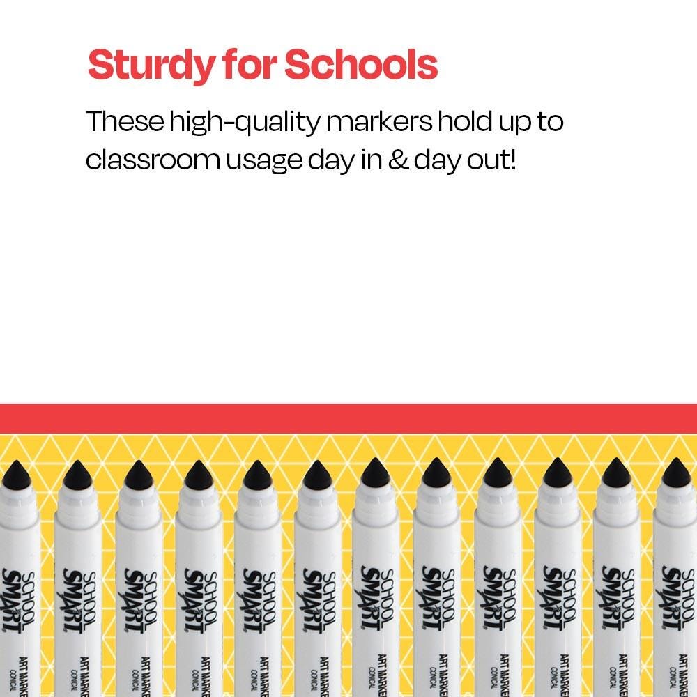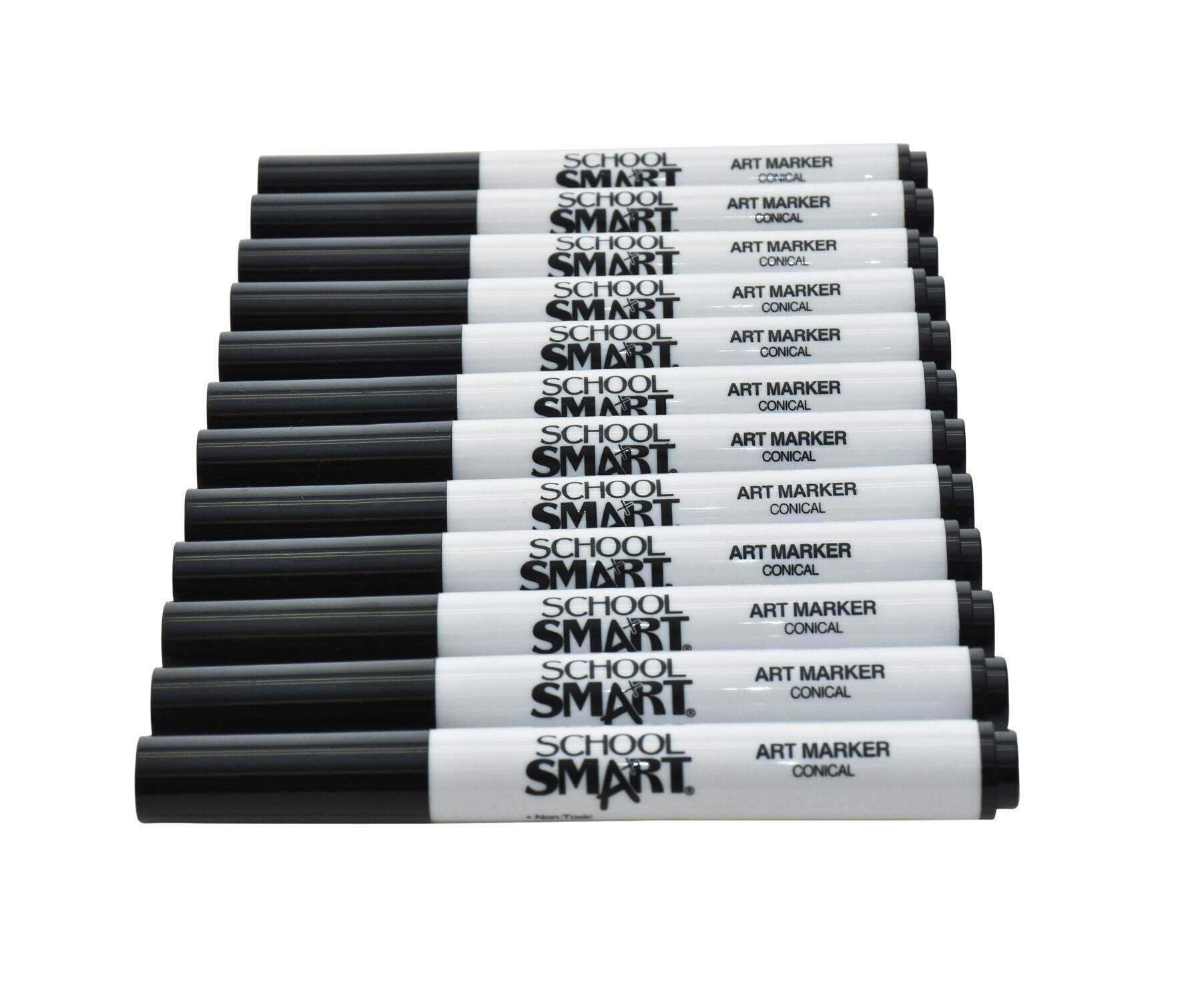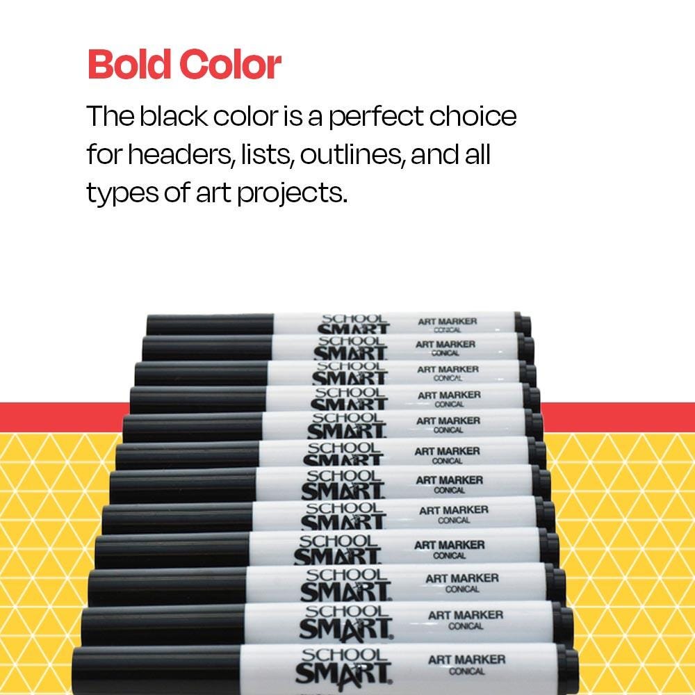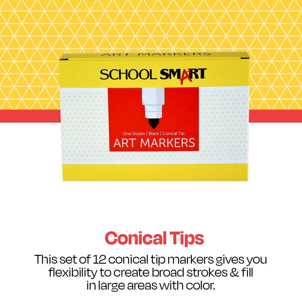 Description School Smart wedge art markers take art to an effortless level with a vivid black color and durable conical shaped nibs. They are designed for making smudge-resistant medium lines, broad strokes, or allover thorough coverage. Glides smoothly across any type of paper. Tips hold up to active daily use without wearing down. Non-toxic.Features Pigment color is strong, bold, and long-lasting Medium-sized conical tips create evenly smooth lines and work well for everyday drawing, coloring, or detailed work Tips can be turned on sides for creating broad-lined strokes and coloring in large surface areas Caps conveniently snap on back ends for instant use Dozen pack ensures classrooms and other large groups can use readily use black markers without having to wait turns