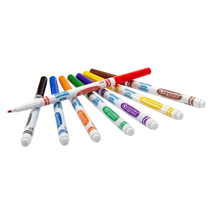 Creative self-expression is fun and mess-free with the Ultra-Clean Washable Markers from Crayola. The Crayola Ultra-Clean Washable Markers now come complete with ColorMax to ensure the truest and brightest colors possible. These fine line markers have slender tips that draw precise, thin lines perfect for intricate coloring books or drawing and writing in small areas. Bold, non-toxic Ultra-Clean formula is a bonus for both kids and adults, as stray marks wash easily from skin, clothing/fabric, and even walls using just soap and water. This pack contains 8 markers, 1 each in the following colors: black, blue, brown, green, orange, red, violet, and yellow.Features