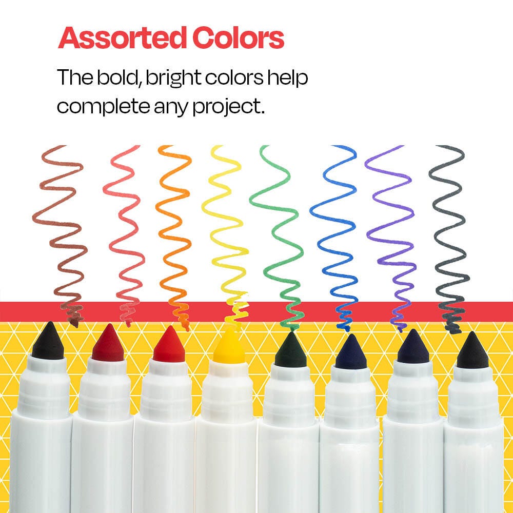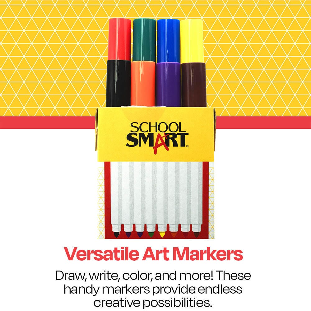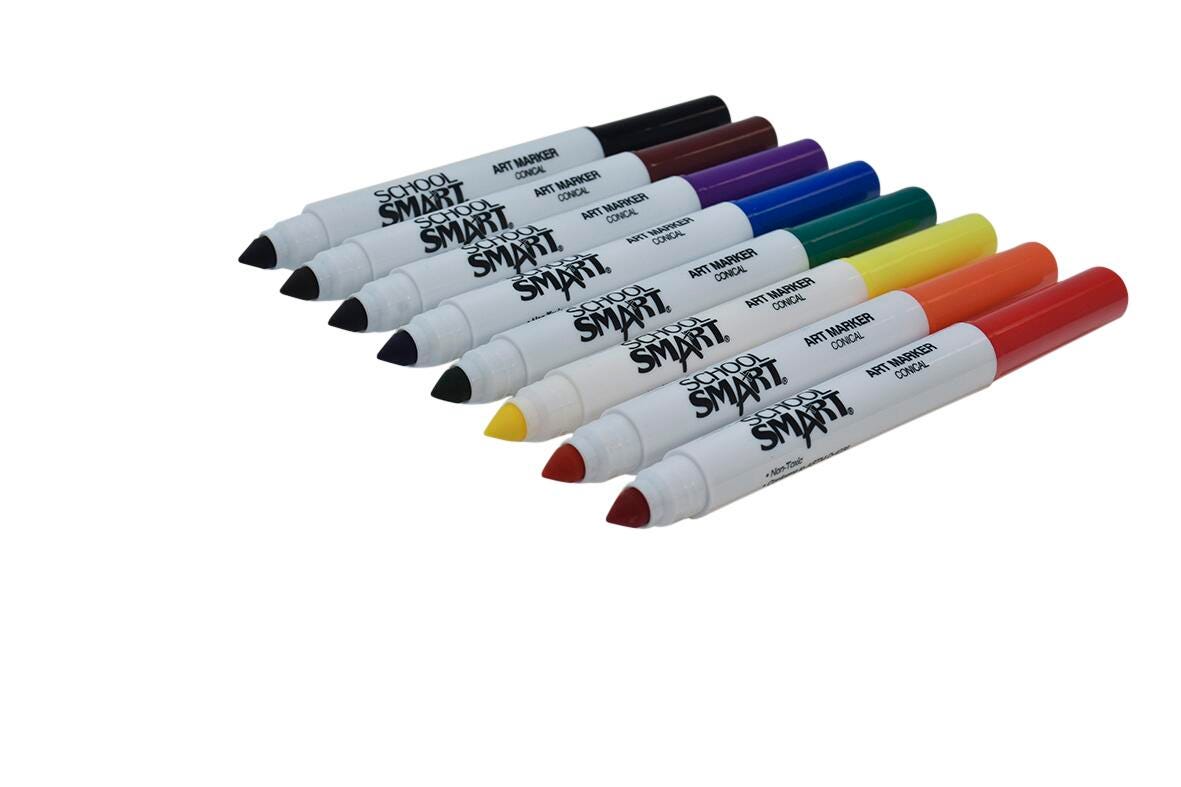 Description Encourage young artists to create bold, brilliant designs with the School Smart art markers set. Our art markers are great for kids, teens, and adults. The conical tip markers can color large areas or create thin, narrow lines for detailed artwork. This value set comes in 8 vibrant colors (Black, Red, Blue, Green, Yellow, Purple, Orange, and Brown).Features Non-toxic art markers for kids are great for use in the classroom or at home Each coloring tool has a long-lasting tip that holds up to regular use Conical tips allow for bold, thick strokes and fine detail when necessary The 8-pack of markers is economically priced to fit your classroom budget Our non-toxic art supplies for children conform to ASTM D-4236 Includes: 8 Art Markers, Conical Tip