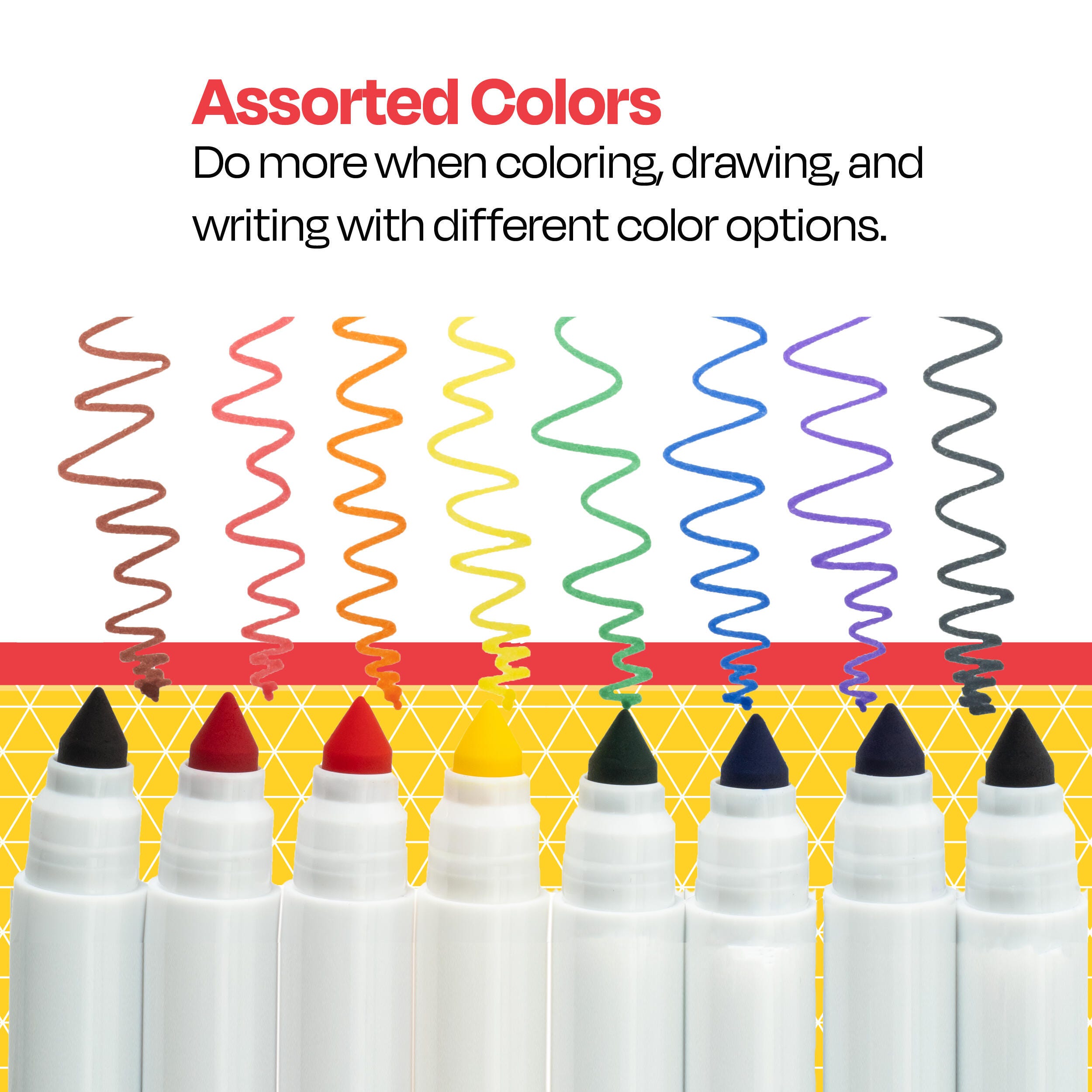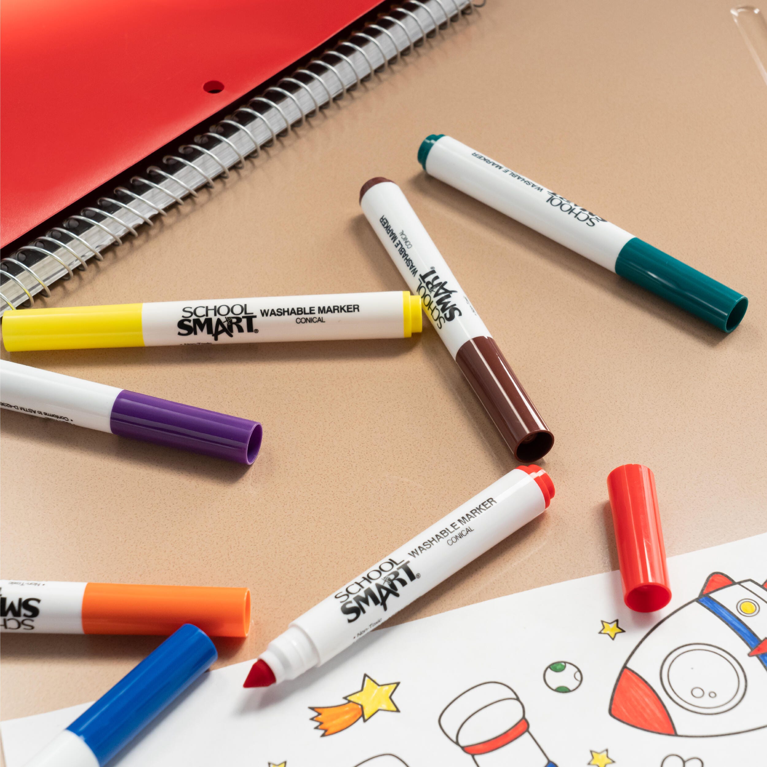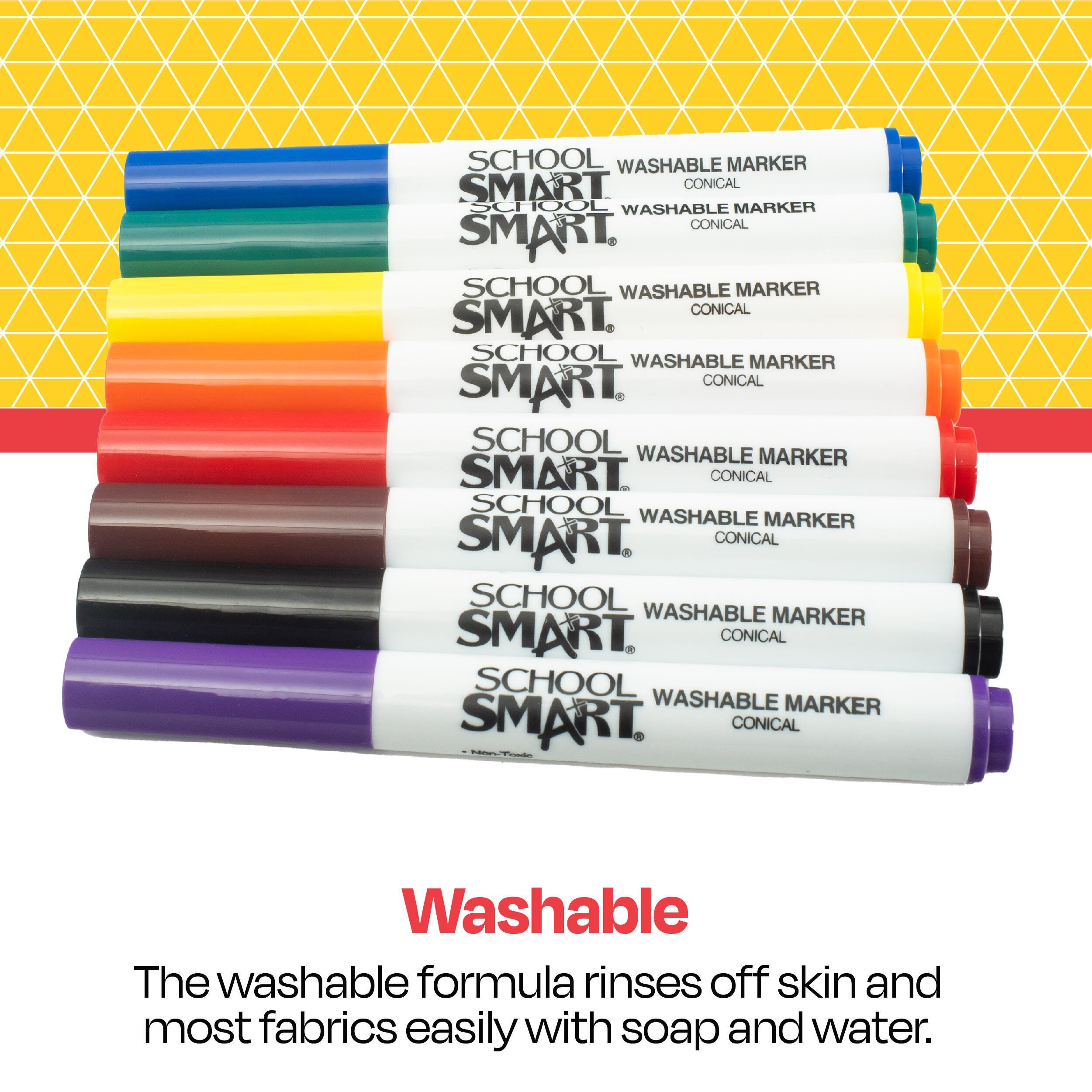 Description The School Smart washable markers set can be used by kids plus adults. Especially great for young children, these classic markers dry quickly and wash easily from skin and many fabrics. Our art markers glide smoothly on paper and the conical tips can create big, broad strokes or thin, narrow lines when needed. The high-quality design holds up to active daily use without wearing down. This value set of easy to wash markers comes in 8 vibrant colors (Black, Red, Blue, Green, Yellow, Purple, Orange, and Brown).Features The classic art markers pack includes 8 markers in assorted colors Our non-toxic art markers for kids are great for classrooms and homes Caps conveniently snap on to the back ends so they are harder to lose Each coloring tool has a long-lasting tip that holds up to regular use Conical tips allow for bold, thick strokes and fine detail when necessary The 8-pack of markers is economically priced to fit your classroom budget Our non-toxic art supplies for children conform to ASTM D-4236 Includes: 8 Count Washable Markers, Conical Tip