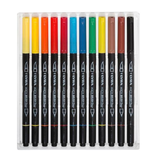 Lyra Aqua Brush Duo Marker with brush-on effect has a tip on one side that is highly stable and lets easy drawings or fine lines. Non-Toxic marker having water-based ink features a wide tip on other side for brush-like techniques. Marker is sold as 12 assorted colors per set.