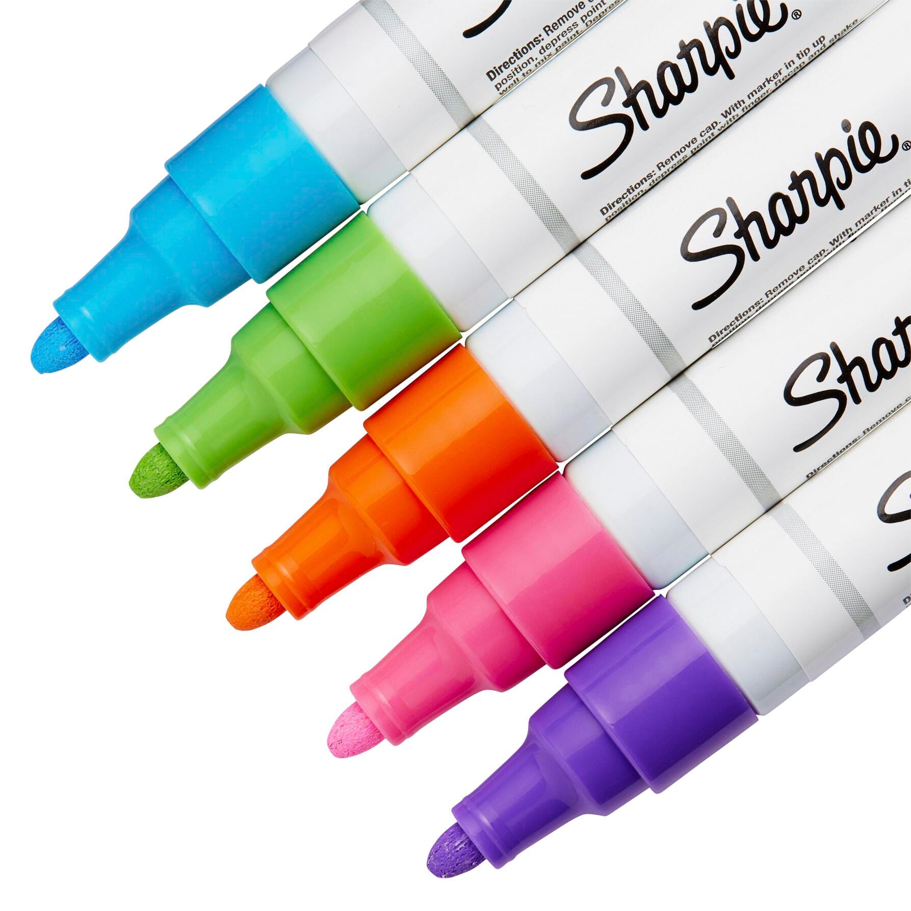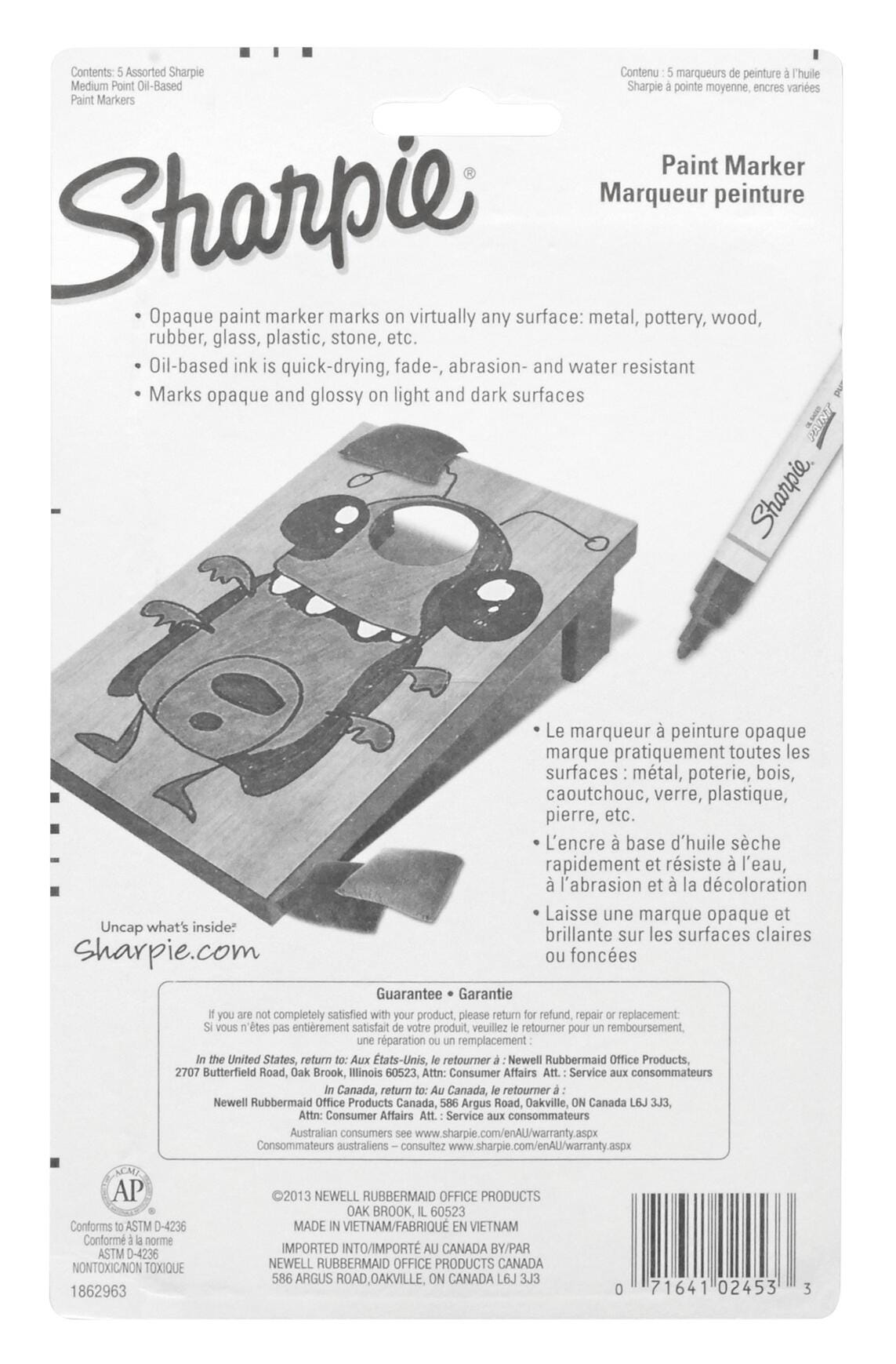 Description Sharpie Oil-Based Paint Markers help you create in vivid colors. Each marker contains quality oil-based paint and a medium tip that leaves bold, opaque marks that stand out on any surface. The paint is specially formulated to last and resists abrasions, water, and fading. Bring any project to life with these colorful paint markers. This set includes 5 paint markers in the following colors: aqua, lime, orange, pink, and purple.Features Quick-drying paint prevents smudges so your work stays clean Create colorful and opaque marks on light, dark, and glossy surfaces Designed to be removable from glass making them the perfect tool for themed window or mirror decorations AP Certified Xylene free