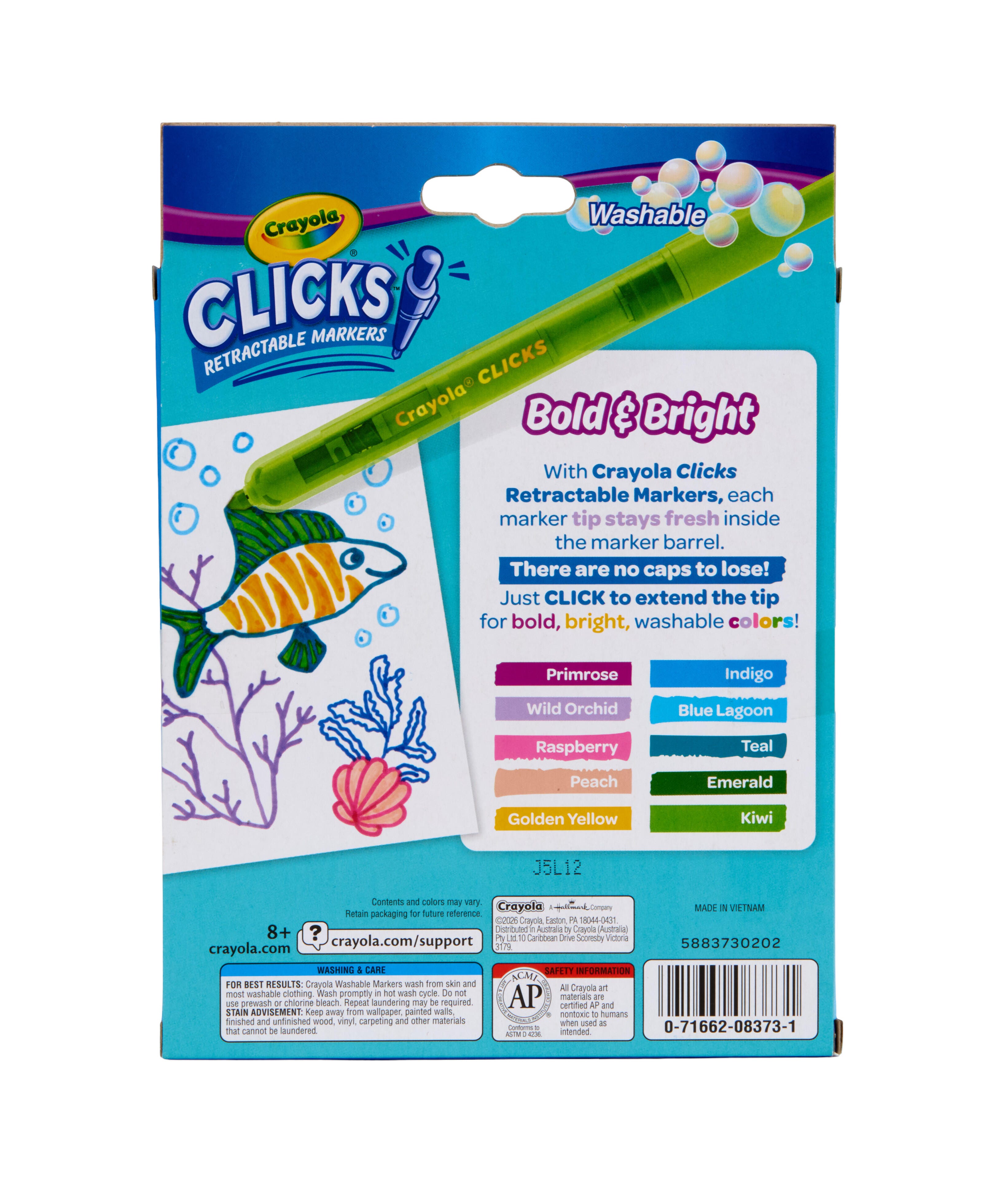 Your art will jump off the page with these Bold & Bright Crayola Clicks Retractable Markers, the colorful solution to lost lids and dried out markers! These retractable art markers have special ink that is designed to resist drying out to keep them going project after project. Their conical tips draw thick and thin lines, while the easy-click design makes them ideal for coloring on the go. The vibrant ink washes off skin as well as most washable clothing, perfect for young artists doing school projects, crafts, and homework assignments. Safe and non-toxic, ideal for children ages 5 and up. This set comes with 10 markers, with one each in the colors Primrose, Indigo, Wild Orchid, Blue Lagoon, Raspberry, Teal, Peach, Emerald, Golden Yellow, and Kiwi.Features