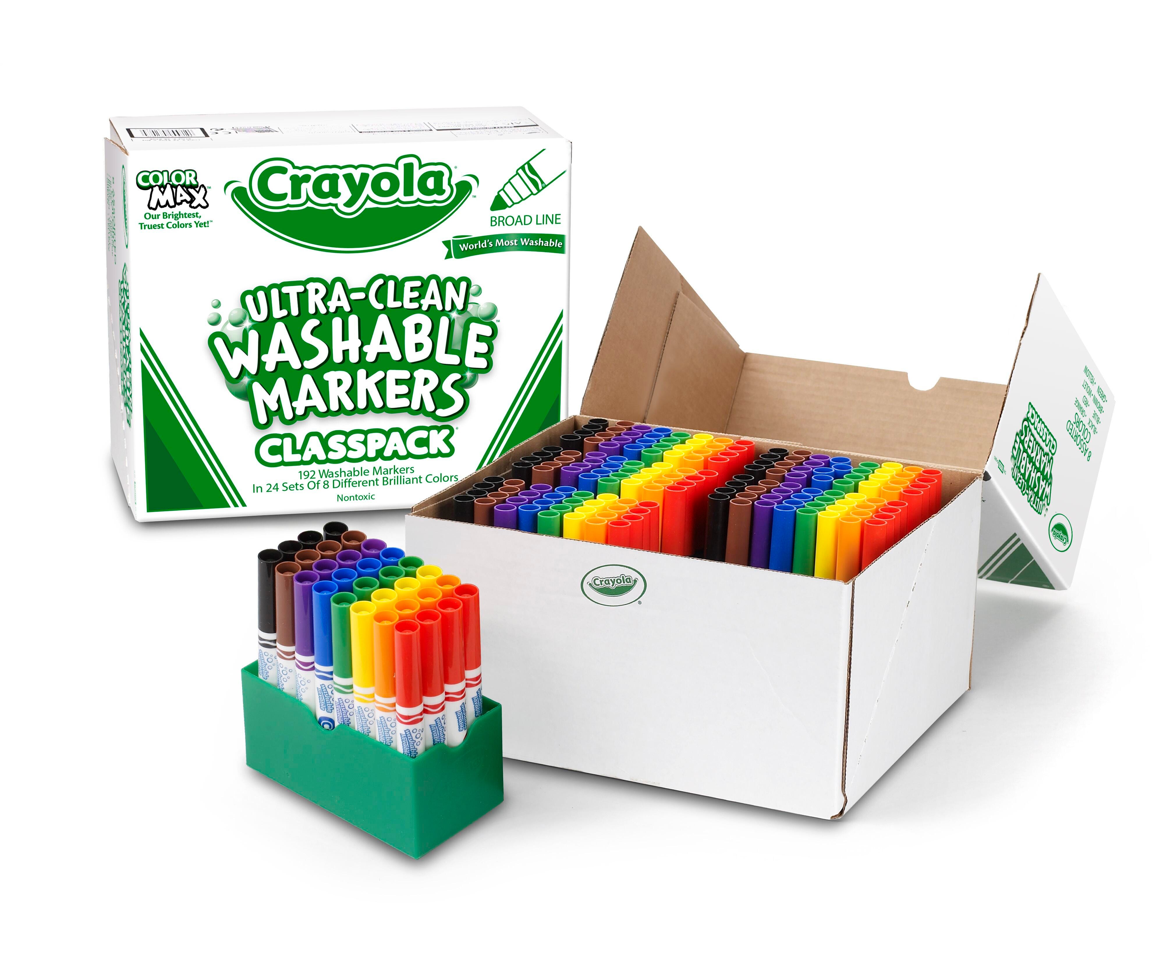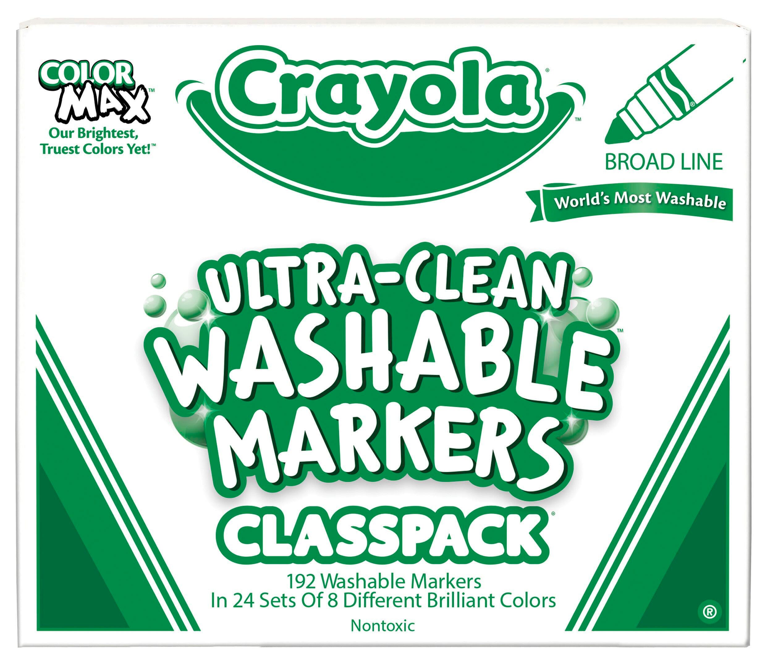 Bring home the most washable marker in the world! These Crayola Ultra-Clean Washable Markers have a broad-line conical tip that lays down wide strokes and thin lines for coloring, drawing, writing, and more. Plus, each marker features Color Max ink technology that produces the truest, brightest colors possible. The Ultra-Clean formula keeps the bold colors where you want them, making it easy to wash stray marks from skin, clothing, and even walls. This classpack contains 192 markers, 24 of each of the following colors: red, yellow, green, blue, violet, orange, brown, and black.Features
