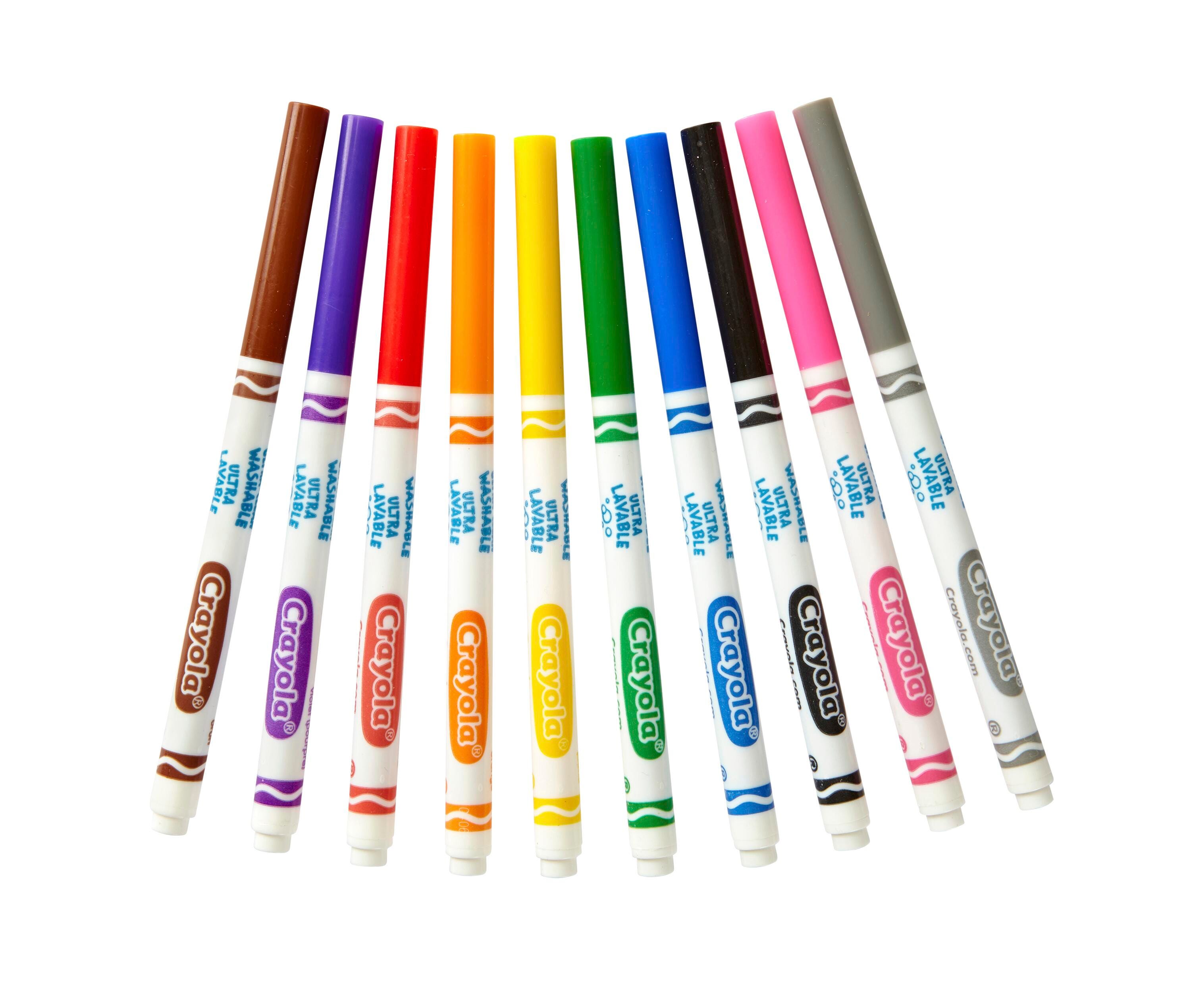 Creative self-expression is fun and mess-free with the Ultra-Clean Washable Markers from Crayola. These fine line markers have slender tips that draw precise, thin lines perfect for intricate coloring books or drawing and writing in small areas. Bold, non-toxic Ultra-Clean formula is a bonus for both kids and adults, as stray marks wash easily from skin, clothing/fabric, and even walls using just soap and water. The set comes with 12 additional replacement caps. This classroom marker assortment includes 200 markers, 20 in each of the following colors: red, yellow, blue, green, orange, violet, pink, gray, brown, and black.Features