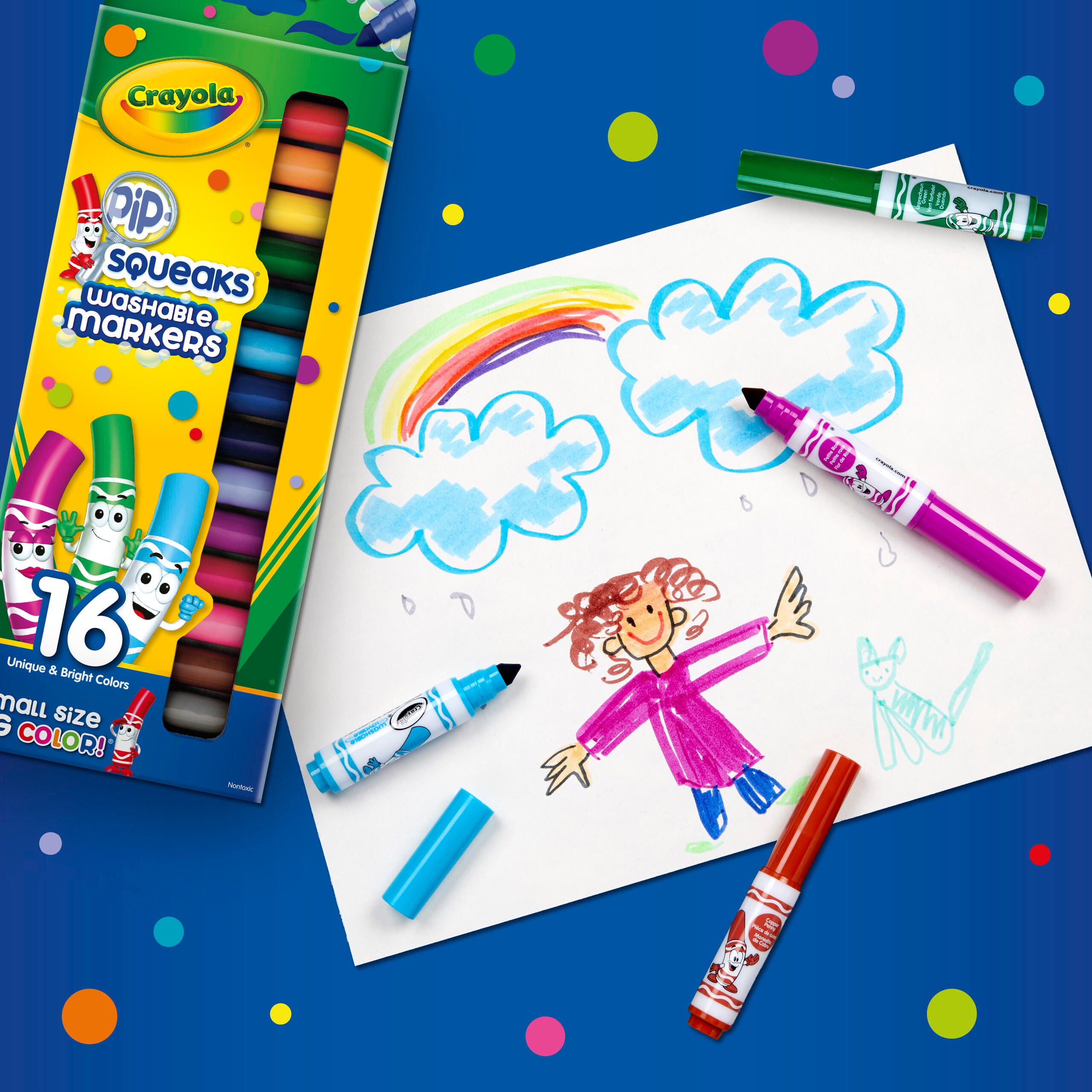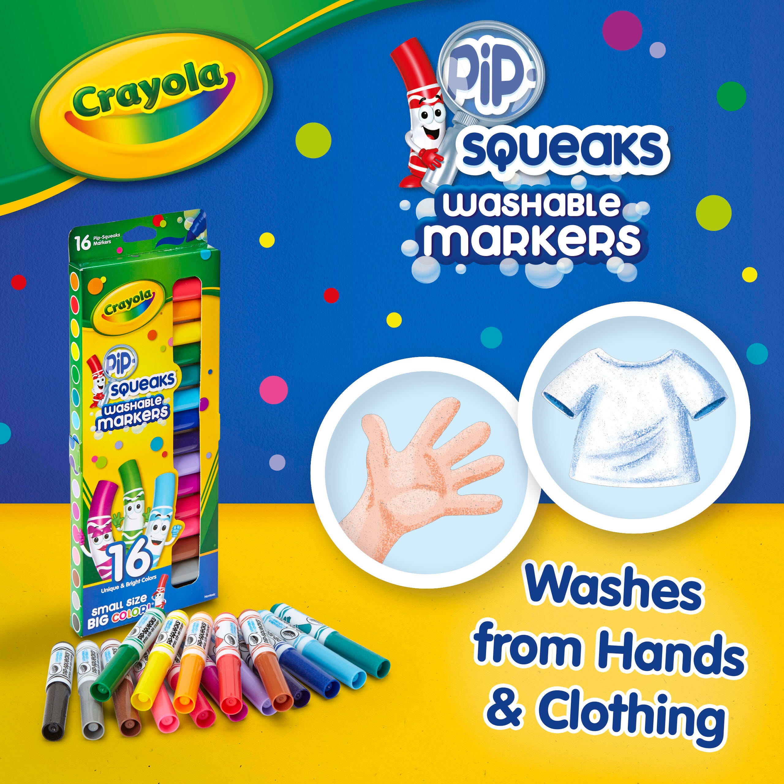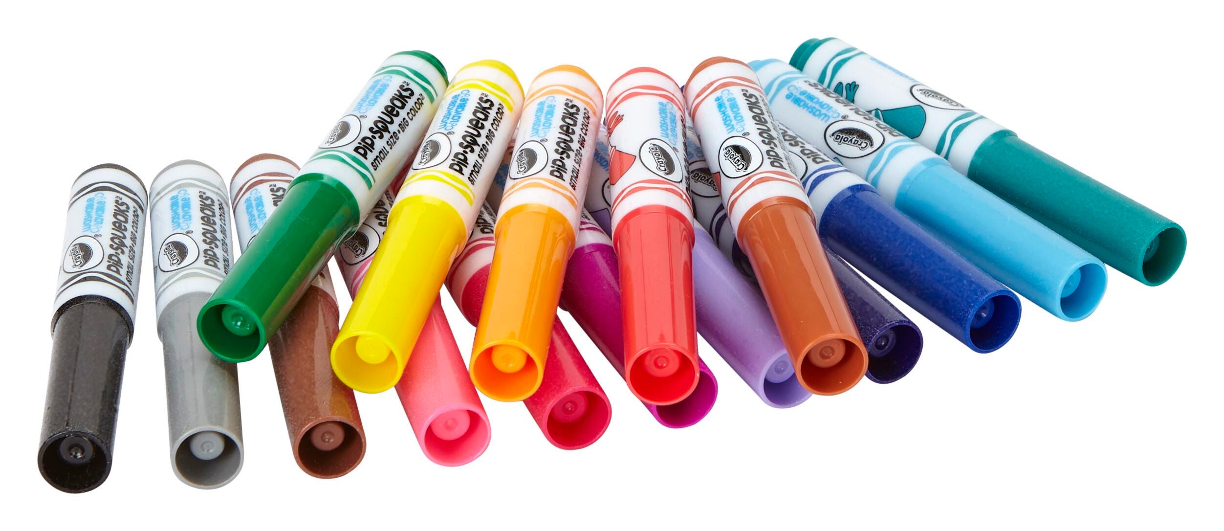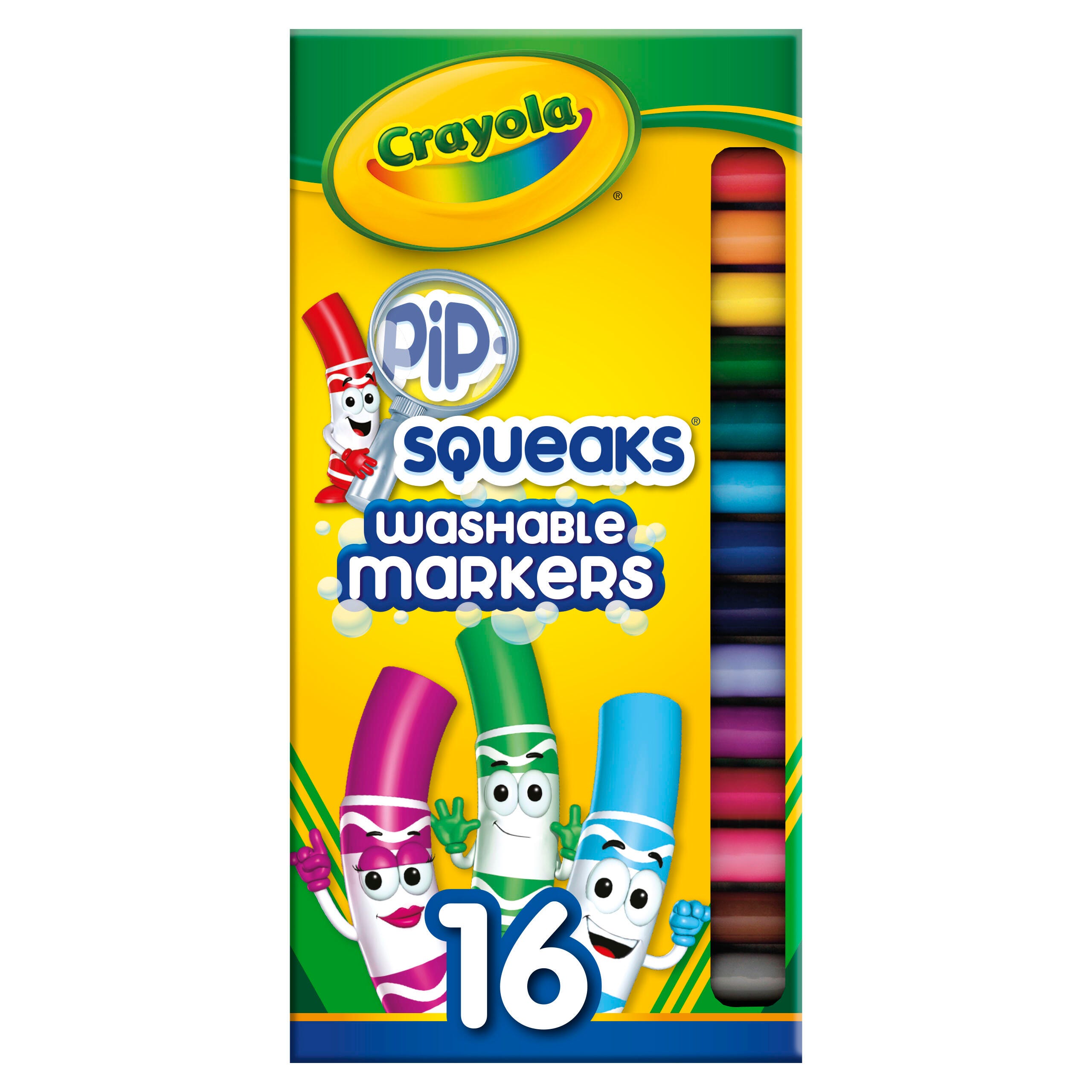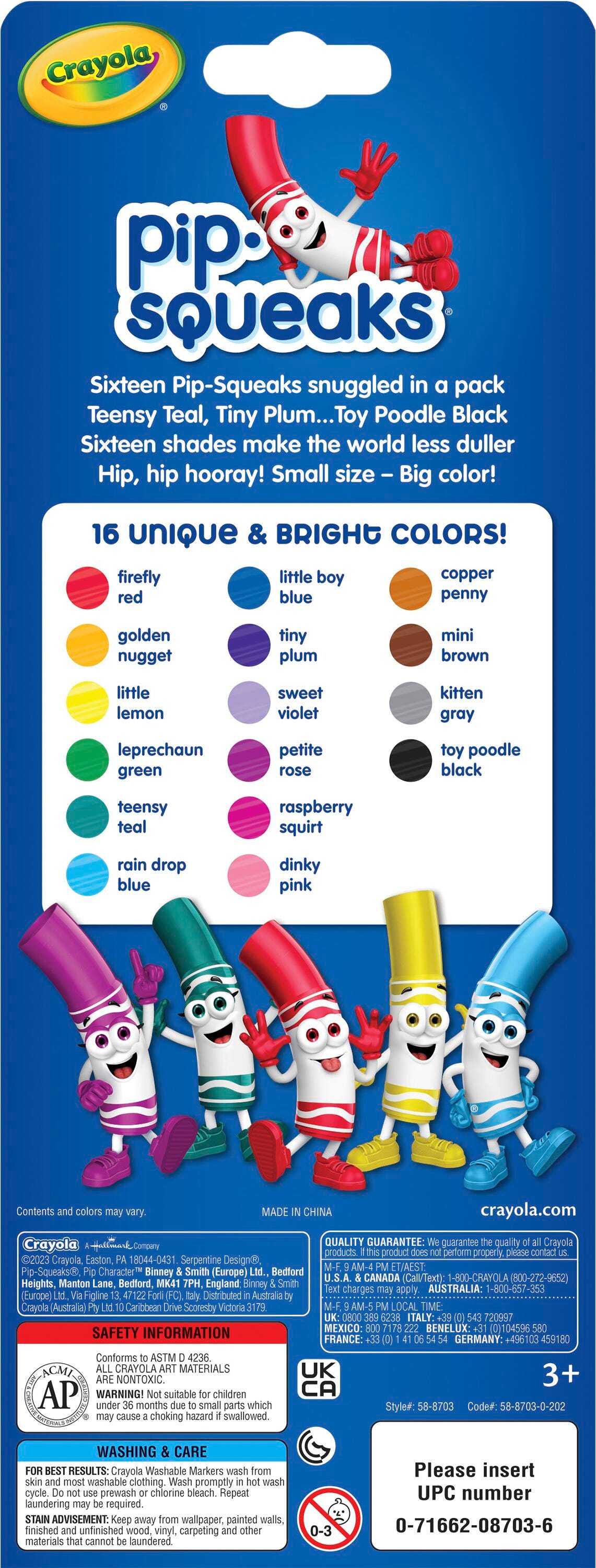Description These Crayola Pip-Squeaks Washable Markers deliver colorful fun for young artists. The colorful pip-squeak markers are scaled to fit perfectly in small hands and feature a handy washable formula that makes cleanup a breeze. This pack contains 16 markers, 1 in each of the following special colors: Firefly Red, Little Boy Blue, Copper Penny, Golden Nugget, Tiny Plum, Mini Brown, Little Lemon, Sweet Violet, Kitten Gray, Leprechaun Green, Raspberry Squirt, Toy Poddle Black, Teensy Teal, Petite Rose, Rain Drop Blue, and Dinky Pink.Features Markers lay down high-quality washable ink that easily washes off skin and most clothing Smaller marker barrels offer small hands easy grip and control Mini markers produce bold color in a small package, great for coloring, drawing, writing, and more AP certified non-toxic for safe use in any setting Recommended for ages 3 and up