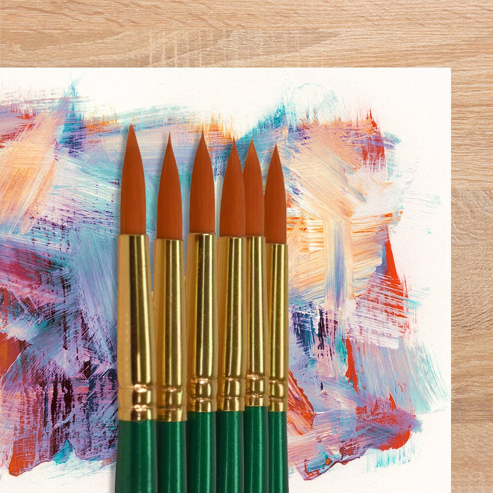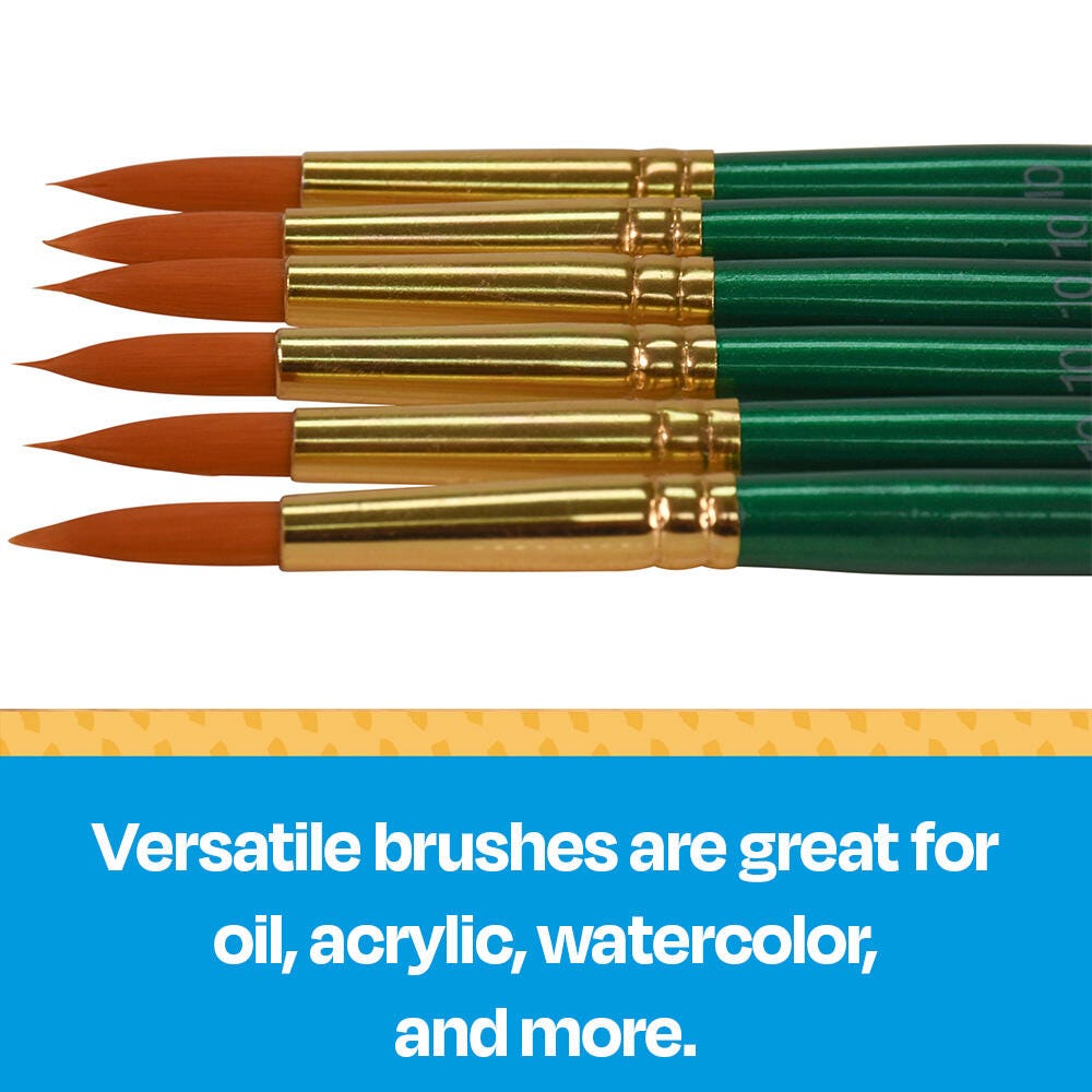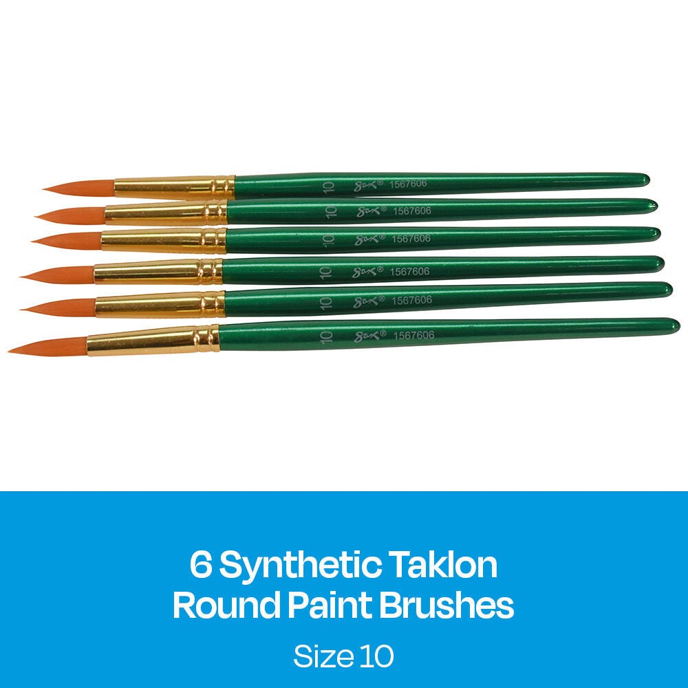 Sax golden taklon paint brushes with short handles and a round tip provide optimum snap and smooth application. Excellent brush strokes help students create their best projects while enhancing their painting techniques on different mediums. Our 6-pack of synthetic bristle brushes is perfect for all your crafting needs in the classroom or art studio. Use the size 10 brushes for very fine detail and small spaces. Golden nylon synthetic hair brushes are great with different mediums, including oil, acrylic, and watercolors.