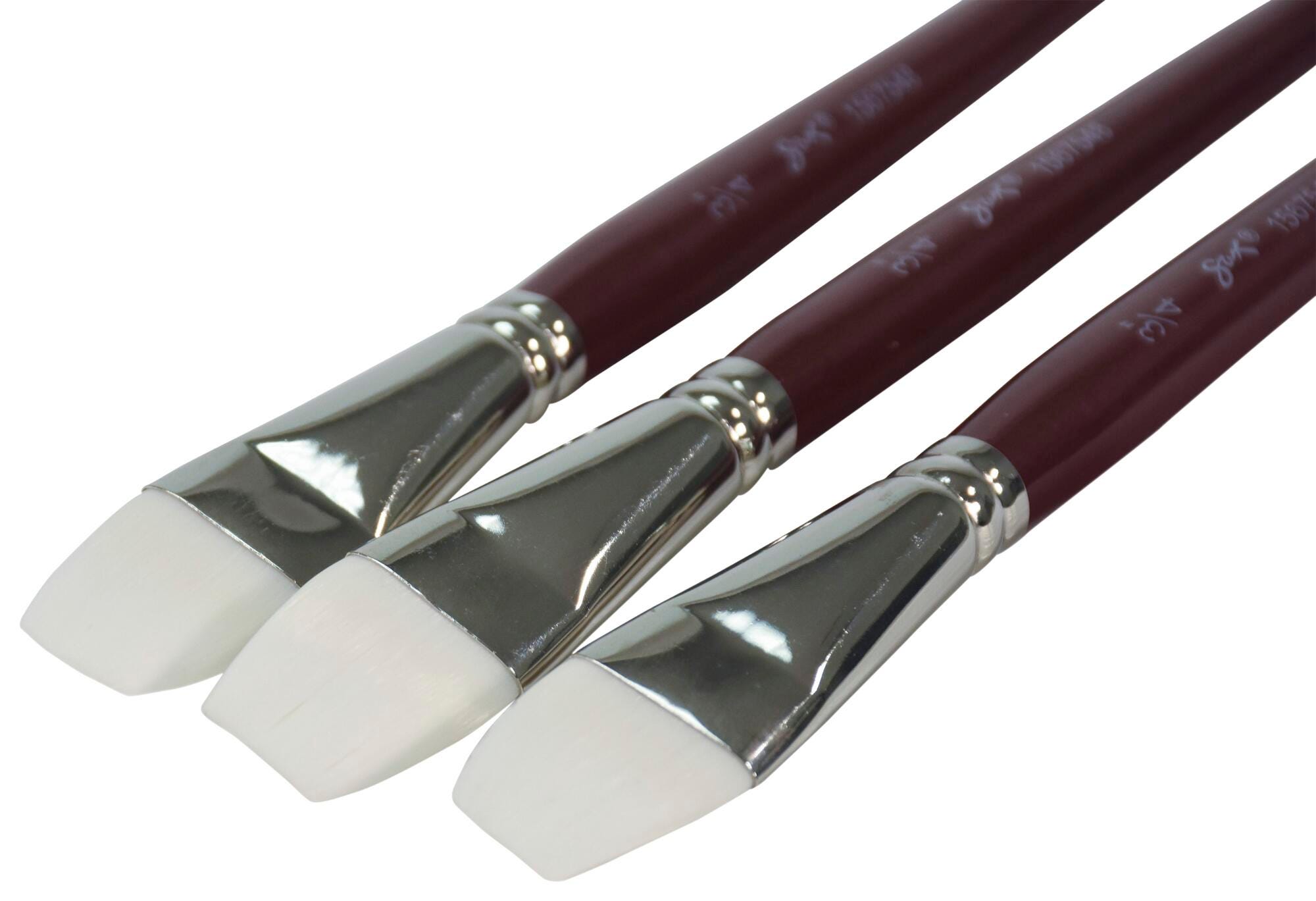 Sax Optimum white synthetic taklon paint brushes (size 3/4 inch) are durable, high-quality, and give you better control. Hand-crafted with white nylon taklon for clean brush strokes, the flat brushes come with short handles for better comfort when working close to artwork. Get predictable brush strokes every time with great color capacity, crisp edges, and sharp points on our synthetic brushes. The tip springs back even on rough watercolor paper. Our 3-pack of taklon brushes is perfect for all your crafting needs in the classroom or art studio. Use the paint set for oil, acrylic, and watercolor painting.Features
