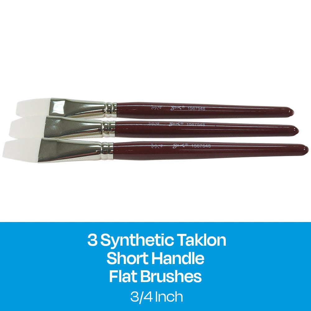 Sax Optimum white synthetic taklon paint brushes (size 3/4 inch) are durable, high-quality, and give you better control. Hand-crafted with white nylon taklon for clean brush strokes, the flat brushes come with short handles for better comfort when working close to artwork. Get predictable brush strokes every time with great color capacity, crisp edges, and sharp points on our synthetic brushes. The tip springs back even on rough watercolor paper. Our 3-pack of taklon brushes is perfect for all your crafting needs in the classroom or art studio. Use the paint set for oil, acrylic, and watercolor painting.