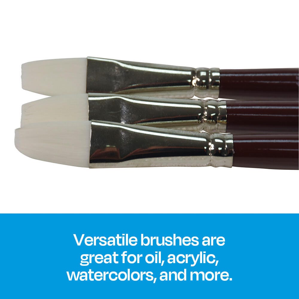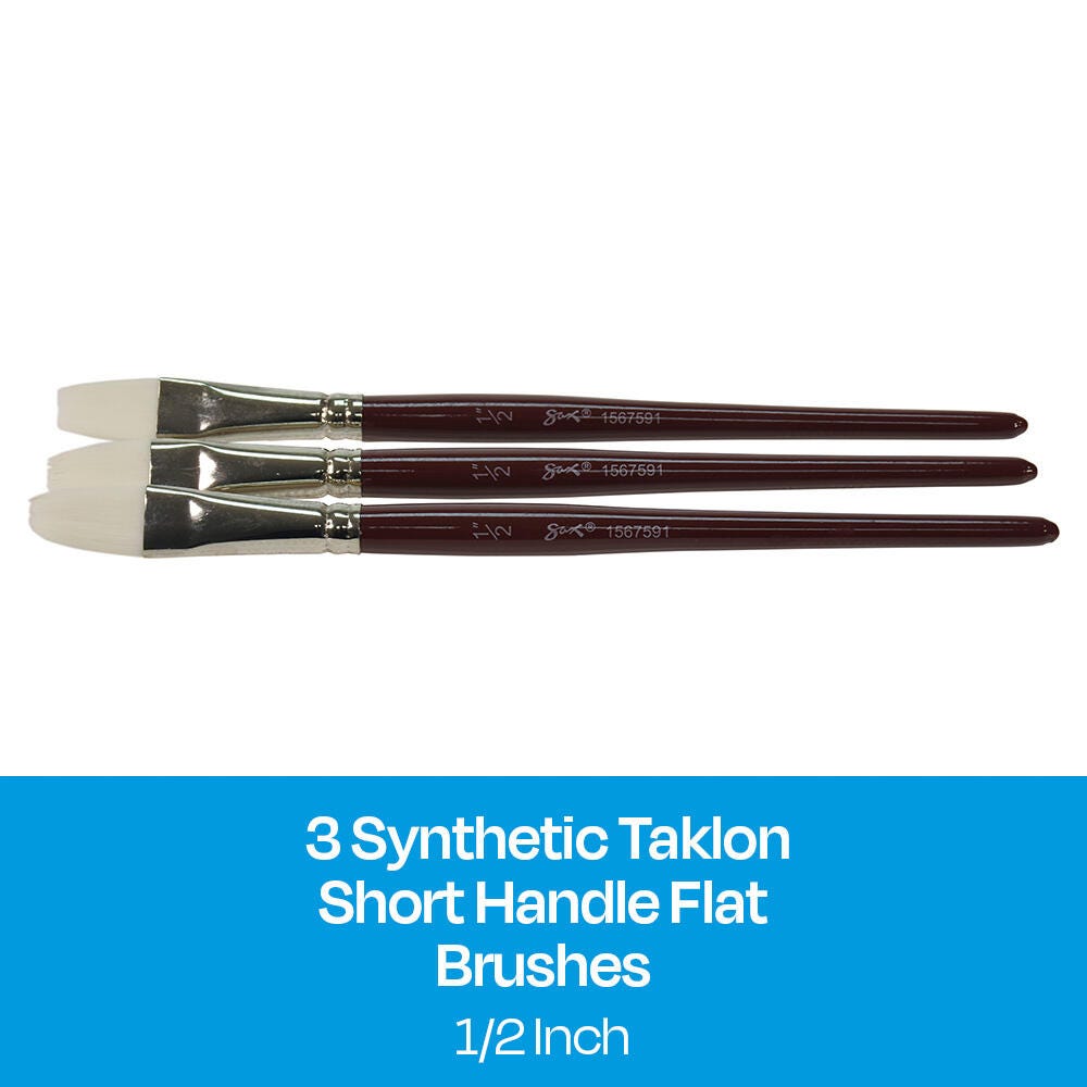 Sax Optimum white synthetic taklon paint brushes (size 1/2 inch) are durable, high-quality, and give you better control. Hand-crafted with white nylon taklon for clean brush strokes, the flat brushes come with short handles for better comfort when working close to artwork. Get predictable brush strokes every time with great color capacity, crisp edges, and sharp points on our synthetic brushes. The tip springs back even on rough watercolor paper. Our 3-pack of taklon brushes is perfect for all your crafting needs in the classroom or art studio. Use the paint set for oil, acrylic, and watercolor painting.