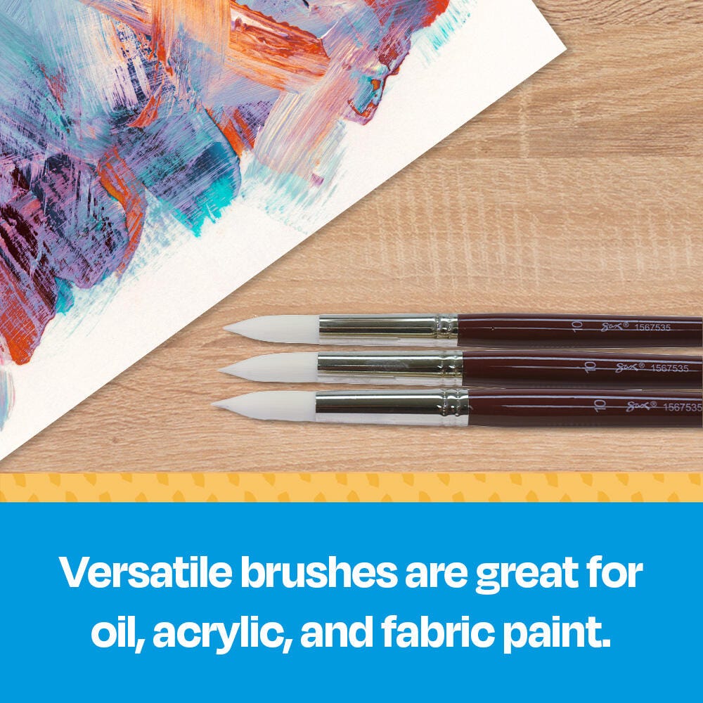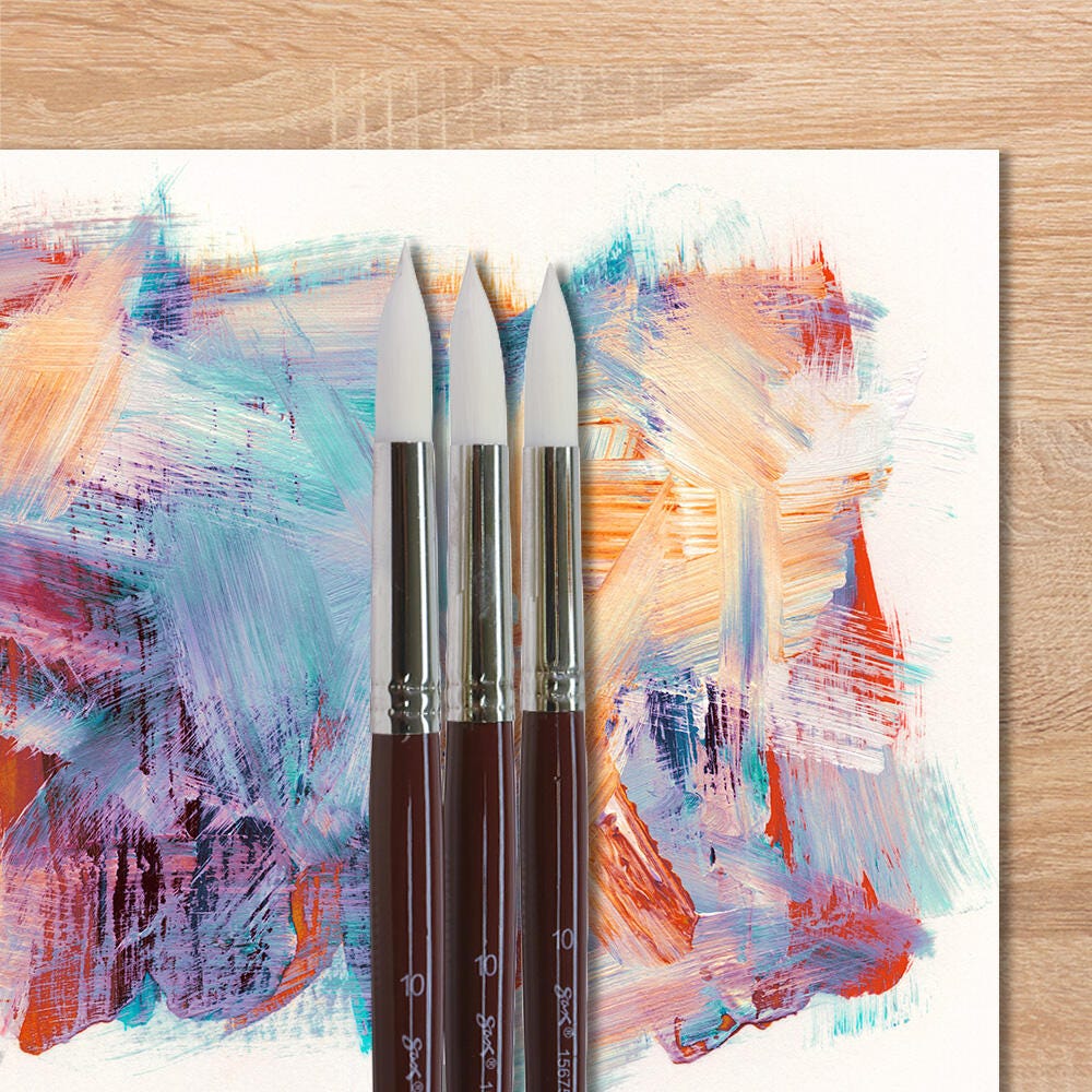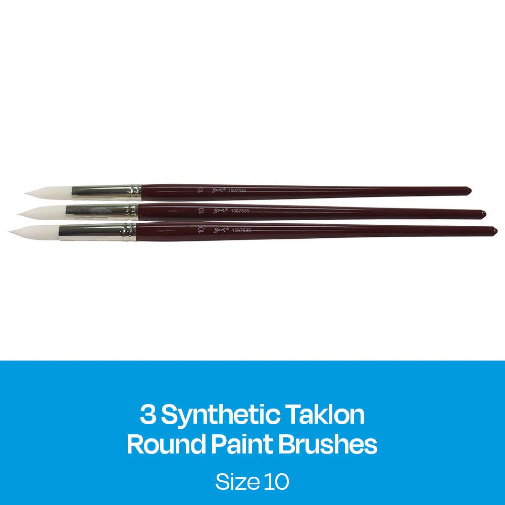 Sax optimum white synthetic taklon paint brushes (size 10) are durable, high-quality, and give you better control. Hand-crafted with white nylon taklon for clean brush strokes, the round brushes come with long handles for better comfort. The longer handle size allows for better control with easel painting. Get predictable brush strokes every time with great color capacity, crisp edges, and sharp points on our synthetic brushes. The tip springs back even on rough watercolor paper. Our 3-pack of taklon brushes is perfect for all of your crafting needs in the class or art studio. Use the paint set for oil, acrylic, and watercolor painting.