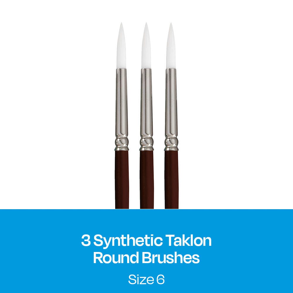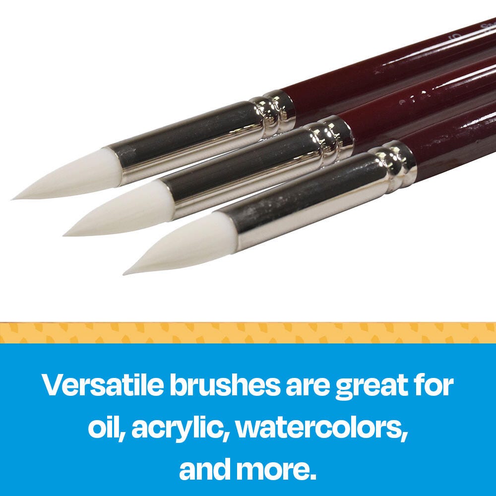 Sax optimum white synthetic taklon paint brushes (size 6) are durable, high-quality, and give you better control. Hand-crafted with white nylon taklon bristles for clean brush strokes, the round brushes come with long handles for better comfort. The longer handle size also allows for better control while painting on an easel. Get predictable brush strokes every time with great color capacity, crisp edges, and sharp points on our synthetic brushes. The tip springs back even on rough watercolor paper. Our 3-pack of taklon brushes is perfect for all of your crafting needs in the art class or studio. Use the paint set for oil, acrylic, and watercolor painting.