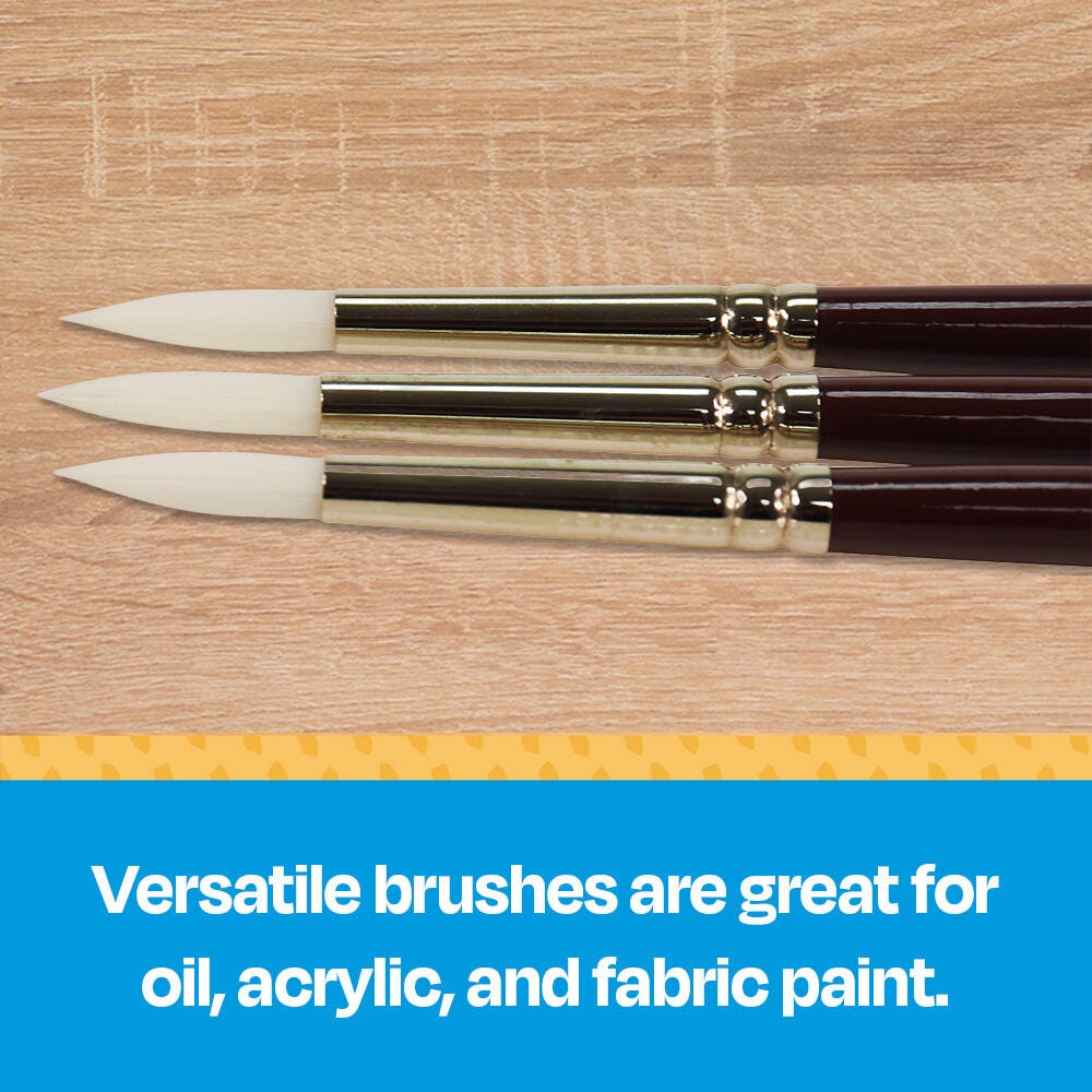 Sax white synthetic taklon paint brushes with short handles and round tips are durable, high-quality, and give you better control. They’re hand-crafted with white nylon taklon for clean brush strokes, and the short handle size allows for more precise, intricate brush strokes when working close to artwork. Get predictable brush strokes every time with great color capacity, crisp edges, and sharp points. The tip springs back even on rough watercolor paper. Our 6-pack of synthetic bristle brushes is perfect for all your crafting needs in the classroom or art studio. Use the size 8 brushes for detail, small spaces, and lines. White synthetic hair brushes are great with different mediums, including oil, acrylic, and watercolors.