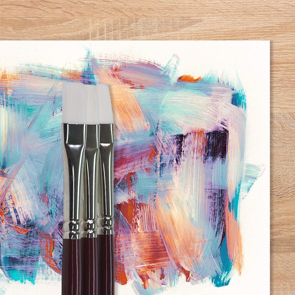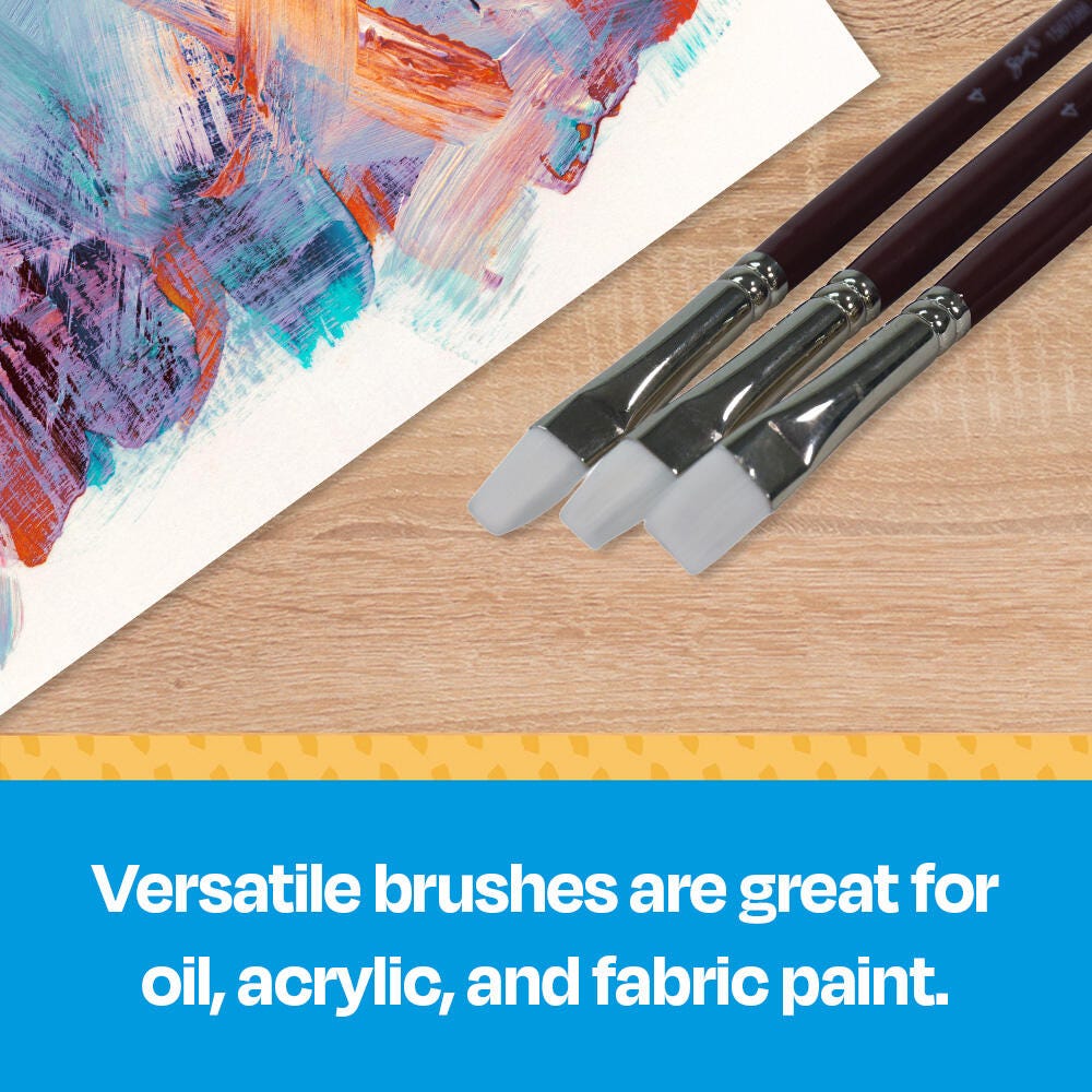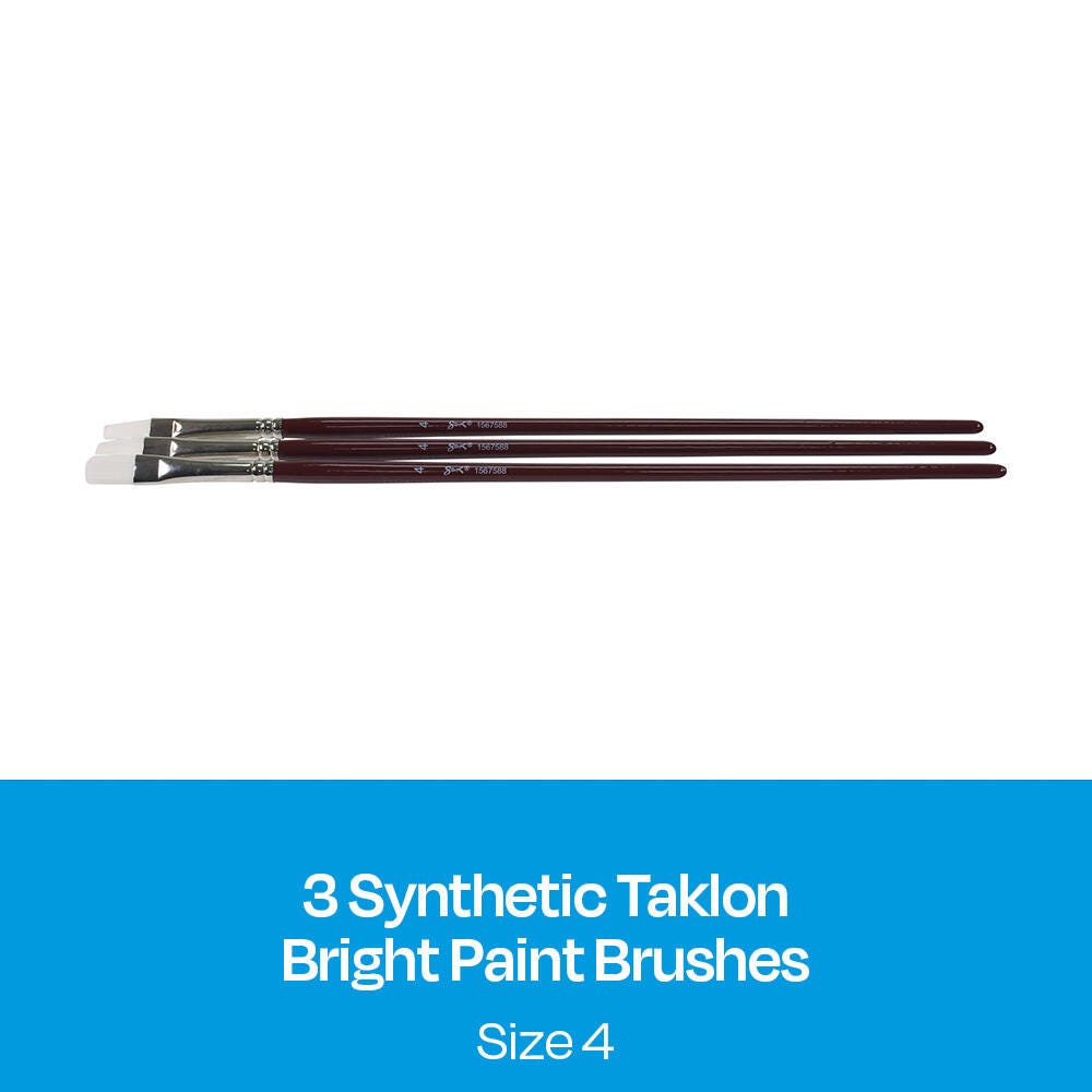 Sax white taklon paint brushes with long handles and bright tips (size 4) provide superb color holding, spring, sharp edges, and smooth application. Optimal brush strokes help students create their best projects while enhancing their painting techniques on different mediums. Our 3-pack of bright synthetic bristle brushes are great for dabbing, impressions, and controlled strokes. The flat brush is perfect for the classroom or art studio. Use the white nylon synthetic hair brushes with oil and acrylic paints.