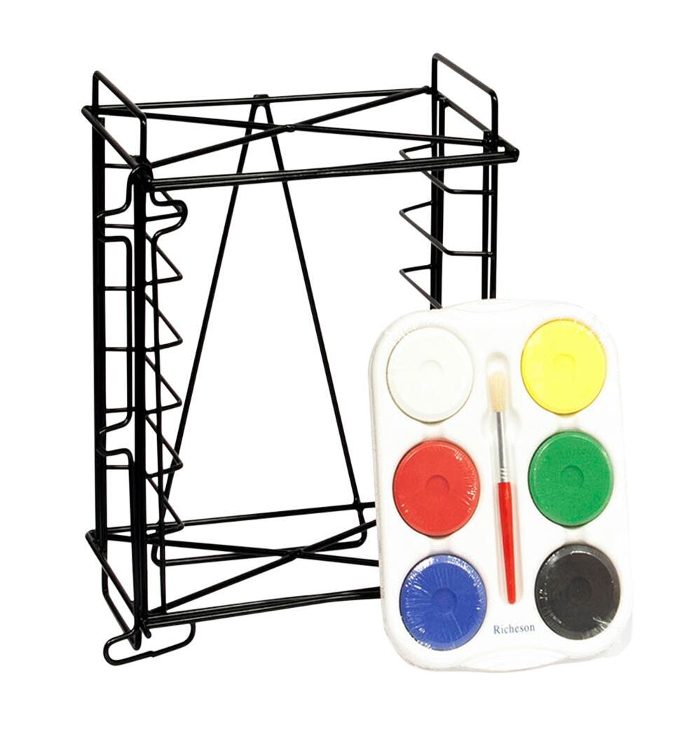 Description Jack Richeson 6 Well Palette Storage Rack measuring 10-3/8 in x 8-5/8 in x 10-1/2 in comes with 6 sets of non-toxic tempera cakes in Red, Blue, Yellow, Green, Black and White. Rack also includes 6 brushes.Features Sold as a Rack and Set of 6 Palette Trays Ideal set includes storage rack with six well palettes Palettes come with assorted tempera cakes Makes for convenient storage Ideal for the classroom or a large group setting