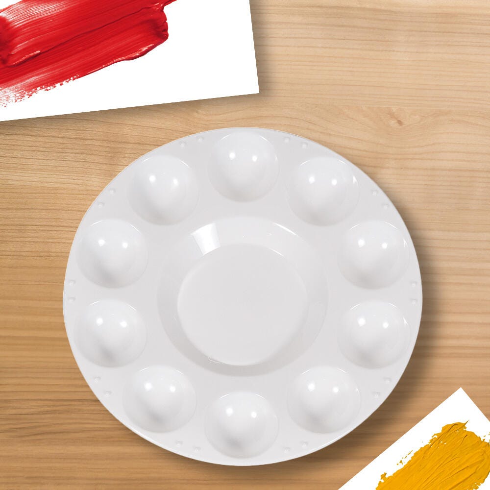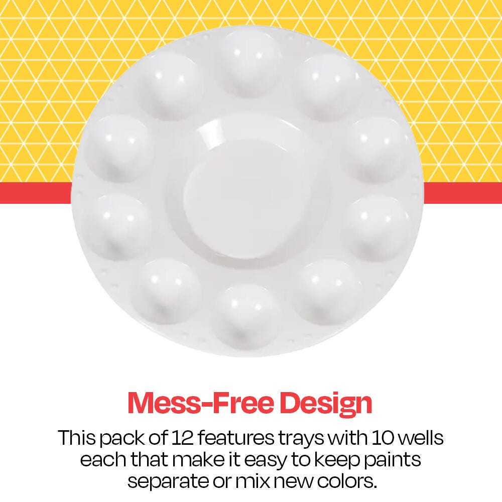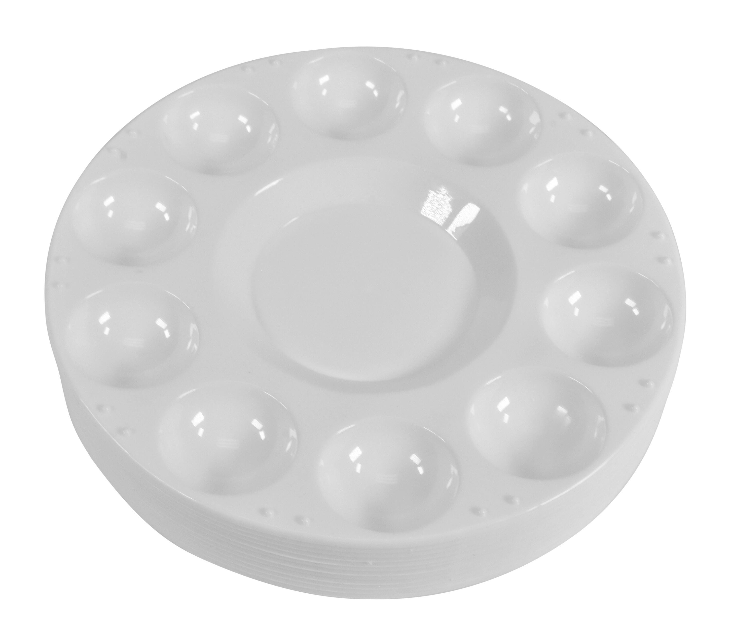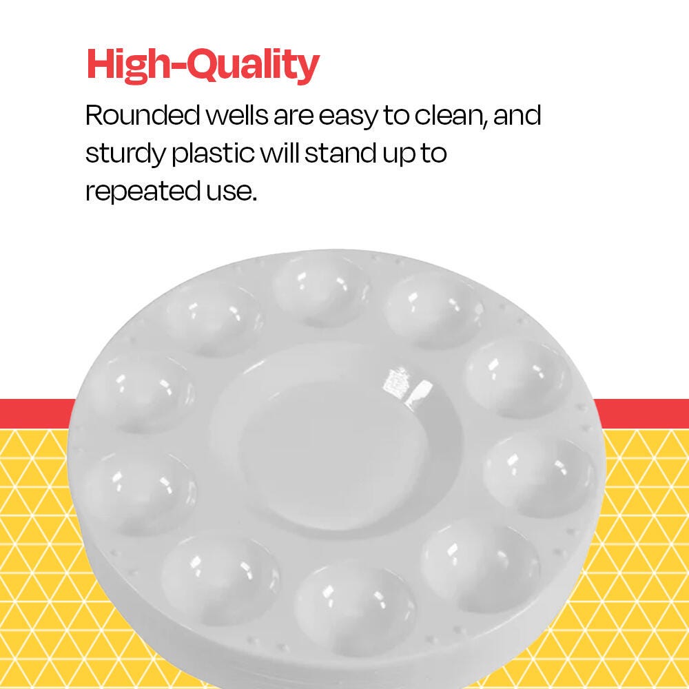 Description School Smart paint palette trays with 10 mixing wells are great for classroom or home use. The value set includes 12 palettes in a convenient design. Each white plastic paint tray measures 7 inches in diameter. The large center well measures 2-1/2 inches with a 5/16 inch depth. The small outer well diameter is 1-3/8 inches with a 7/16 inch depth. Palette lids are sold separately.Features The paint pan helps keep your paints separate and easy to access so you can mix new colors with ease A handy palette design is easy to grip in hands or keep on flat surfaces No sharp corners on the paint palettes helps ensure safety and use for all ages and abilities New paint color combinations are easy to mix within the 10 separate wells Our round paint palette set is perfect for classroom, studio, and recreation center use Plastic tray covers are sold separately to prevent paint from drying out Economically priced to fit classroom budgets