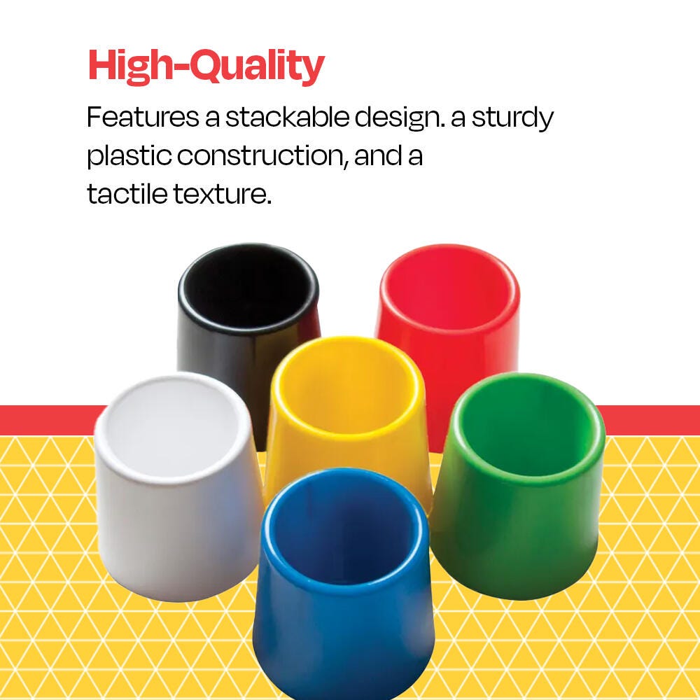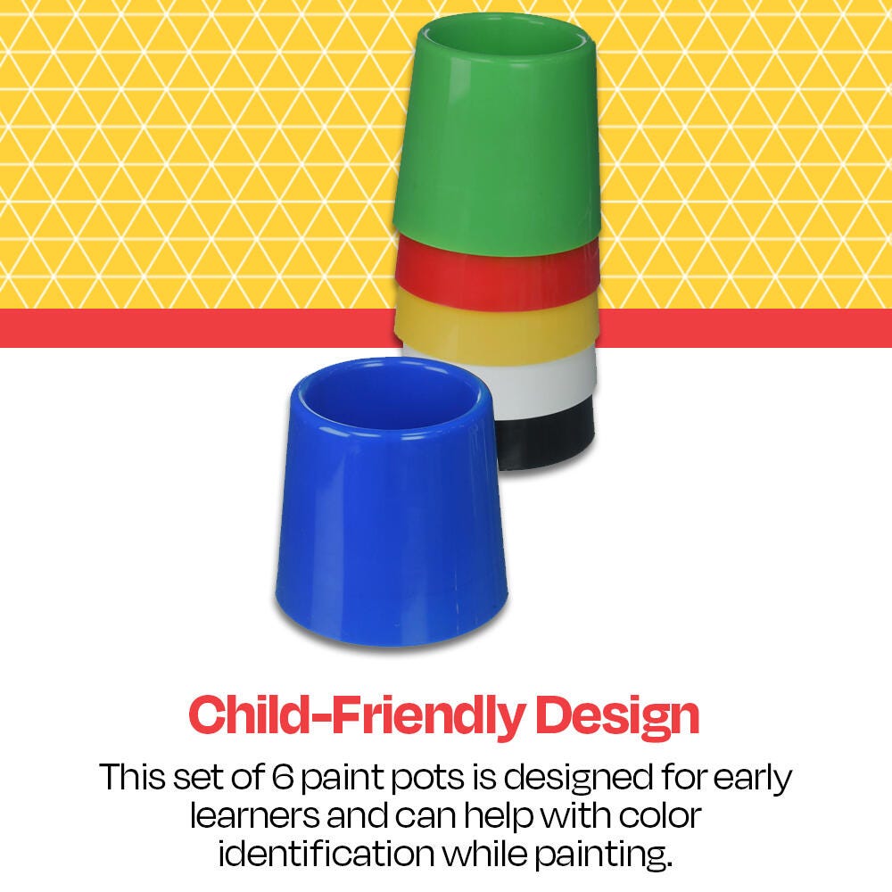 Description The School Smart paint brush water pot set comes in 6 different colors and a stackable design. Our stable water pot set is designed for early childhood development and the containers are made of sturdy plastic. Pots can be used to reinforce color identification skills with students in addition to holding paint.Features The stackable water pot set comes with 6 cups Each water pot for paint brushes measures 4-3/4 D x 3-1/2 H inches These water pots for painting have a stimulating tactile texture Use the plastic water containers for painting or other activities Students can practice identifying colors, stacking, and sorting as well Recommended for all ages