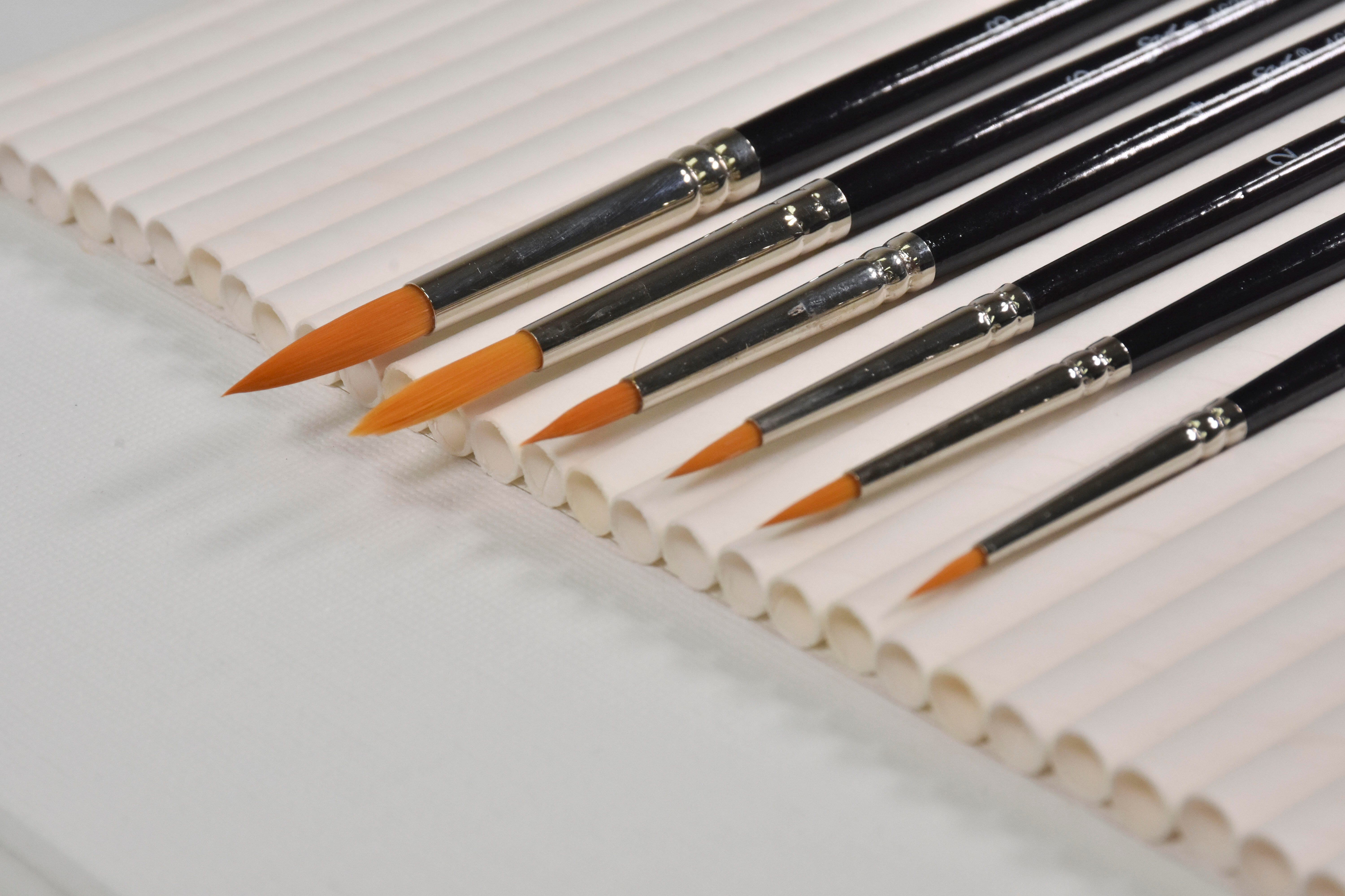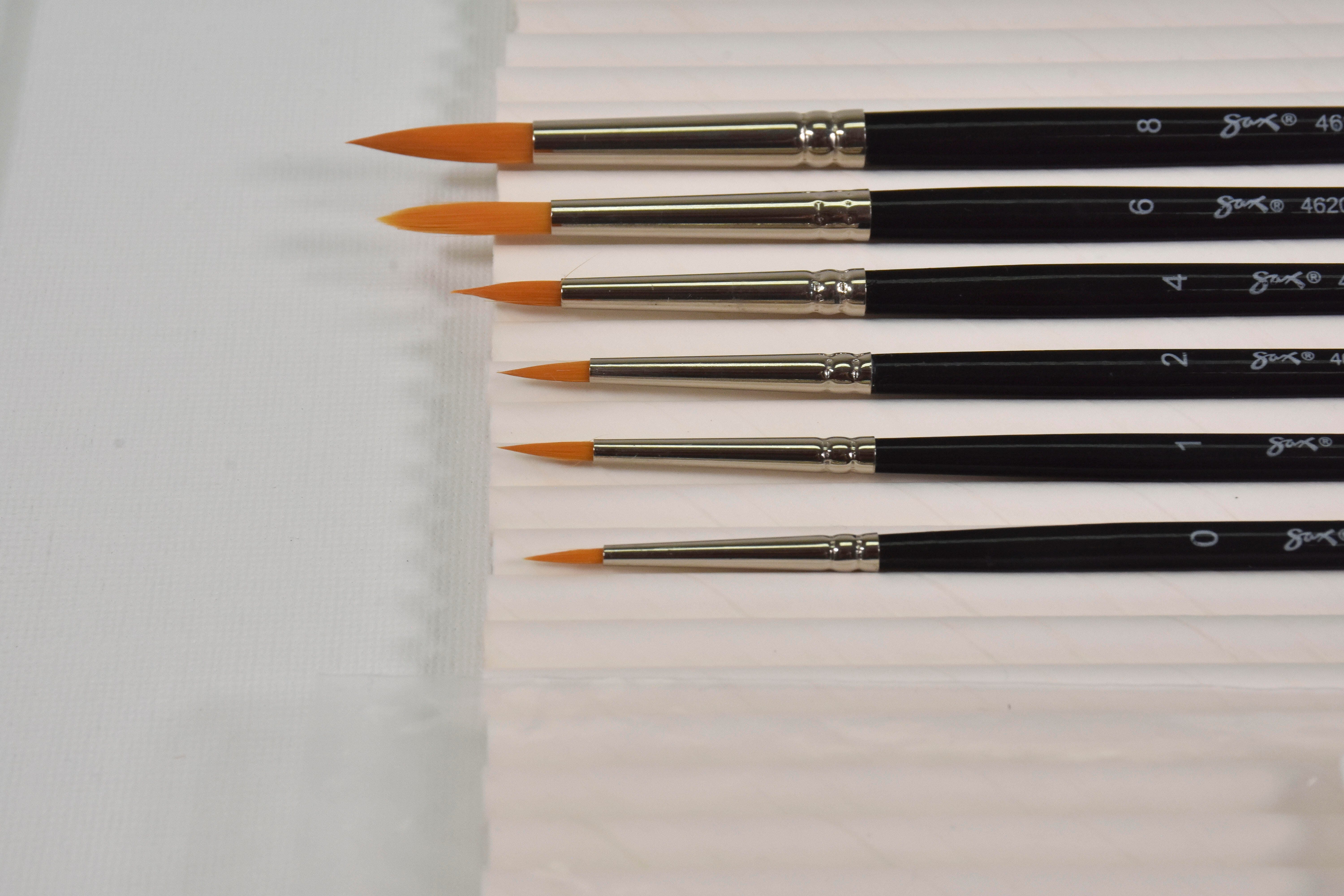 These Sax golden taklon watercolor paint brushes come in assorted sizes. The synthetic brushes feature short handles for better comfort and control. Each lacquered hardwood handle has nickel-plated, seamless aluminum ferrules for long-lasting durability. Choose the responsive round brush design for all watercolor techniques and painting surfaces. Use the 6-pack in the classroom, art studio, or home.