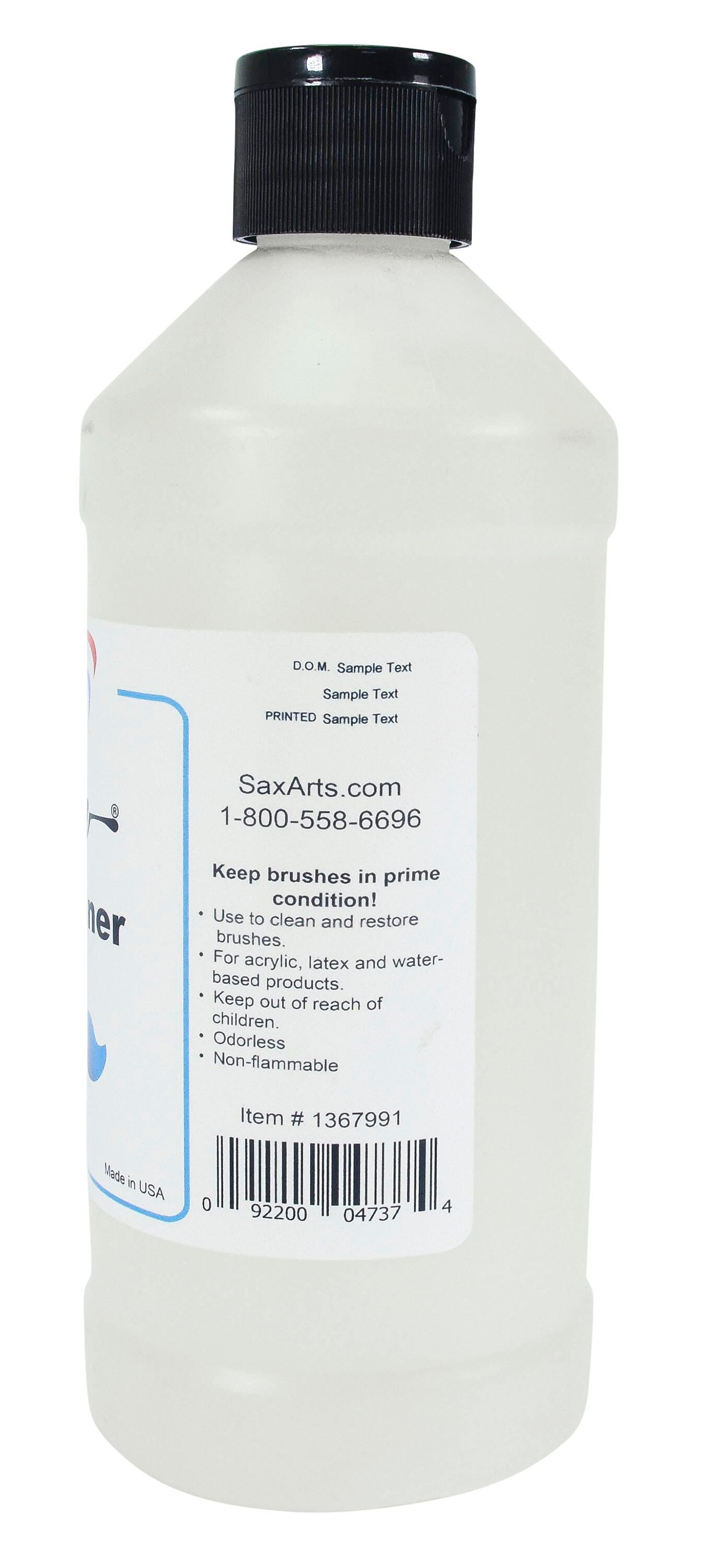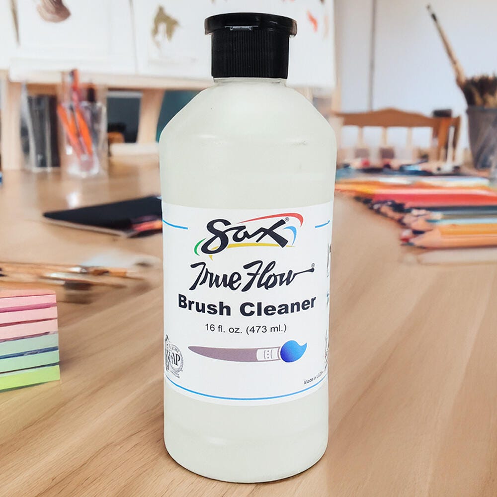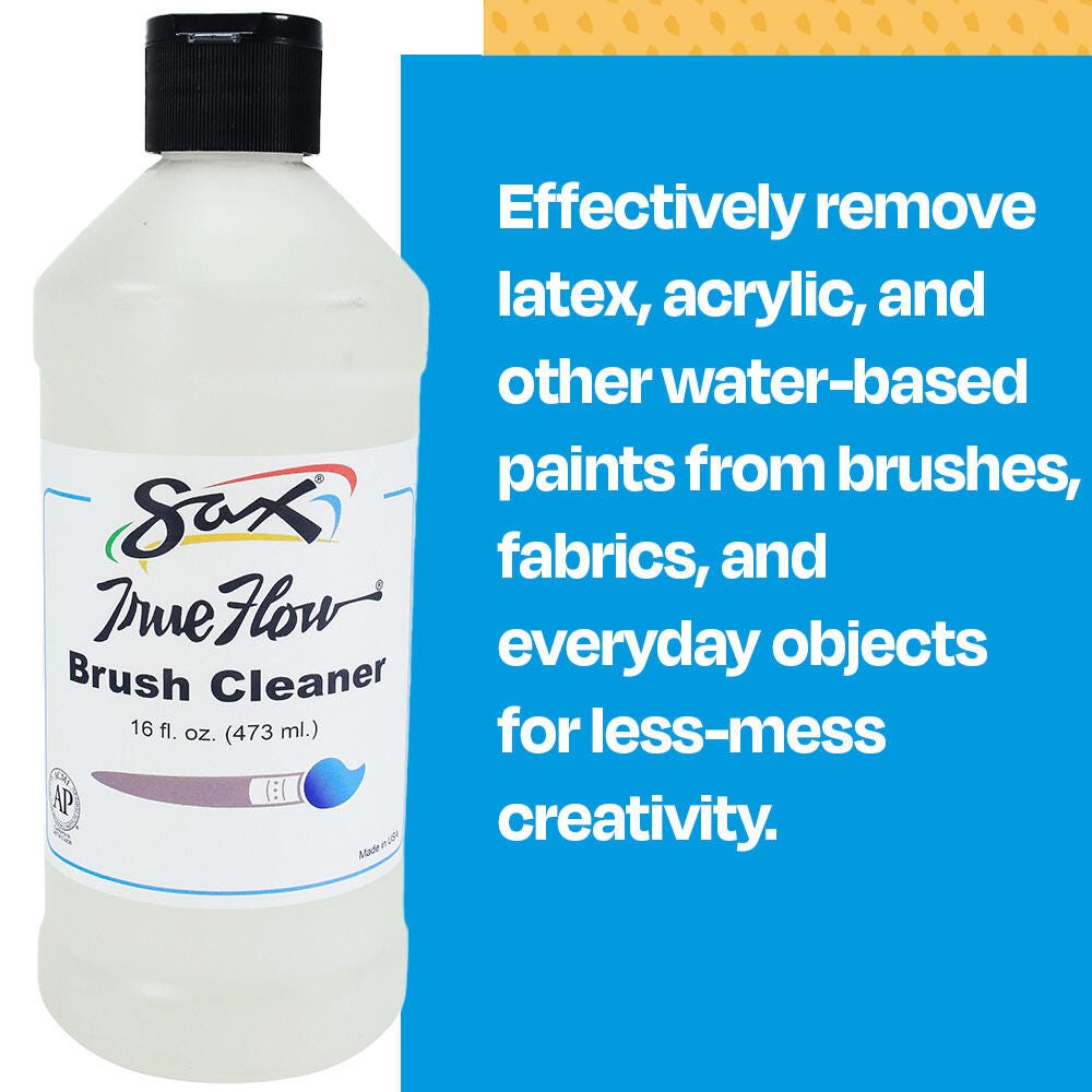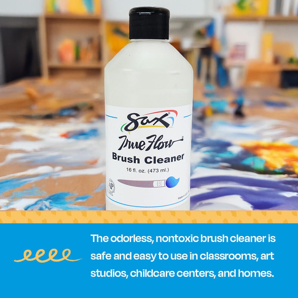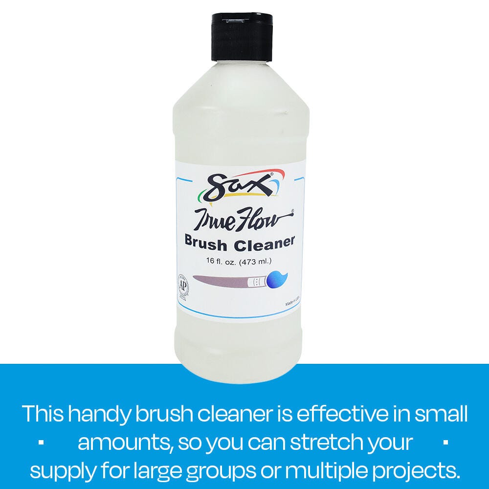 Go beyond soap and water with the ultra-effective power of the Sax® True Flow Brush Cleaner. This solution is used to clean and restore brushes to keep them in prime condition, looking like new, and extract pesky dirt and oils. It is ideal for use with acrylic, latex, and other water-based products or media and leaves no greasy residue after use. The cleaner is also effective in removing paint or other media marks from most fabrics or everyday objects. This cleaner comes in a 1-pint (16 fluid ounce) container. Keep out of reach of children. AP certified. Nontoxic.