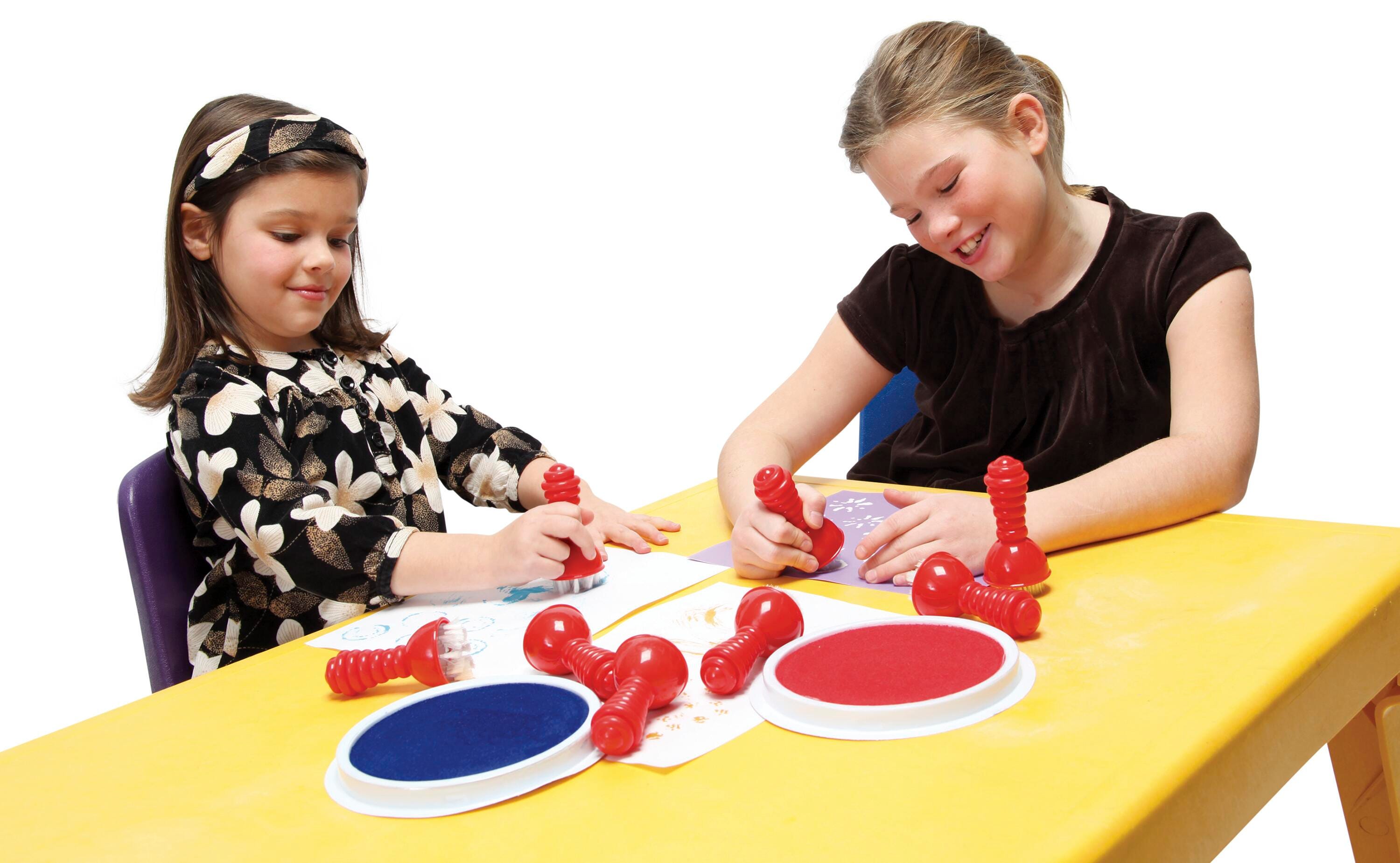 Ready2Learn Creative Design Brush Set includes 4 unique patterned brush designs to create tremendous art work with each dab or twist. Tools feature a durable plastic handle for convenient usage and is perfect for children to bring out their creativity beyond imagination. Patterns included are 3 rows of concentric circles, a burst, 5 clusters of 5 dots and 2 rows of concentric circles. Sold as 4 per set.