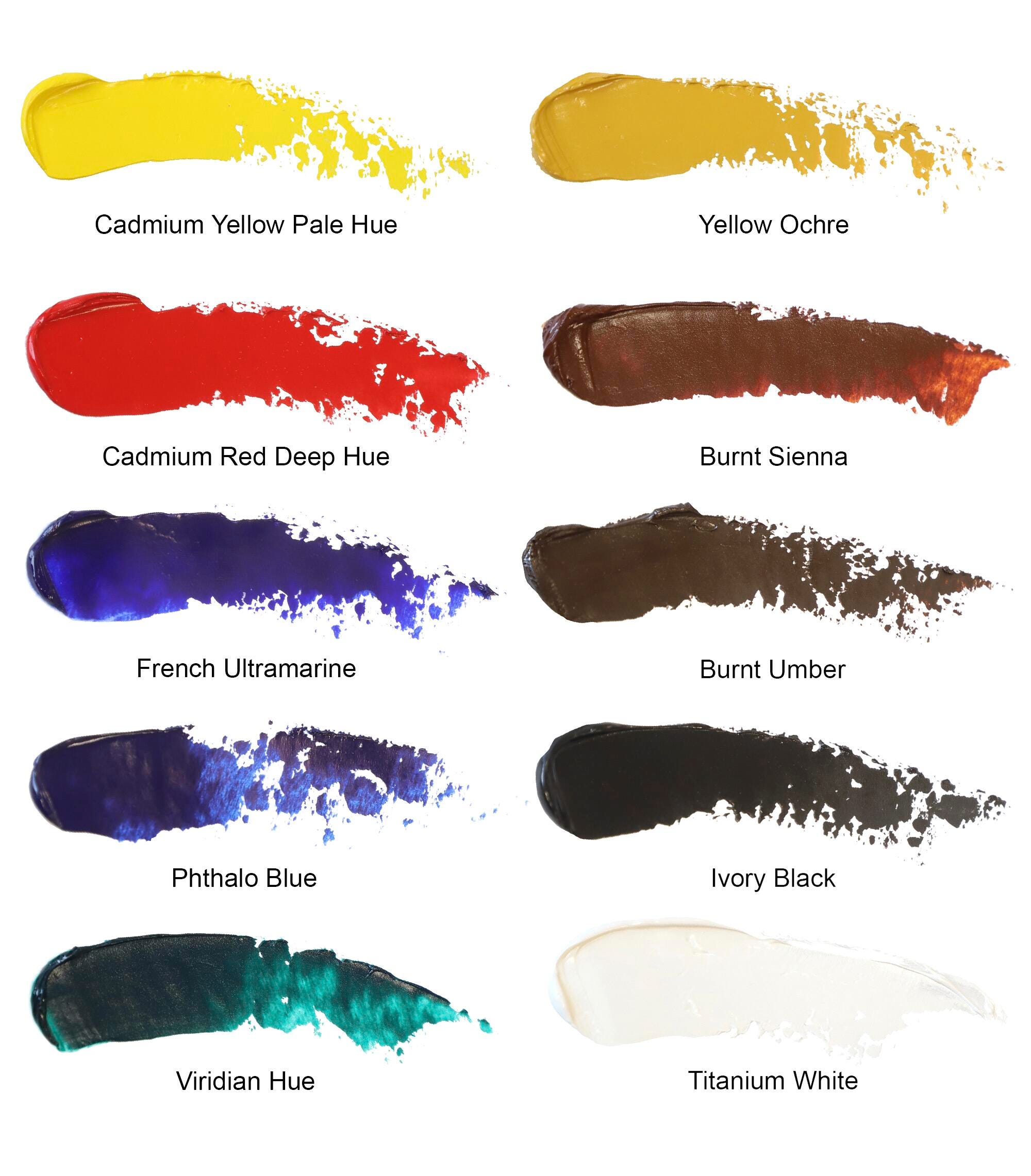 - Cadmium Yellow Pale Hue, Cadmium Red Deep Hue, French Ultramarine, Phthalo Blue, Burnt Umber, Viridian Hue, Yellow Ochre, Burnt Siena, Ivory Black, Titanium White.