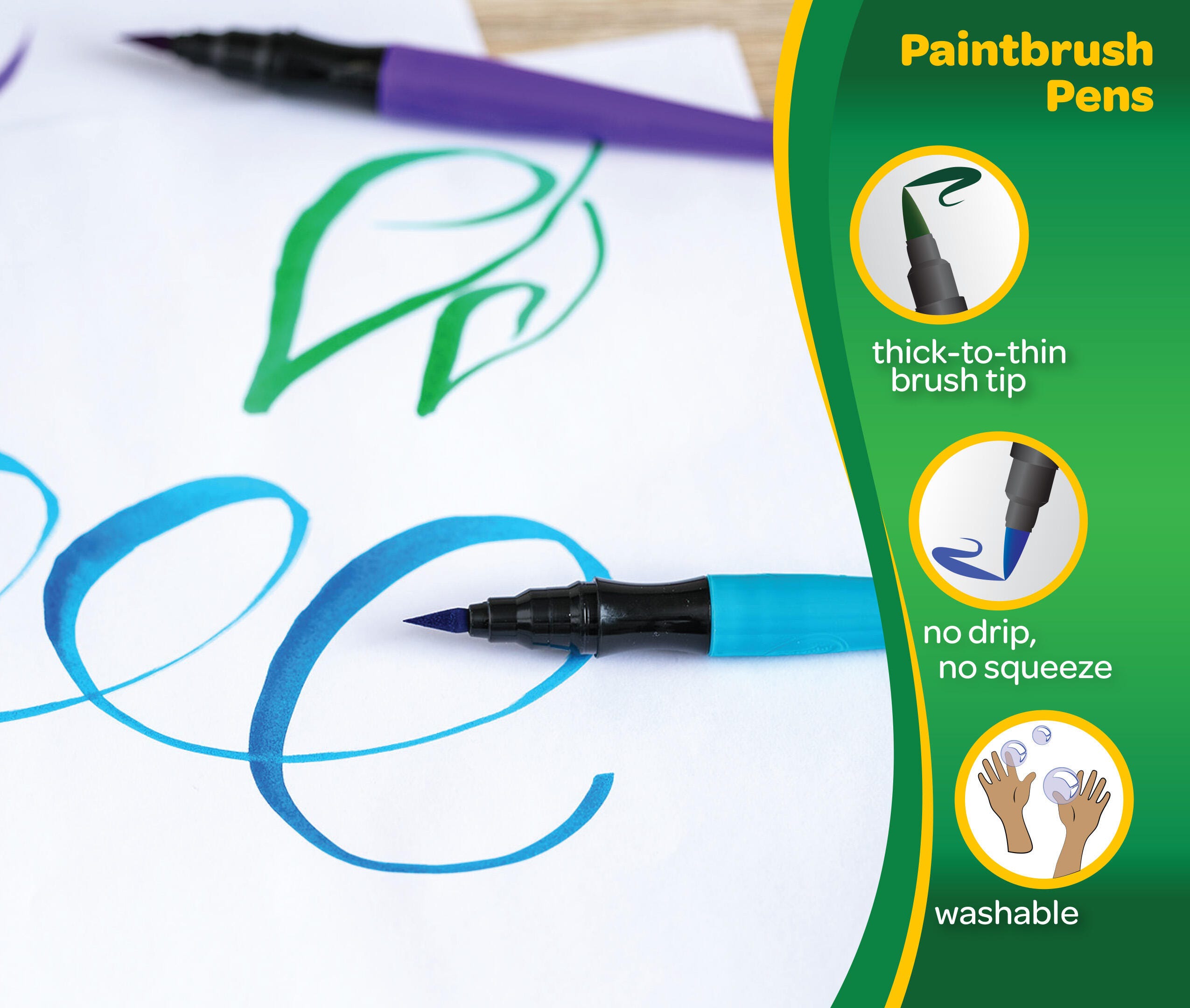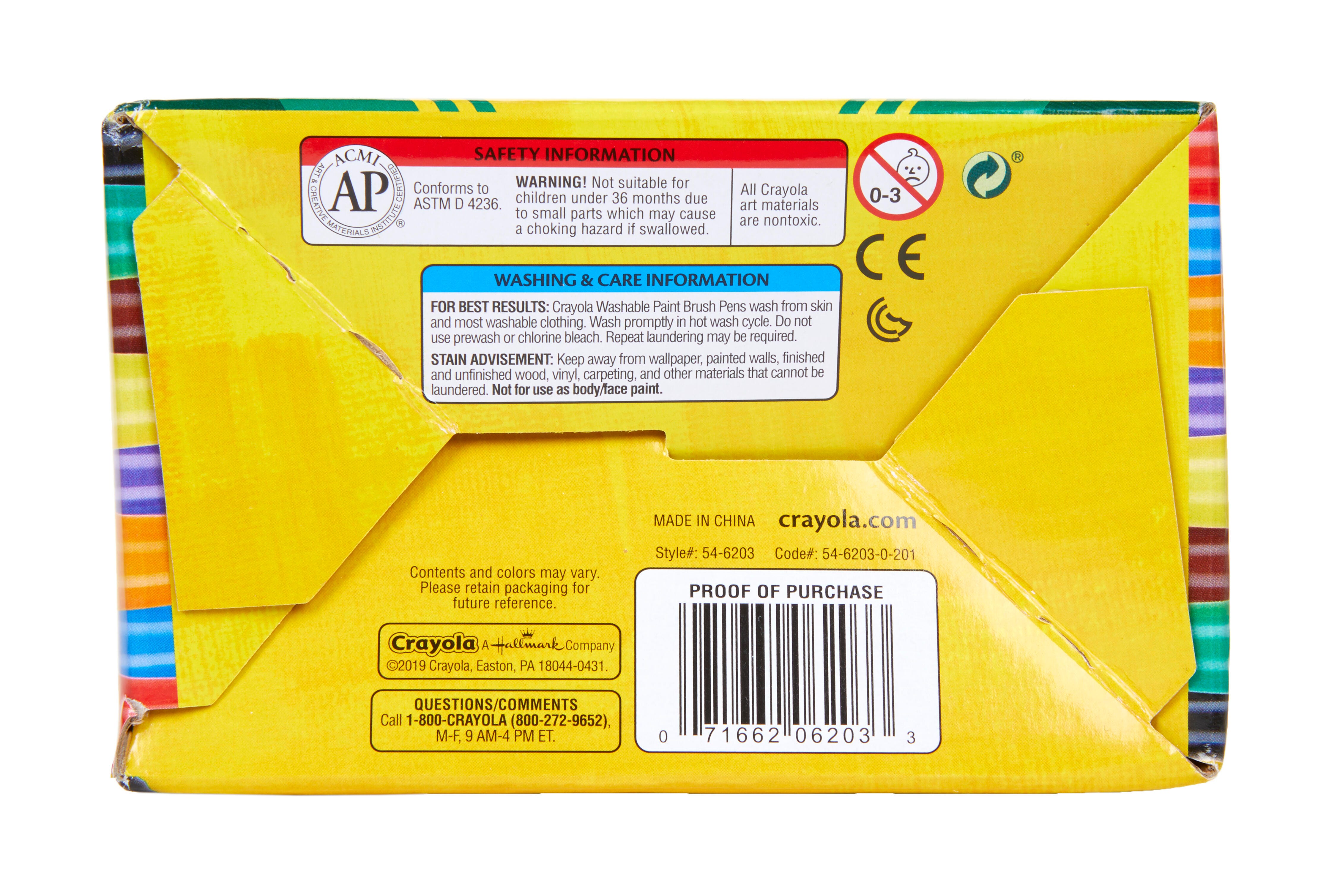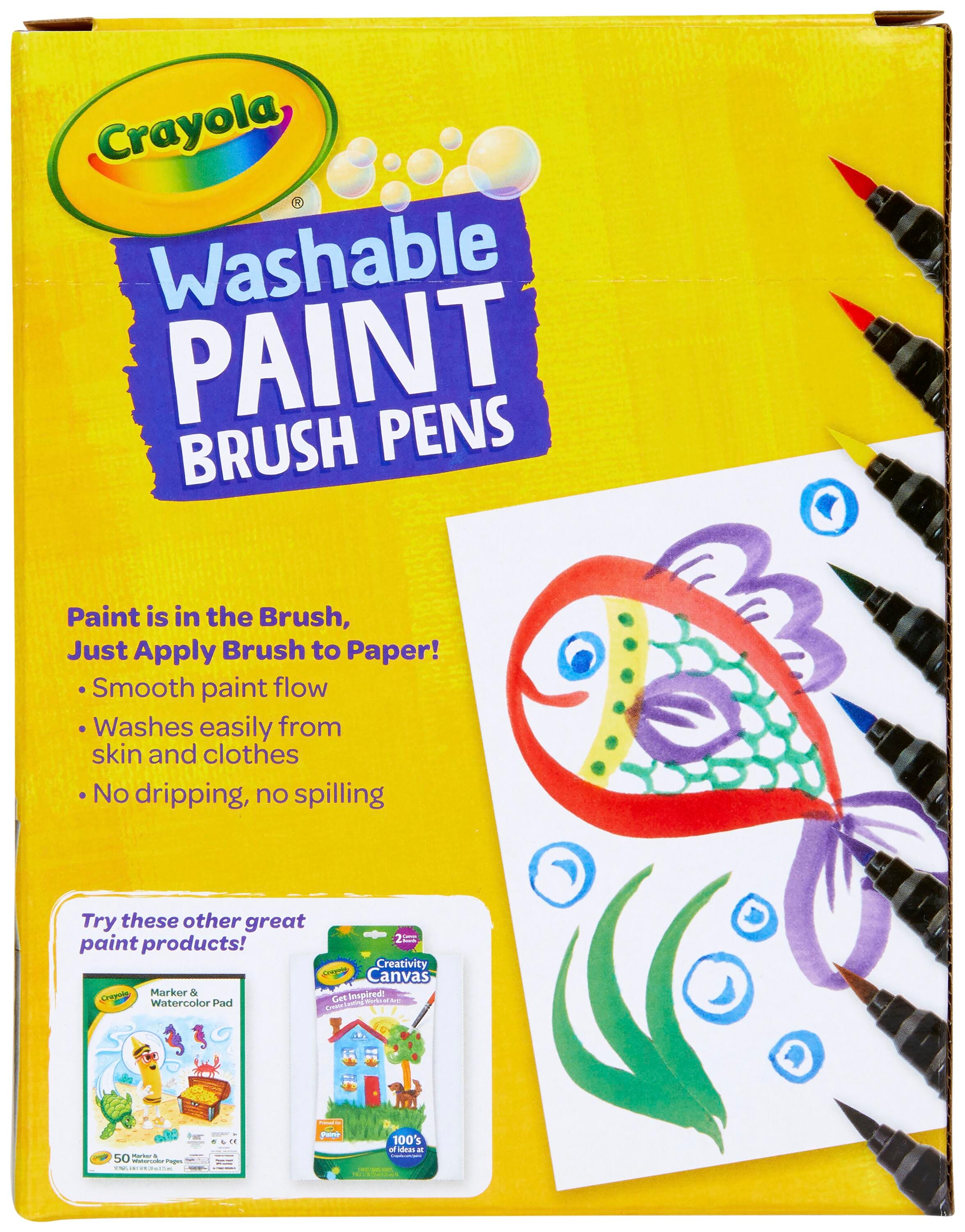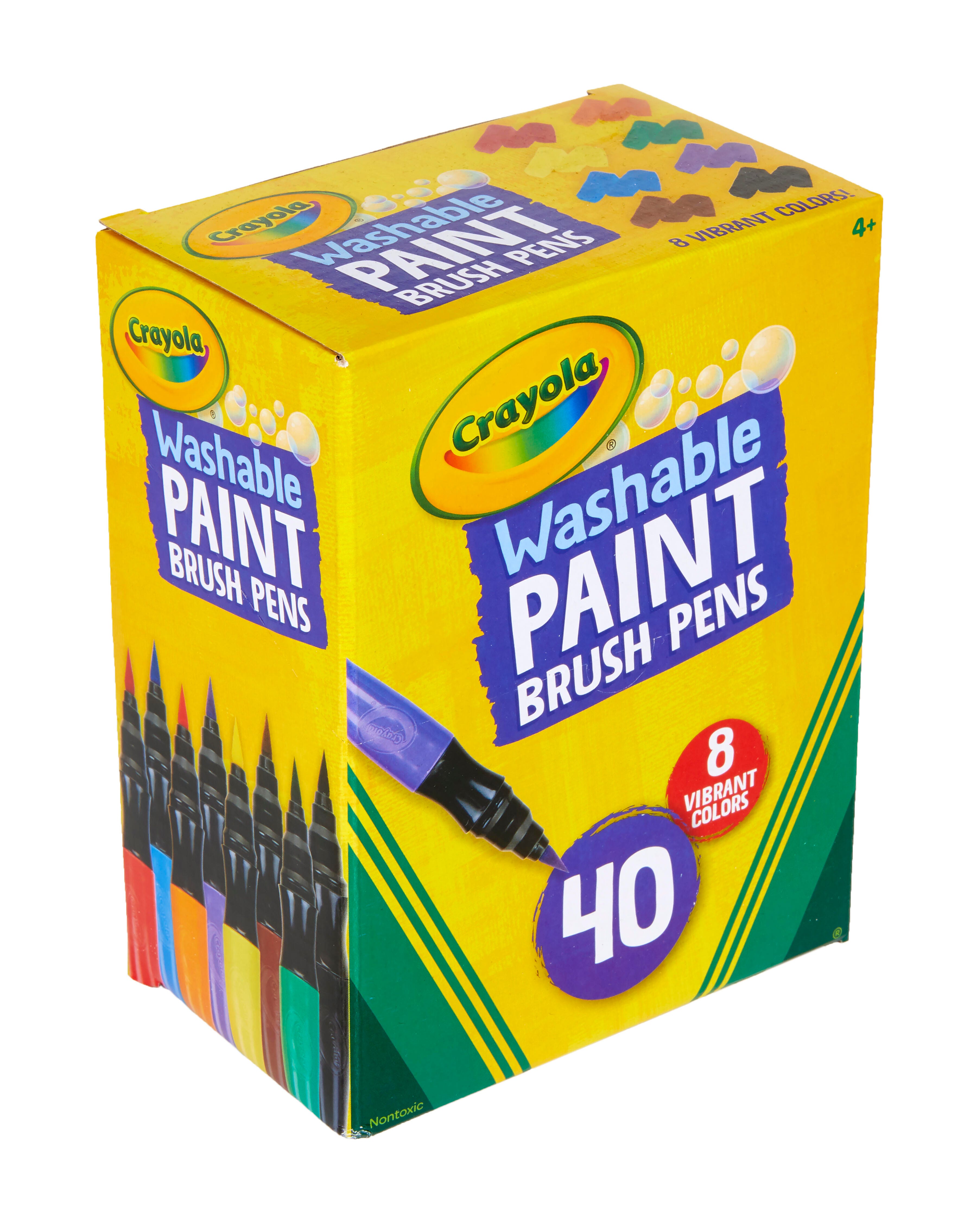 Description Paint. . .with a pen! Crayola's Paint Brush Pens give you the best of both worlds, offering the popular Washable Paint everyone loves equipped in a streamlined pen. This means no messy paint brushes and paint that washes easily from skin and almost all clothing using simple soap and water. The fine tip is flexible and glides across paper to provide smooth strokes in vibrant color. This pack includes 40 pens, 5 each of the following colors: red, orange, yellow, green, blue, brown, and black.Features Washable paint pens contain paint that is ready to create vibrant strokes with no dipping or spilling Fine tips provide the easy control of a pen for detail work and blending, while still providing rich and varied marks Washable paint formula comes out easily from skin and most fabric and clothing for mess-free, stress-free use Bold colors can be mixed and blended to create your own shade A fun and cleaner alternative to splatter-prone paints for use in early childhood environments, classrooms, recreation centers, summer camps, calligraphy and handwriting books, and beyond AP certified non-toxic for safe use in any setting Recommended for ages 5 and up