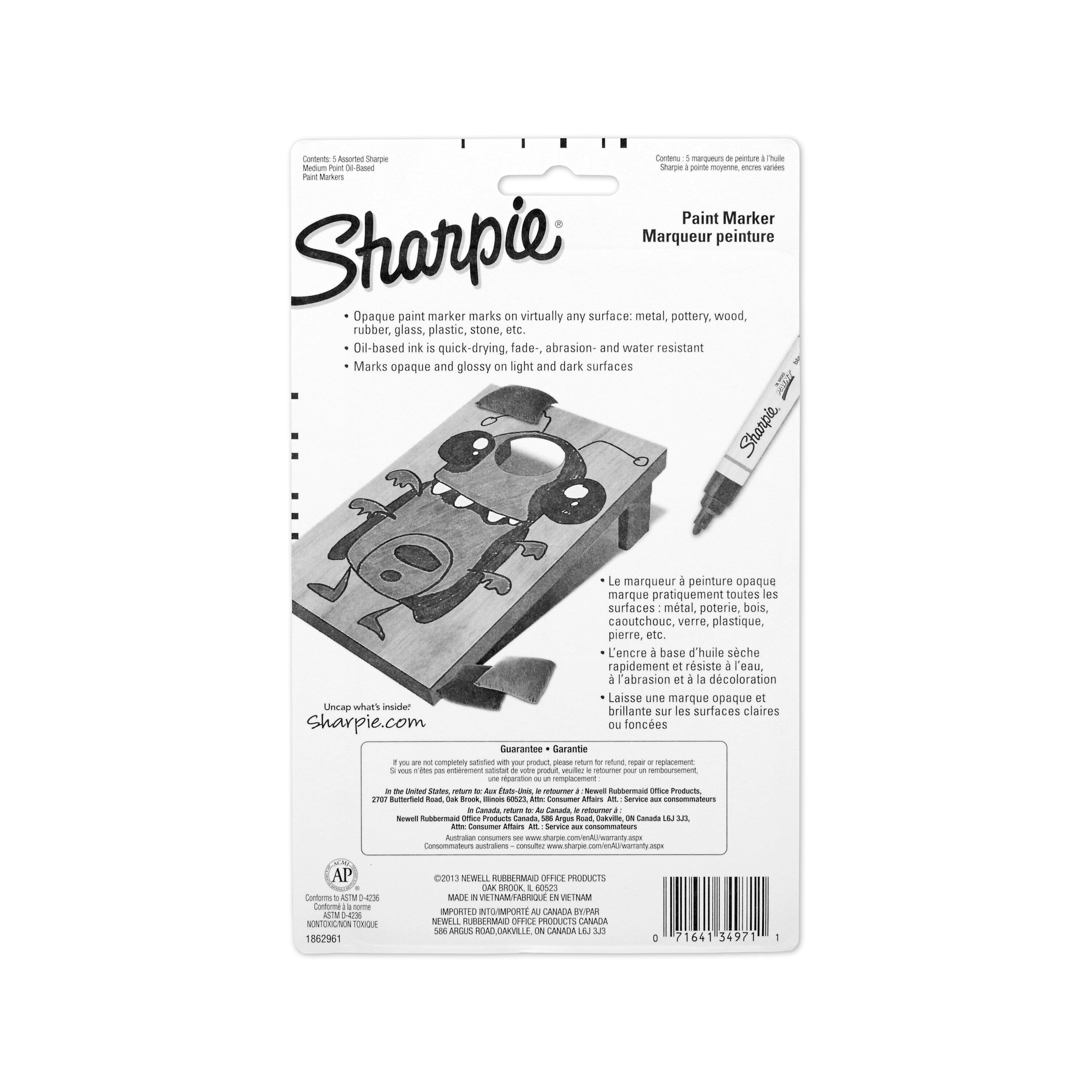 Description Sharpie Oil-Based Paint Markers inspire you to create in vivid colors. Featuring a durable medium tip that leaves bold, opaque marks that stand out on any surface. The quality oil-based paint is specially formulated to last and resists abrasions, water, and fading. This set of 5 paint markers includes the following colors: black, white, red, yellow, and blue.Features Quick-drying paint prevents smudges for clean application Bold and opaque marks stand out on light, dark, and glossy surfaces Formulated to be easily removed from glass, great for themed window or mirror decorations Ideal for a wide variety of arts and crafts inside and outdoors AP Certified Xylene free Includes: 5 Oil-Based Paint Markers