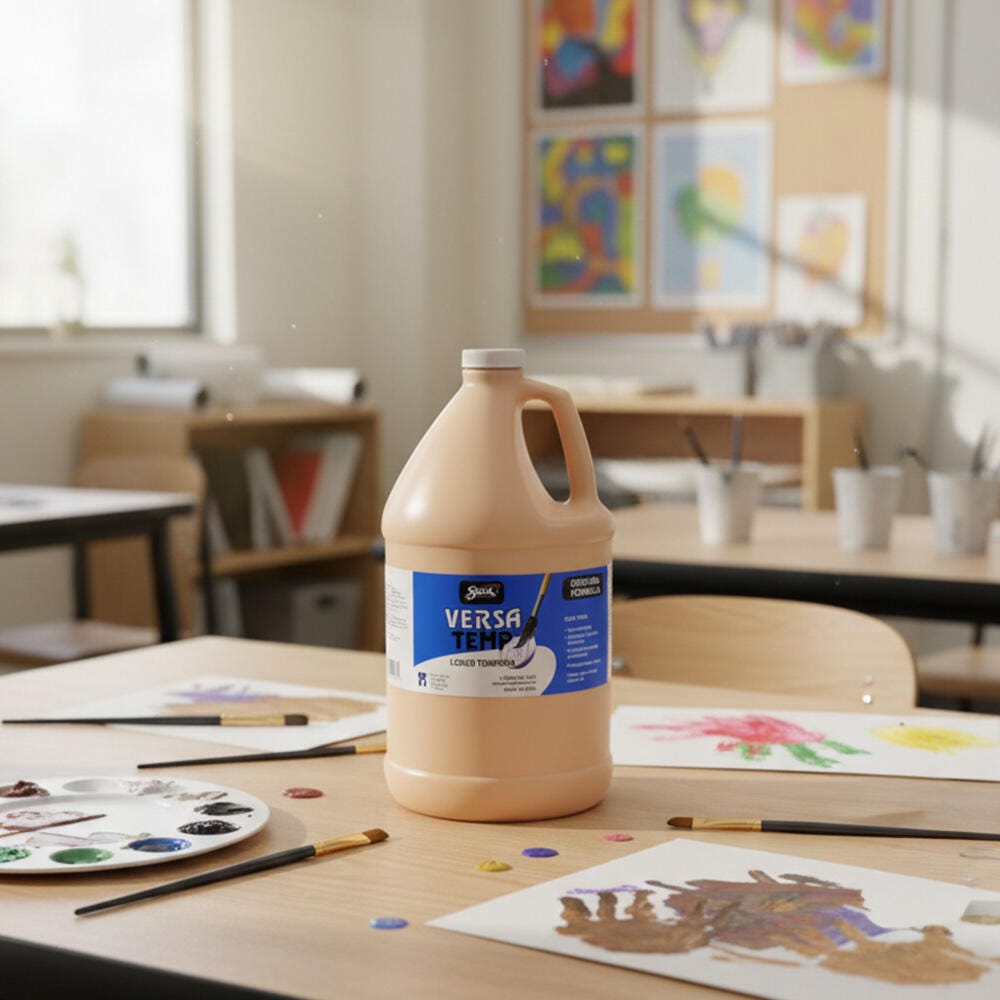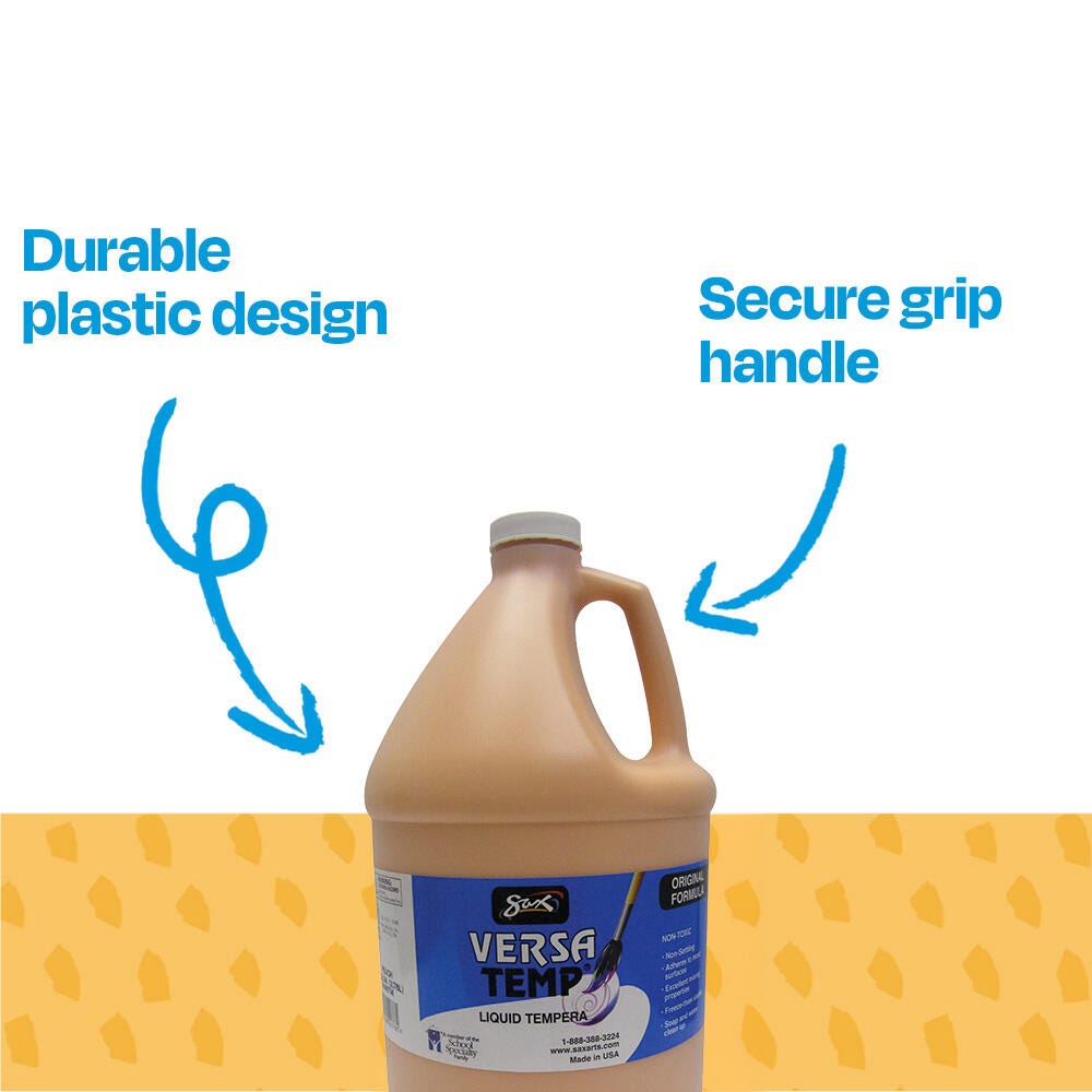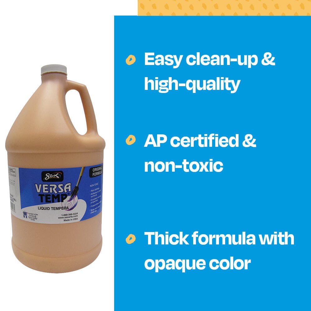 Description Sax Versatemp heavy-bodied tempera paint in peach produces bold, vibrant results. Foster creativity with a paint that resists cracking and chipping. The large gallon bottle is easy to pour and store, and is perfect for sharing in the classroom. Complete art projects, posters, and signs that stand out with one shade or craft new hues by mixing. The heavy formula is easy to apply and mix.